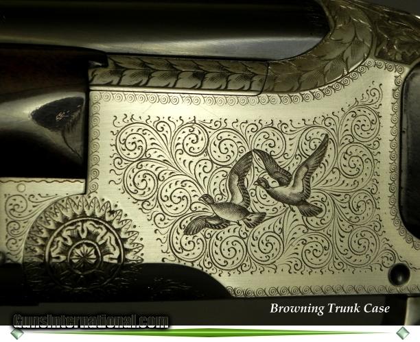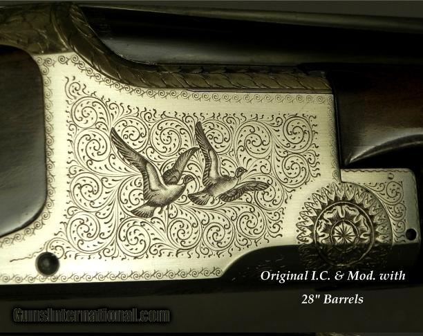 Description: #1754 V72, Browning Belgium Pigeon Grade 20 Bore with 28" Barrels & Factory Choked Imp.Cyl. & Mod., Square Knob Long Tang Pistol Grip Stock Made in 1972 with 28" Vent Rib barrels at .626 .007 & .019" (Imp.Cyl. & Imp.Mod.), Factory marked Imp.Cyl. & Mod., Factory 3" chambers, Single selective trigger, 14 3/8 x 1 3/8 x 2 1/8" over a 1" pad, 6 lbs. 6 oz., Very nice wood for a Pigeon Grade and it is as good as a lot of Diana Grade guns, The barrels with original blue at 98%, The receiver gray at 98%, The original wood finish at 97%, The checkering at 97%, The Gold plating on the trigger face is 100%, The bores are as new, This piece remains tight as a tick and I would put the mechanical life left at 99%. It is cased in the typical Browning trunk that remains in excellent condition. SOLD |