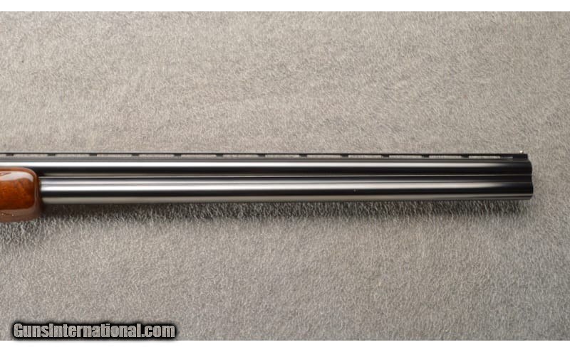 Description: 1966 Belgium Browning Superposed O/U shotgun chambered for 3", 20 gauge shells. This example has 28" vent rib barrels with ejectors and fixed chokes "Top * - FULL" and "Bottom ** - MOD". The front sight is a silver bead in a base at the front of the rib. The bottom of the receiver is marked "BROWNING" and the sides of the receiver are a Grade I engraving. This gun also has a manual top tang safety / barrel selector. The stocks are two-piece checkered walnut with a round knob pistol grip, fluted straight comb, and a ventilated White Line Pachmayr recoil pad. Stock measurements "DC - 1 1/2", DH - 2 1/8", and about a 1/4" cast for a right-hand person. This also come with the factory box and no instruction manual. 28 Gauge SOLD Chambers: 3" chambers. Metal Condition: "98% or better remaining, showing minimal wear. Wood Condition: 95% + remaining with a few light scattered marks on the sides of stock and on the belly. All are minor marks. Bore Condition: Perfect bright bores. Barrels: 28" barrels. Triggers: Single gold trigger. Stock Dimensions: LOP 13.75". Fore End: Checkered. Butt Pad: Rubber. Sights: Front bead. Chokes: Fixed. Item Location: Owatonna, MN |
