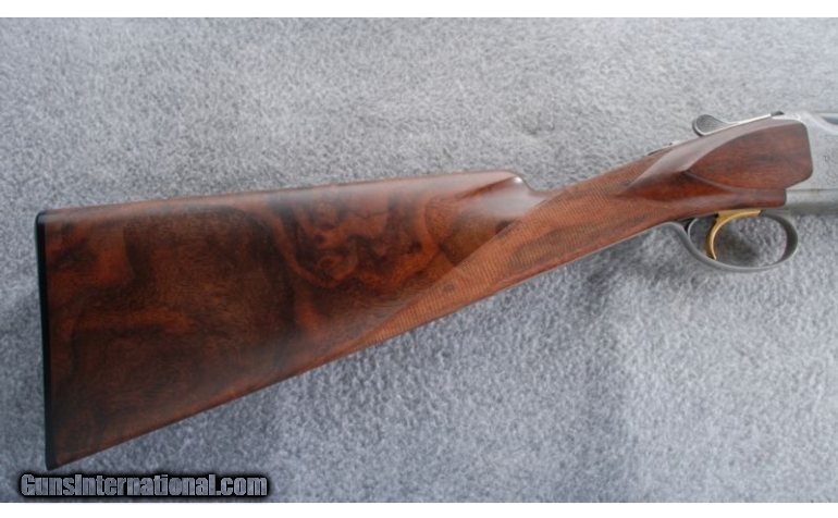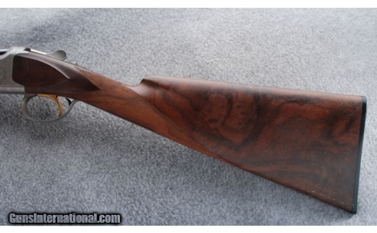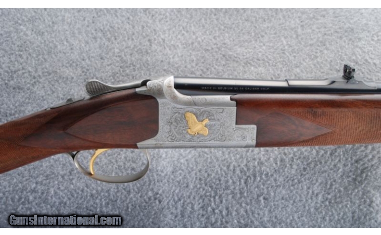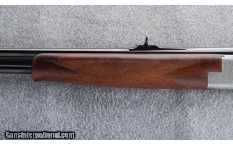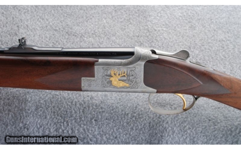 Description: This Centennial double rifle is built on a Superposed action and was made to commemorate 100 years of Browning. The coin finished receiver has gold inlaid game scenes and scroll engraving. The high grade checkered walnut stock set has a satin oil finish. This gun does not have the case or shotgun barrel set. SOLD Manufacturer: 1978 Caliber Info: .30-06 Metal Condition: There is some light freckling on the receiver, bottom tang, and trigger guard. Wood Condition: There is a small patch of dings on the left side of the stock near the toe. Bore Condition: Bright bores with sharp rifling. Barrels: 24 Triggers: Single Selective. Gold. Stock: Staight Stock Dimensions: 14" LOP Fore End: Schnabel Butt Pad: Maker's buttplate. Weight: 7 lbs. 2 oz. Sights: Beaded front blade with an adjustable folding leaf rear. Item Location: Gonzales, LA |