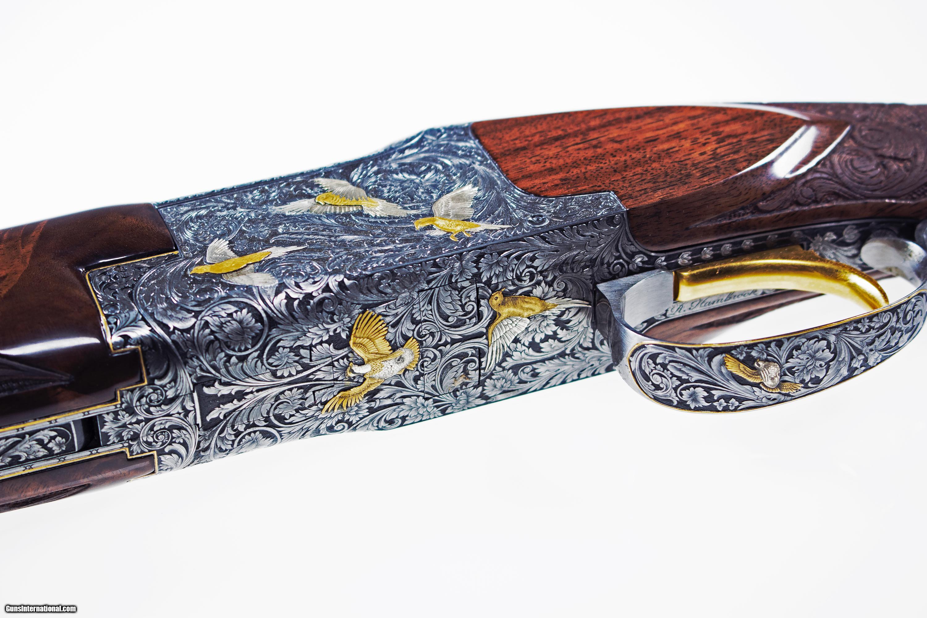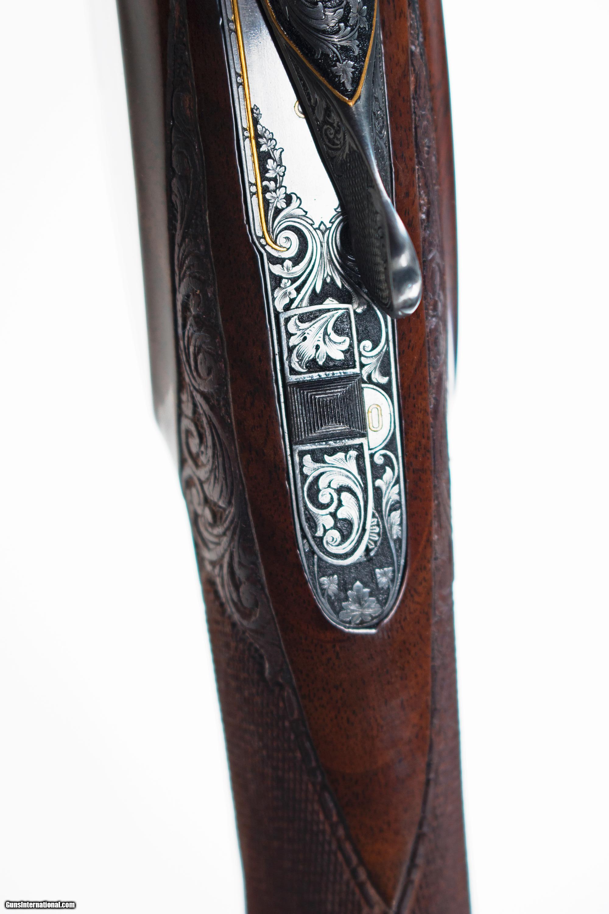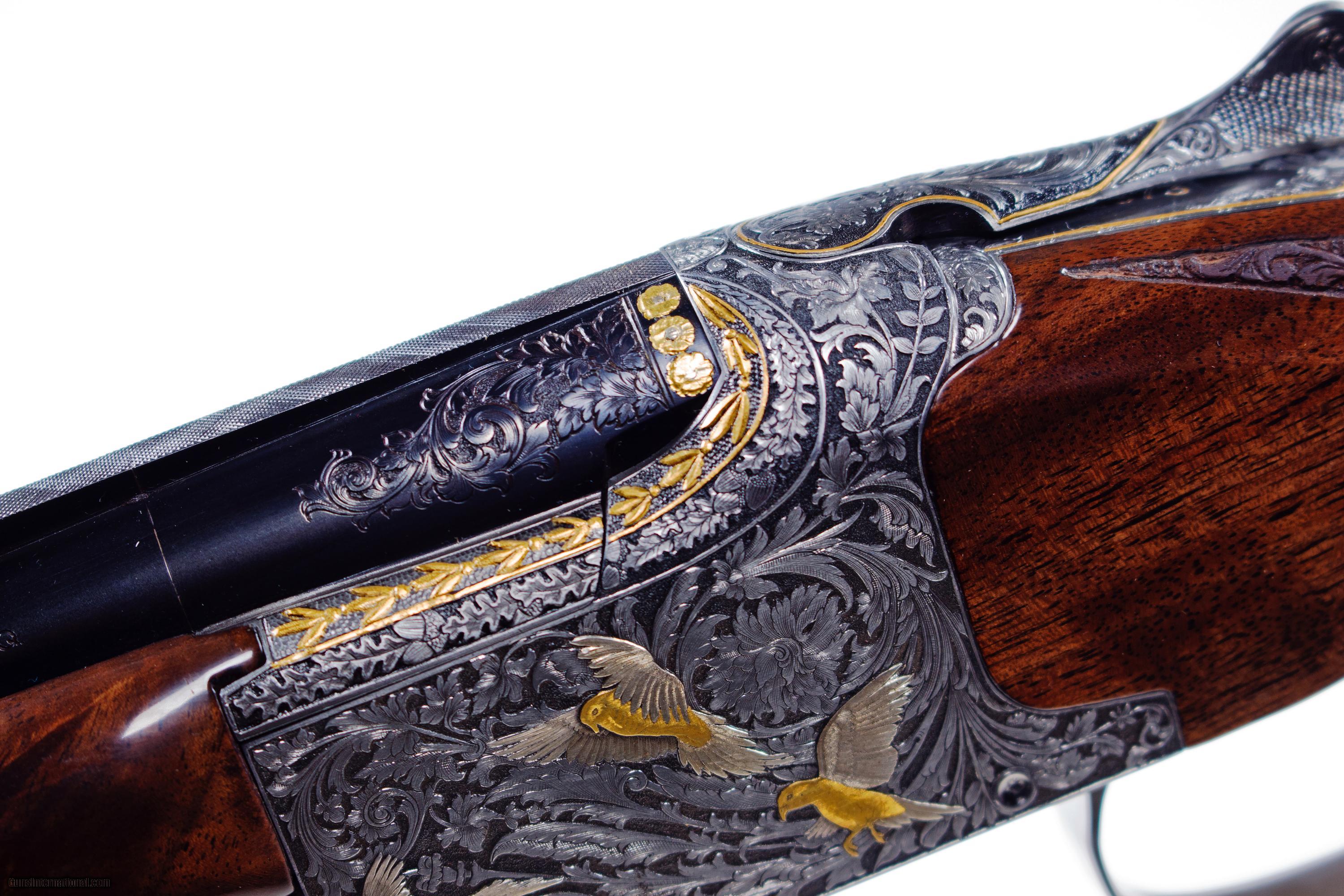 Description: Custom engraved by Browning engraver and FEGA Master engraver Richard Hambrook. .28 gauge Browning Superposed. 28" barrels, full and full chokes. Exhibition grade wood with 25 lines per inch checkering with hand carving also done by Richard Hambrook. Richard Hambrrok has been a Browning Gunsmith and engraver for 18 years with the Superposed being his forte. This beautiful piece also comes with a FEGA Master Engraver certificate of authenticity. The stock dimensions are standard Browning specs. Round knob, long tang. New custom wood, no salt. SOLD Manufacturer: Browning Model: Superposed Serial Number: 22373 Bore: .28 gauge Chambers: 2 3/4 Condition: Mint Metal Condition: Mint Wood Condition: Mint Bore Condition: Mint Barrels: 28 Gauge Info: .28 gauge LOP: 14 1/4 Finish: Gloss Chokes: Full/full Engraving: Custom Case: Browning |