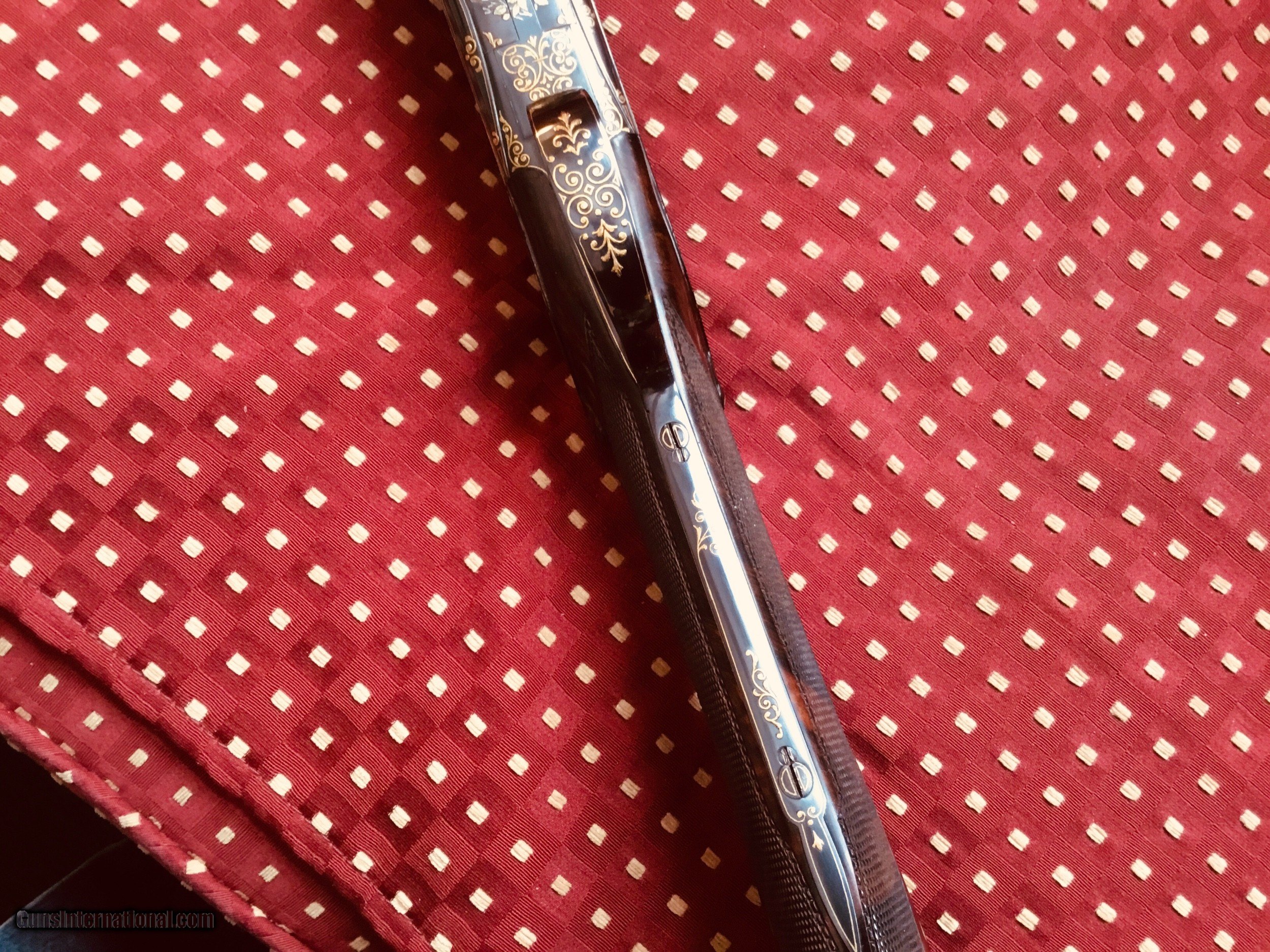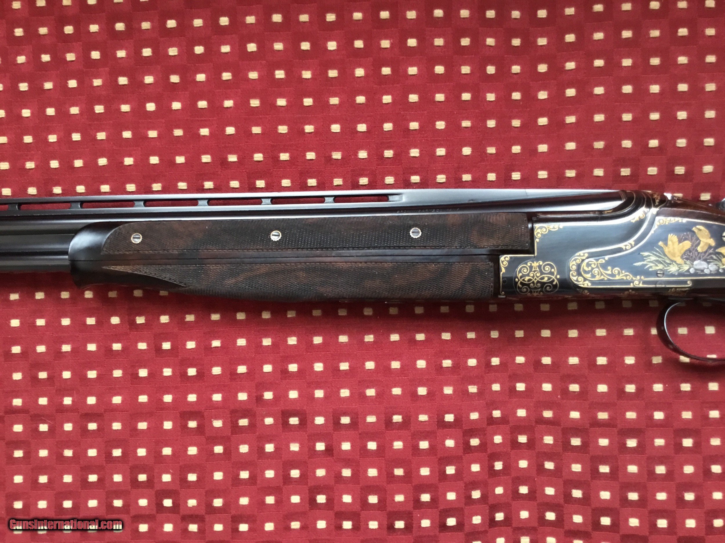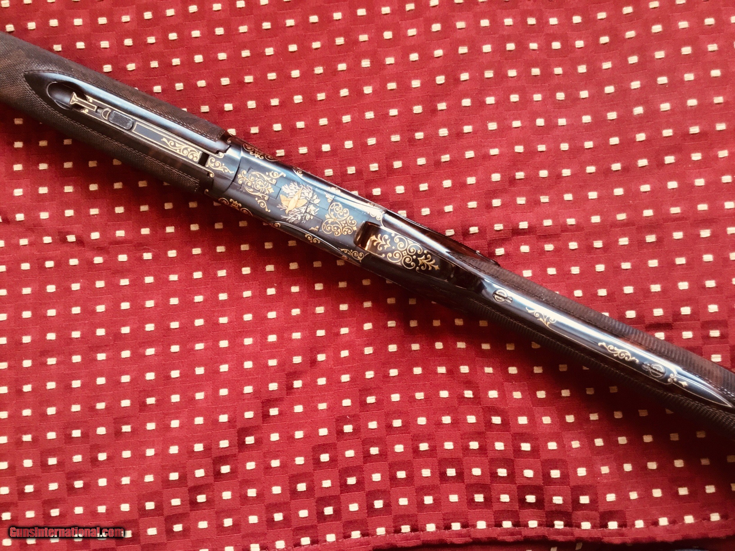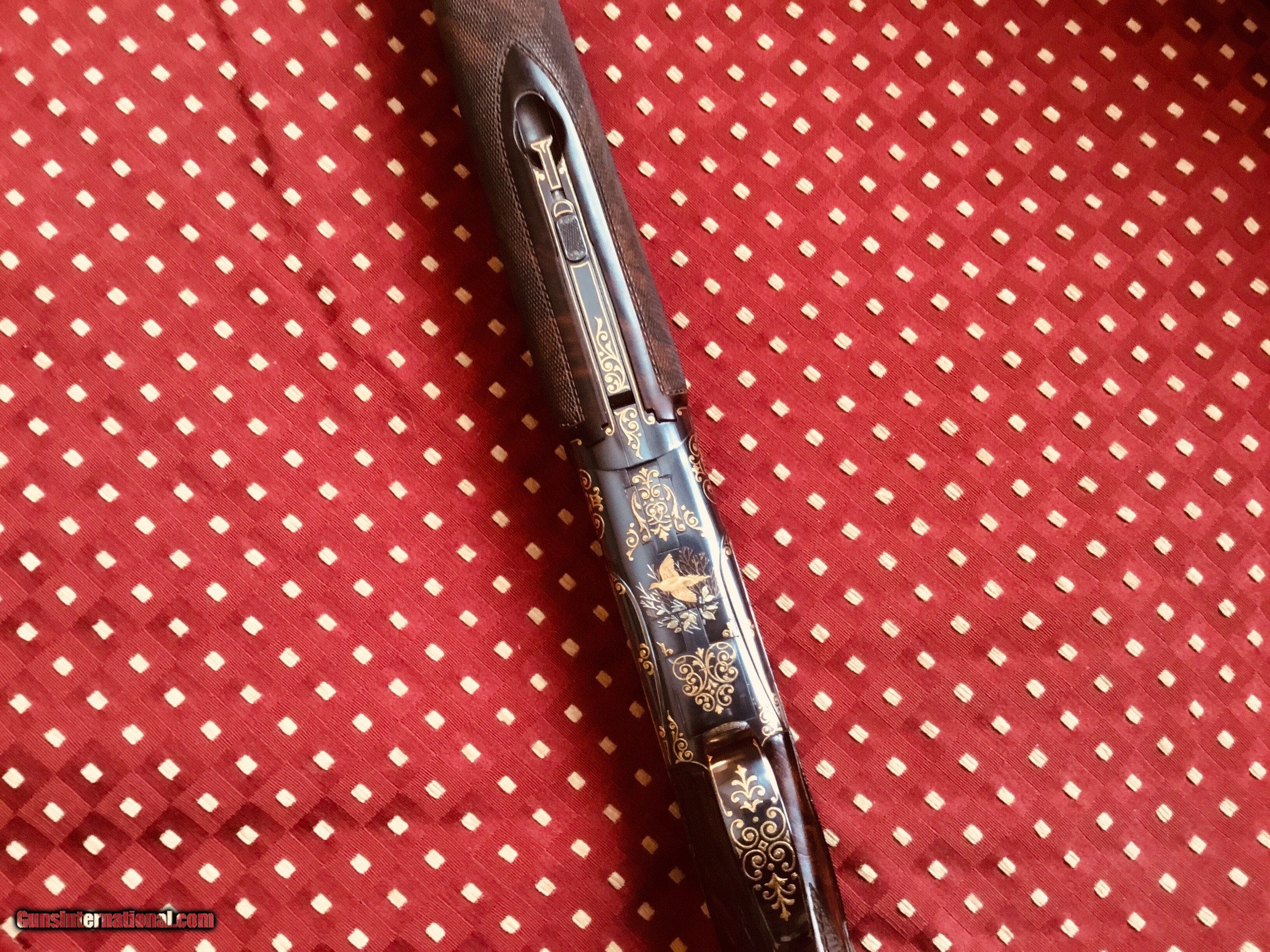 Description: Outstanding custom Exhibition by Browning master engraver R. Capece. 410 ga. 3 in. Chambers, 261/2 in. barrels choked IC & M. Superlite stock and forearm very highly figured European walnut. Imitation locks feature upland birds in two color gold, copper and platinum, with gold scroll throughout on the blue-black background. Features 3 piece forearm, hand filed rib, checkered butt. Lop is 141/2 in. Mint condition. SOLD |
