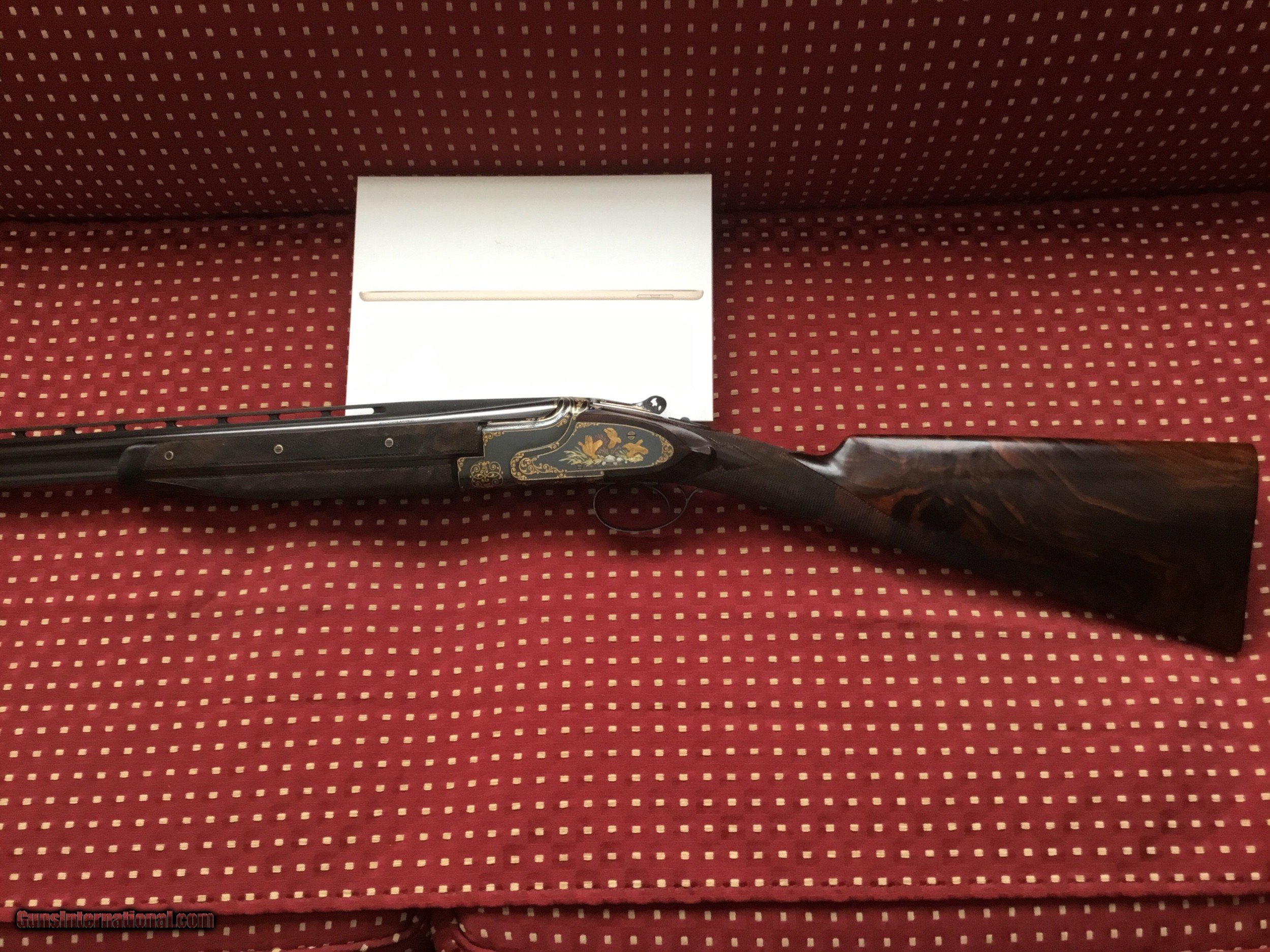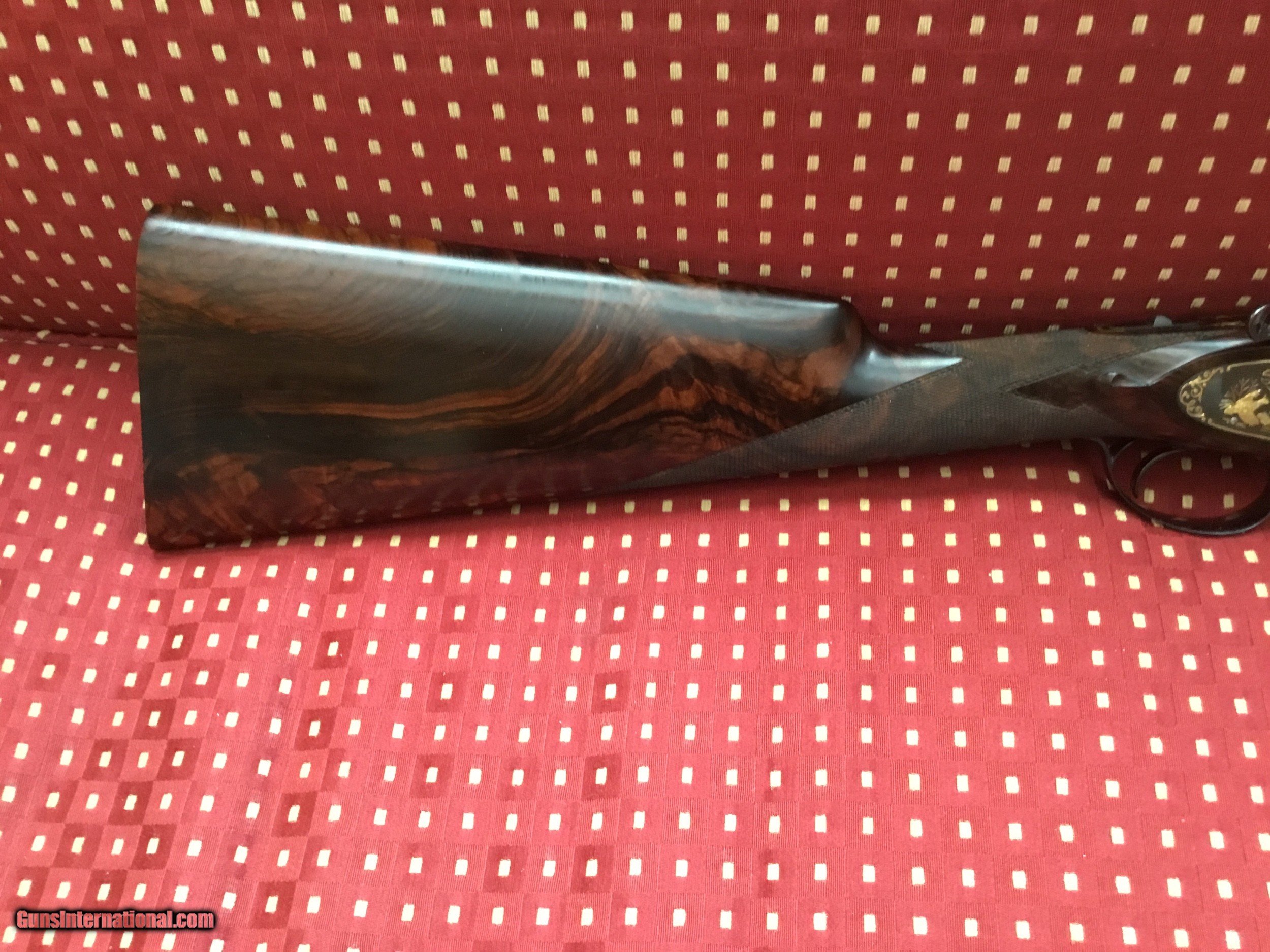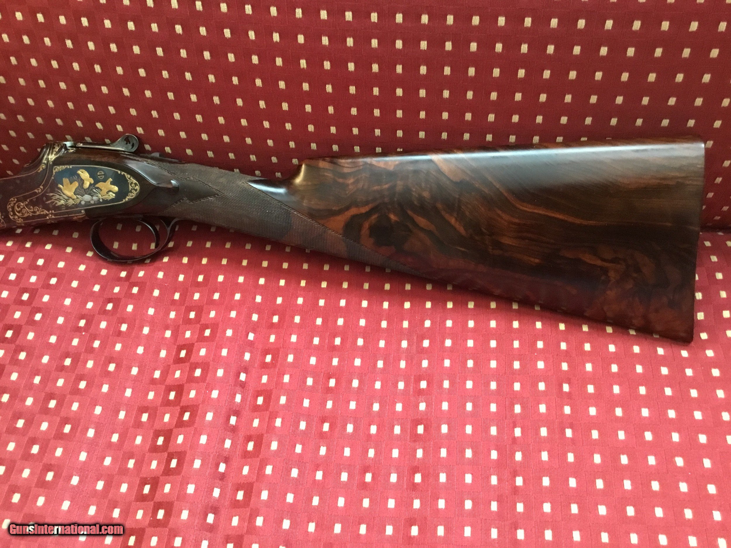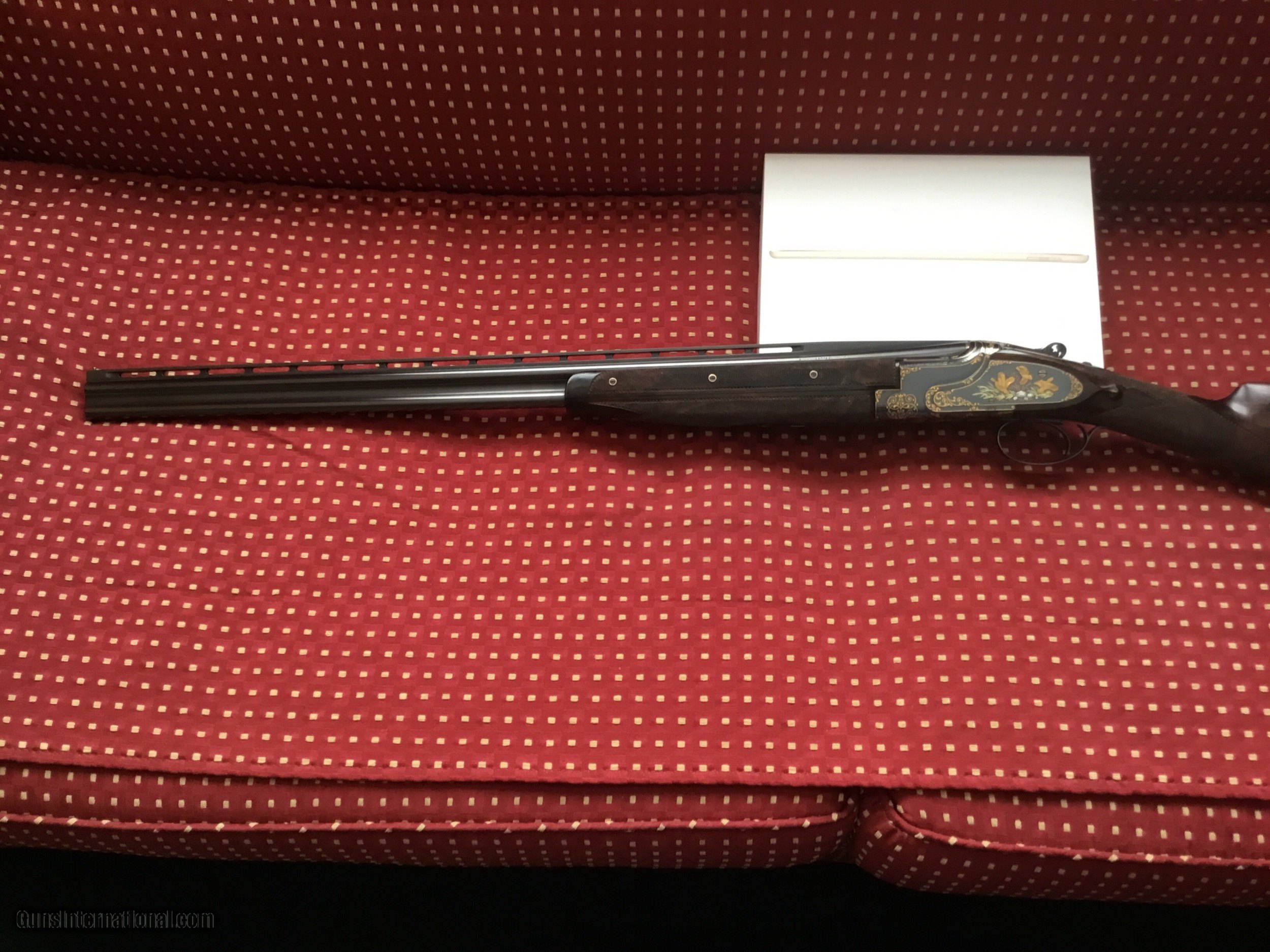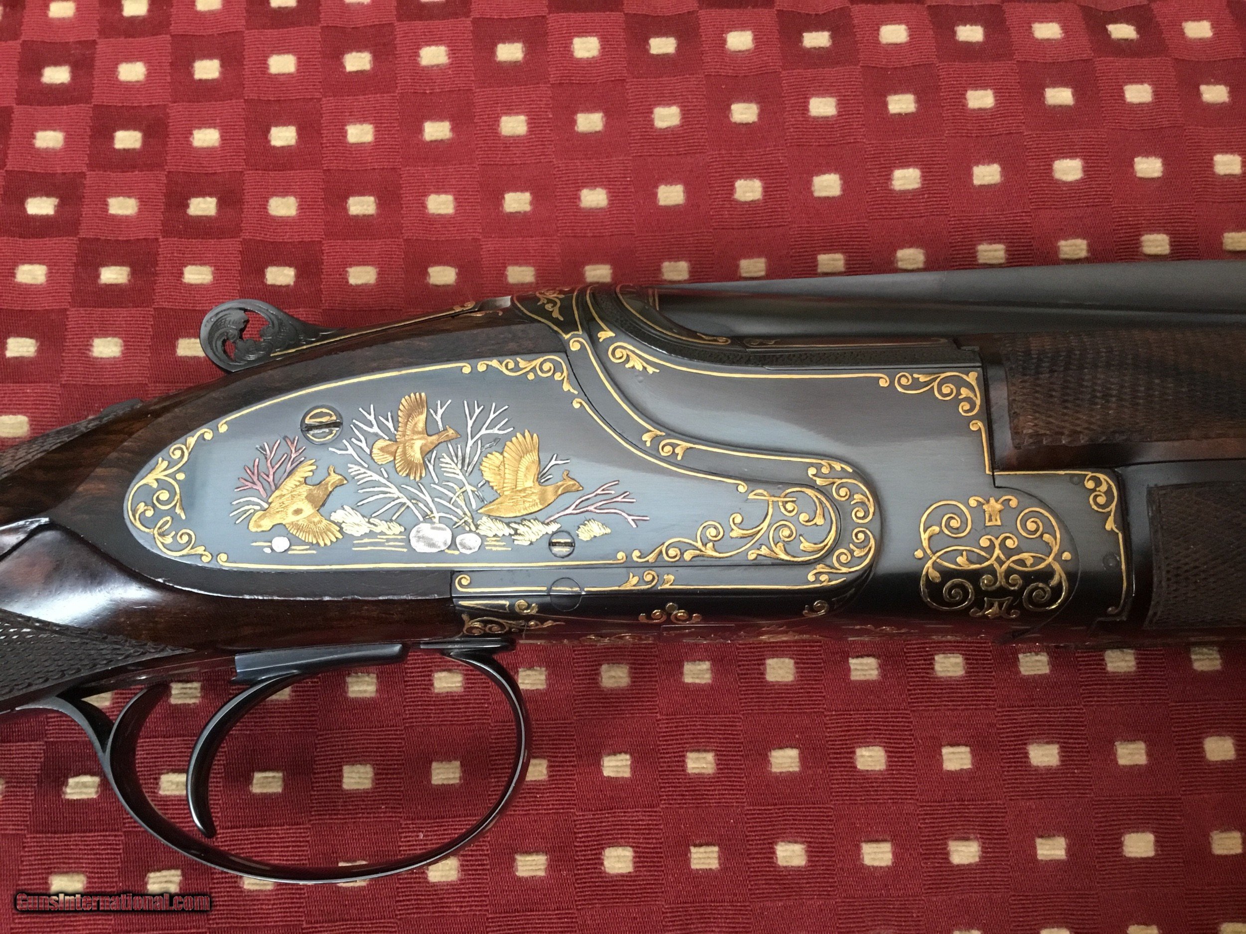 Description: Outstanding custom Exhibition by Browning master engraver R. Capece. 410 ga. 3 in. Chambers, 261/2 in. barrels choked IC & M. Superlite stock and forearm very highly figured European walnut. Imitation locks feature upland birds in two color gold, copper and platinum, with gold scroll throughout on the blue-black background. Features 3 piece forearm, hand filed rib, checkered butt. Lop is 141/2 in. Mint condition. SOLD |