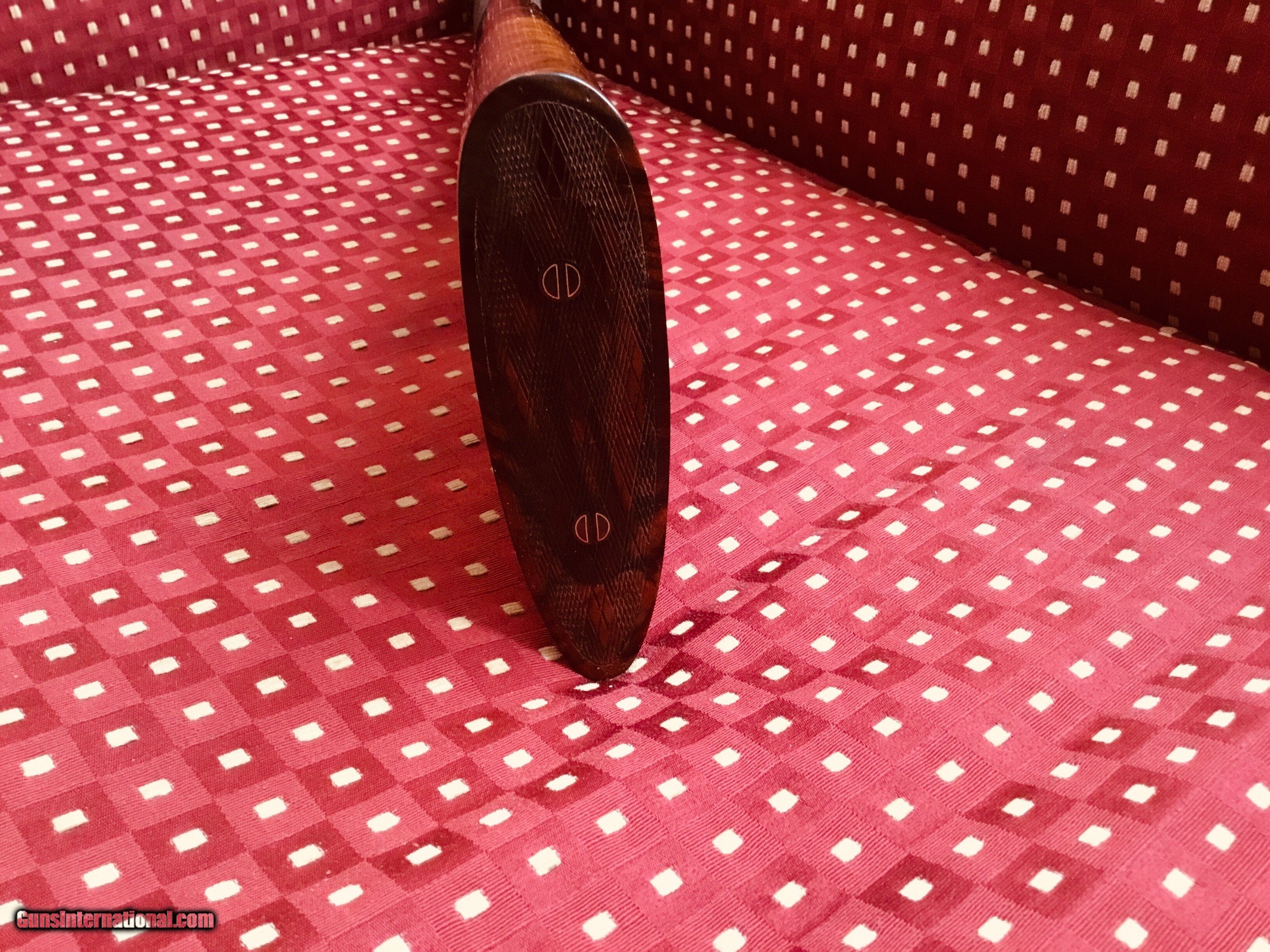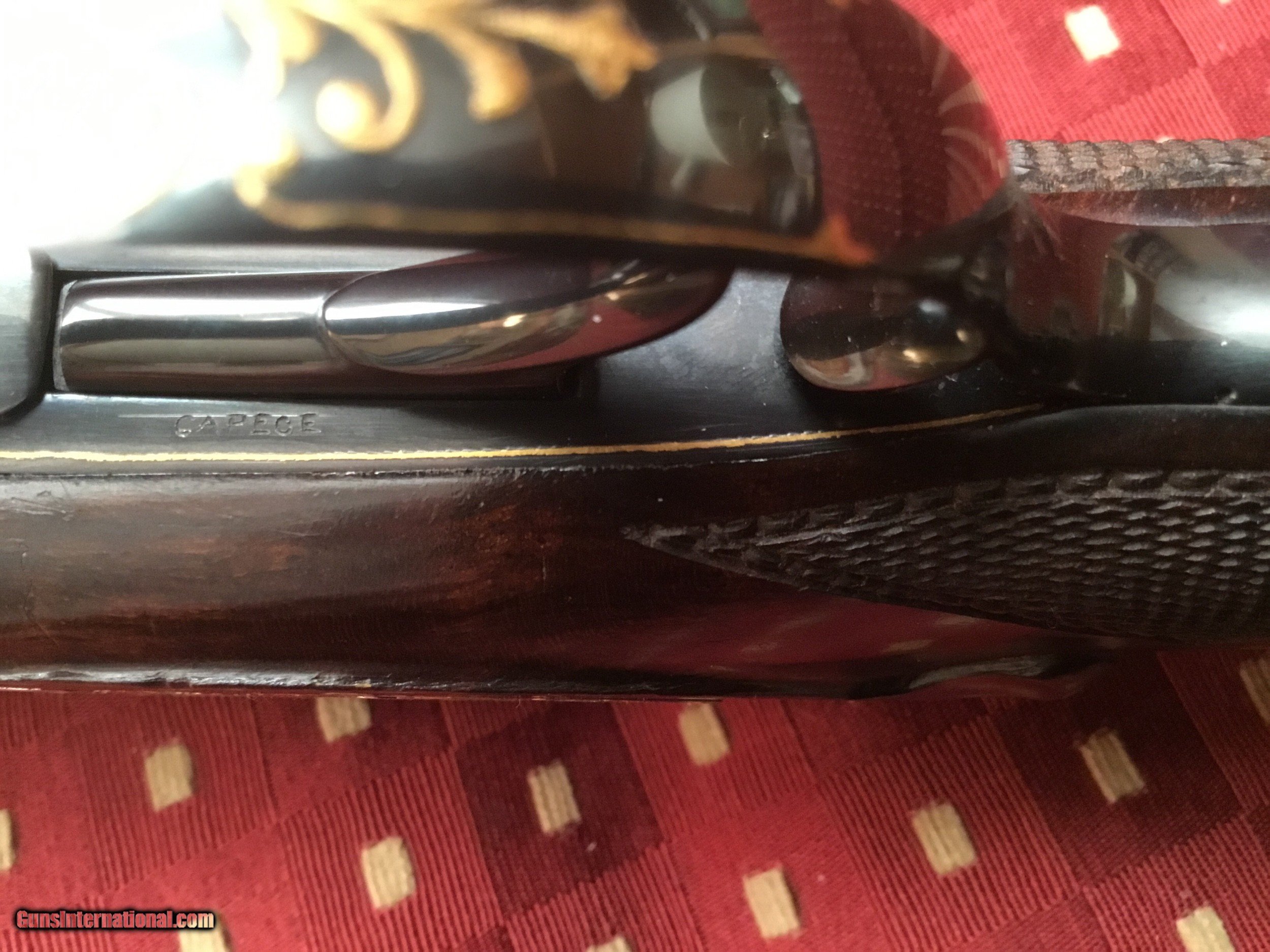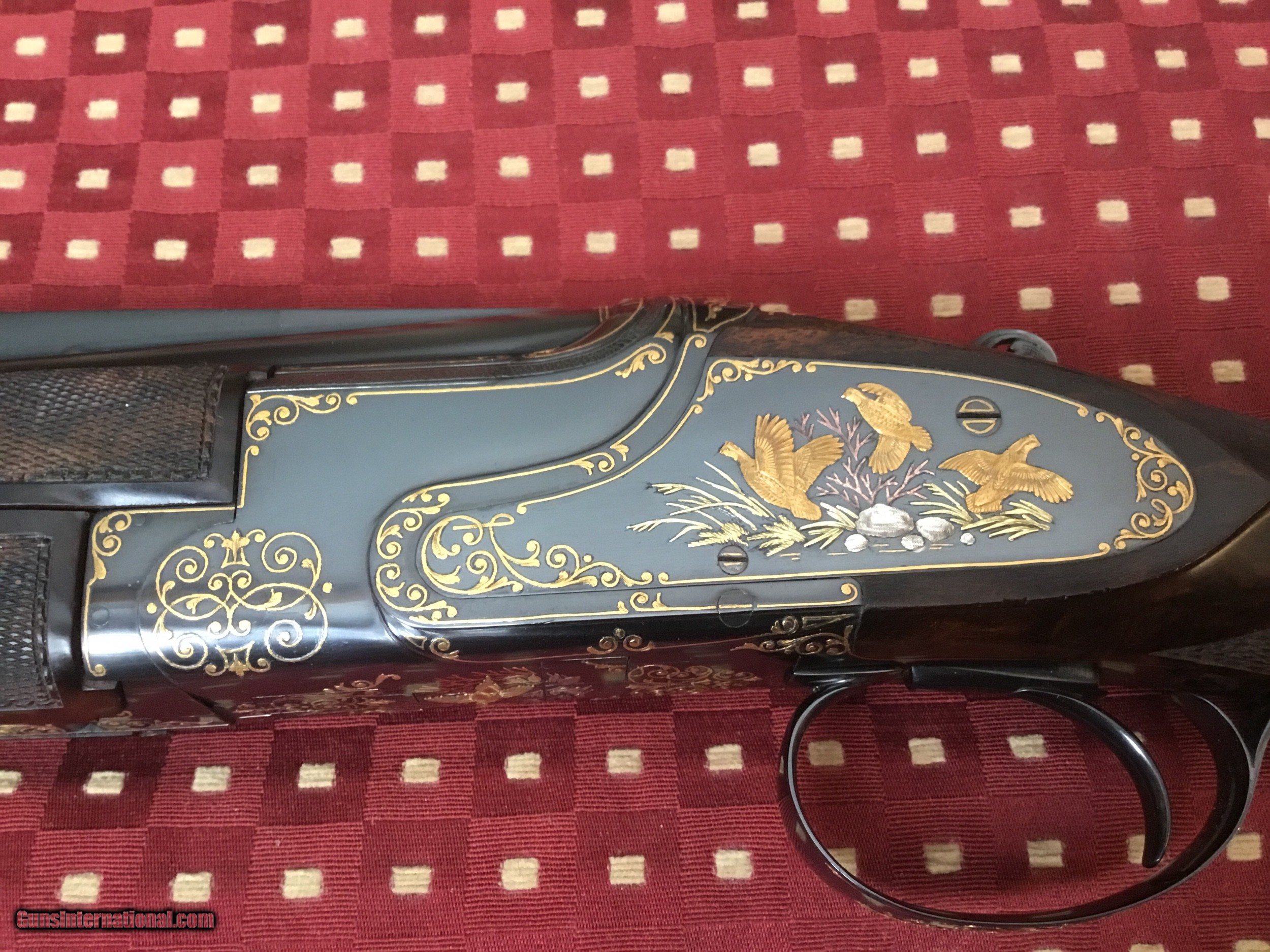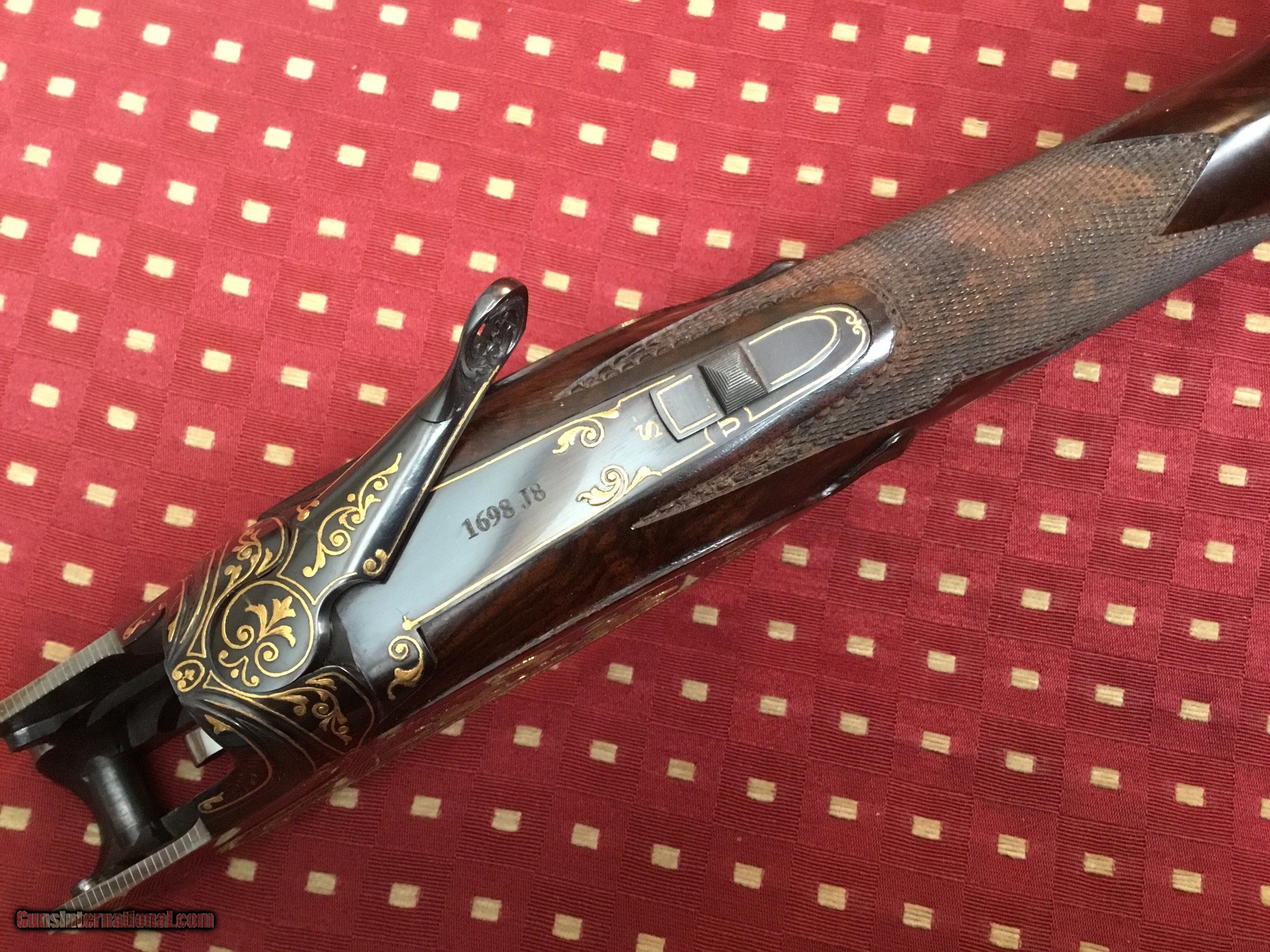 Description: Outstanding custom Exhibition by Browning master engraver R. Capece. 410 ga. 3 in. Chambers, 261/2 in. barrels choked IC & M. Superlite stock and forearm very highly figured European walnut. Imitation locks feature upland birds in two color gold, copper and platinum, with gold scroll throughout on the blue-black background. Features 3 piece forearm, hand filed rib, checkered butt. Lop is 141/2 in. Mint condition. SOLD |