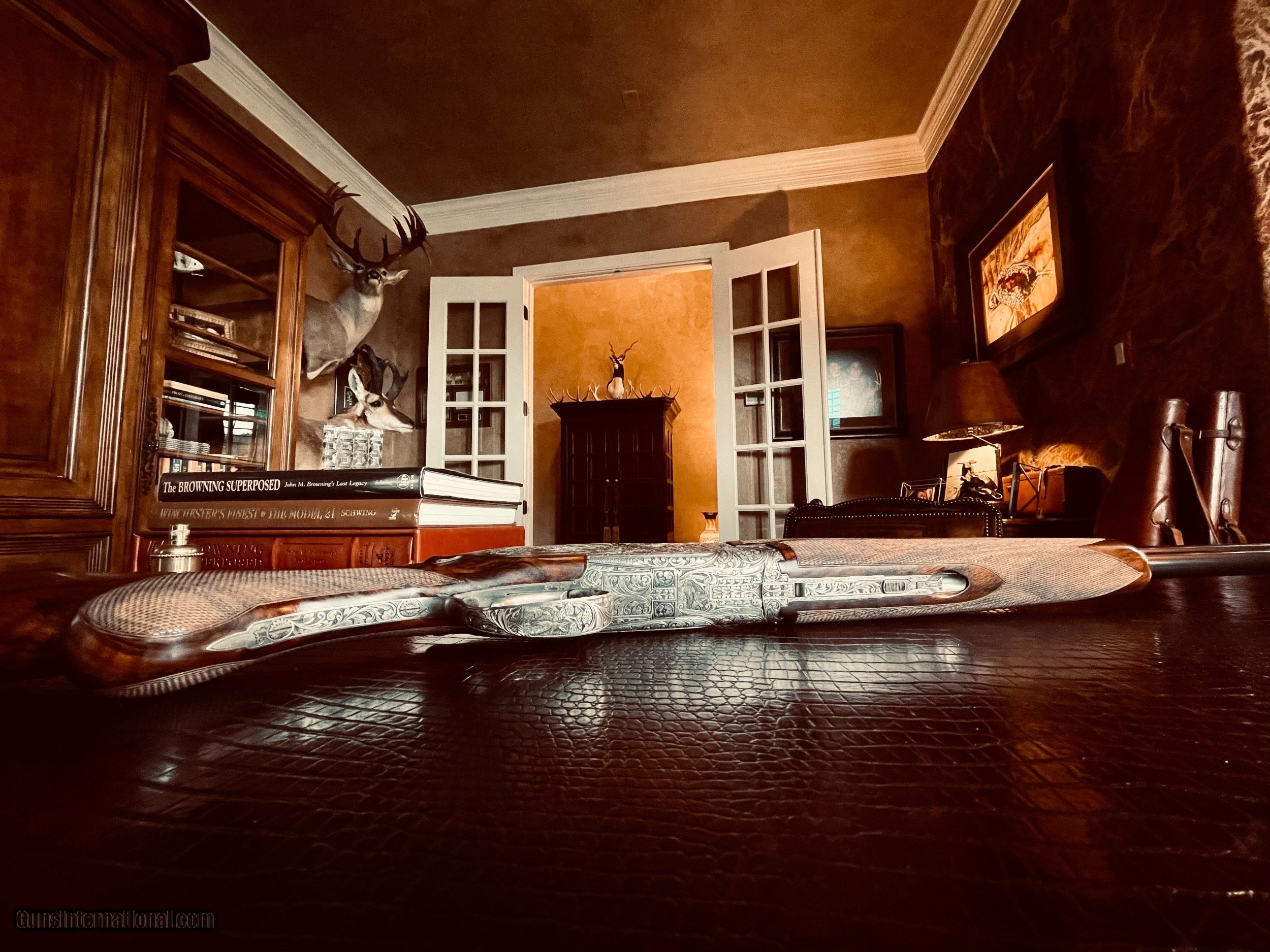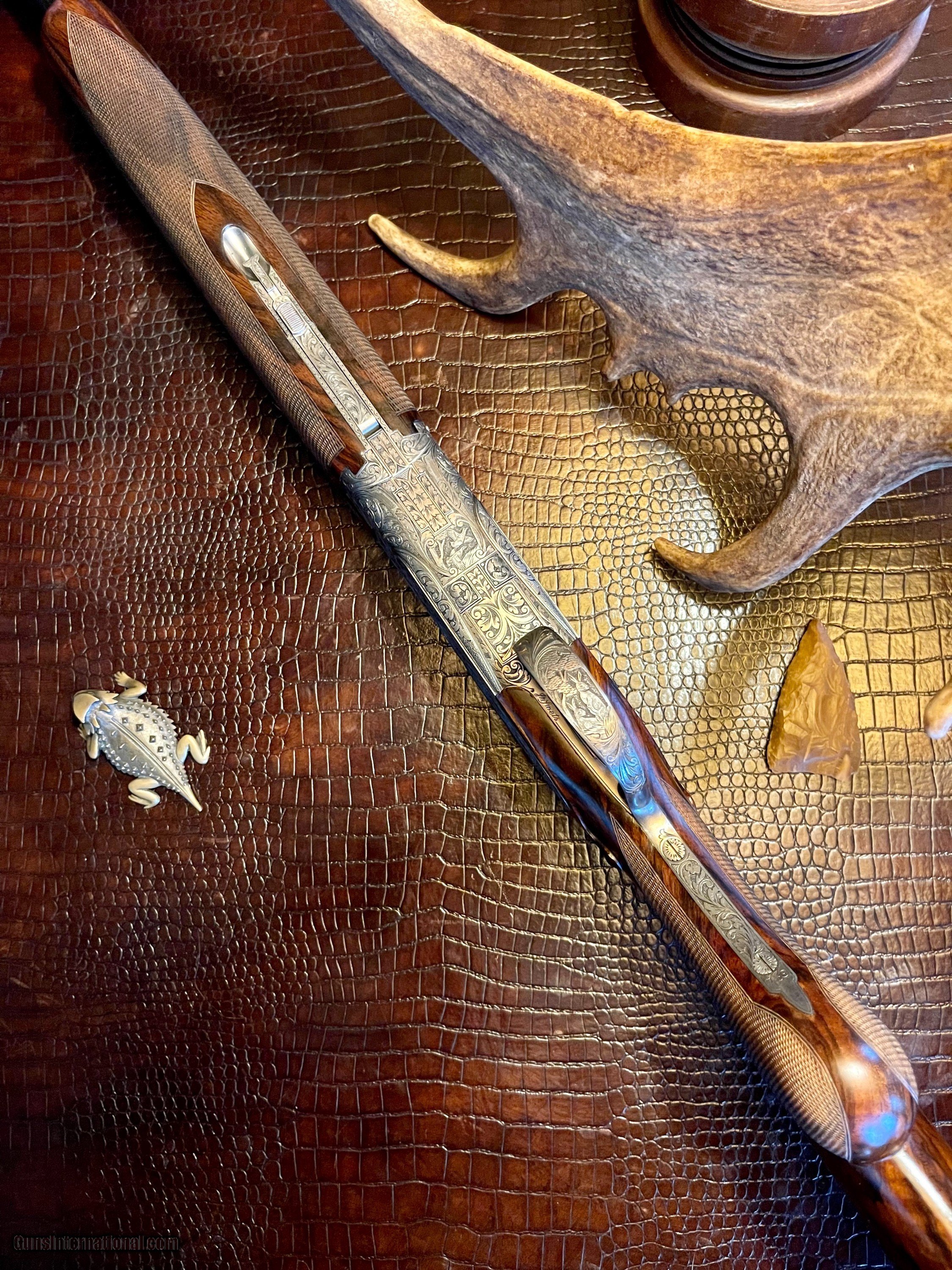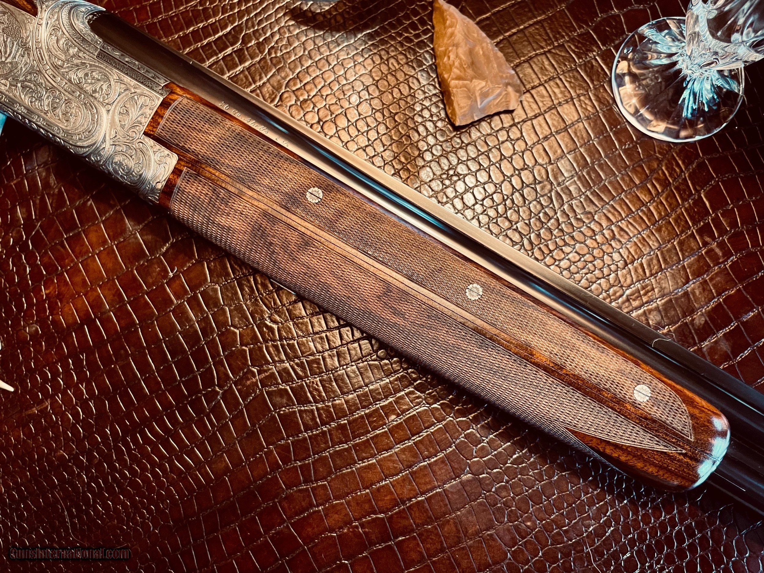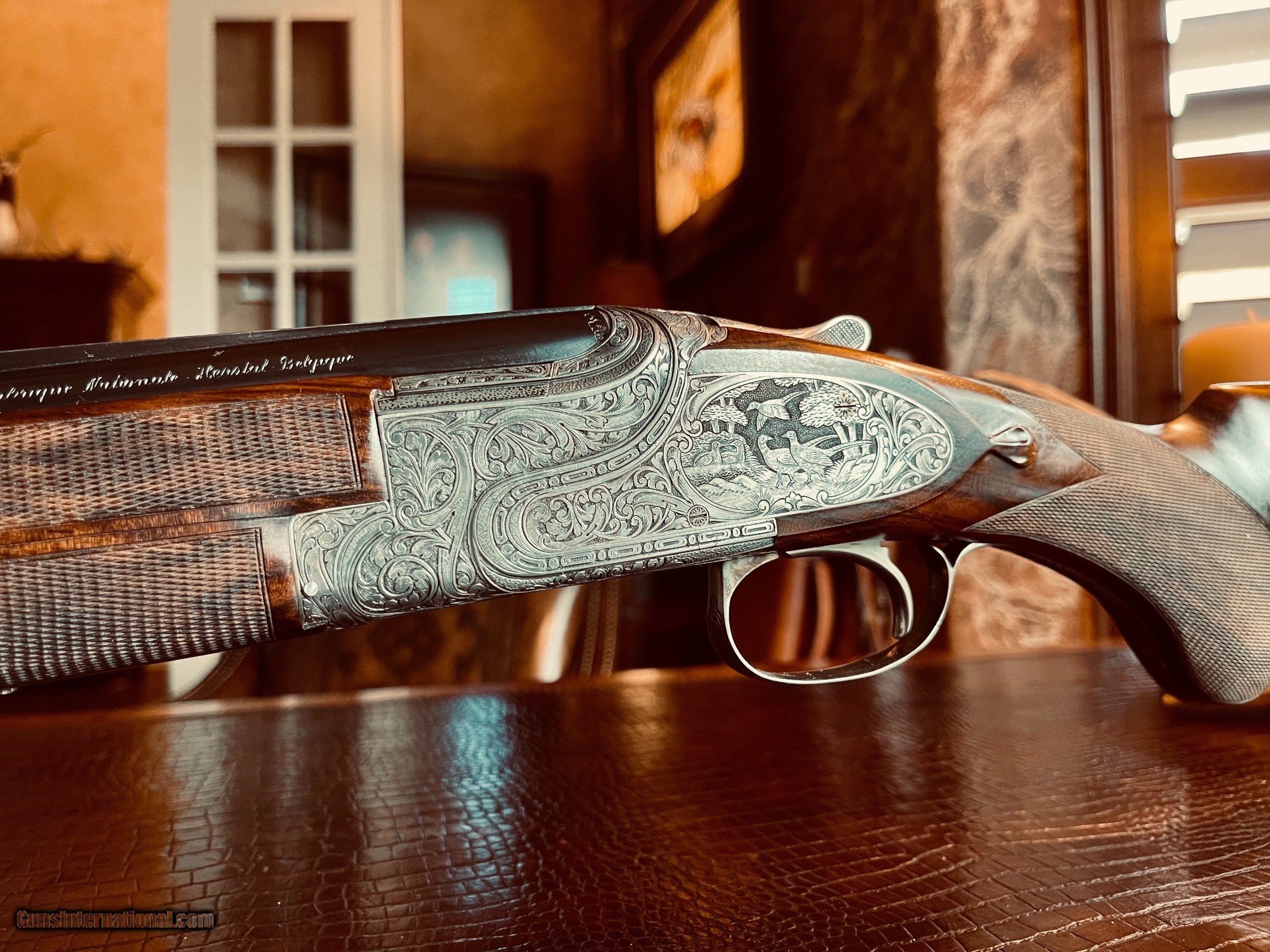 Description: Browning "FN" Belgium Superposed P4 Custom - 28ga - 32" Custom FN Barrels - J.M. Smets Custom Engraved - F/F - Solid Rib - Three Piece Style Forend - Circassian Walnut - Checkered Butt - This is a very rare configuration commissioned work built in Belgium - this engraver is one of my favorites - I own other work by him and it can be further appreciated when the time is taken to look deep in the backgrounds of his ornate engraving work. All custom. All over the top. Hundreds of man hours spent on this artwork of steel and wood. (***chokes can be opened to your specifications) 14 11/16 x 1 1/2 x 2 1/4 - 6.10 lbs - SN: 5514 Quillen-Worfe Fine Gun Collection & Consignments *****Please read prior to making a purchase*****: