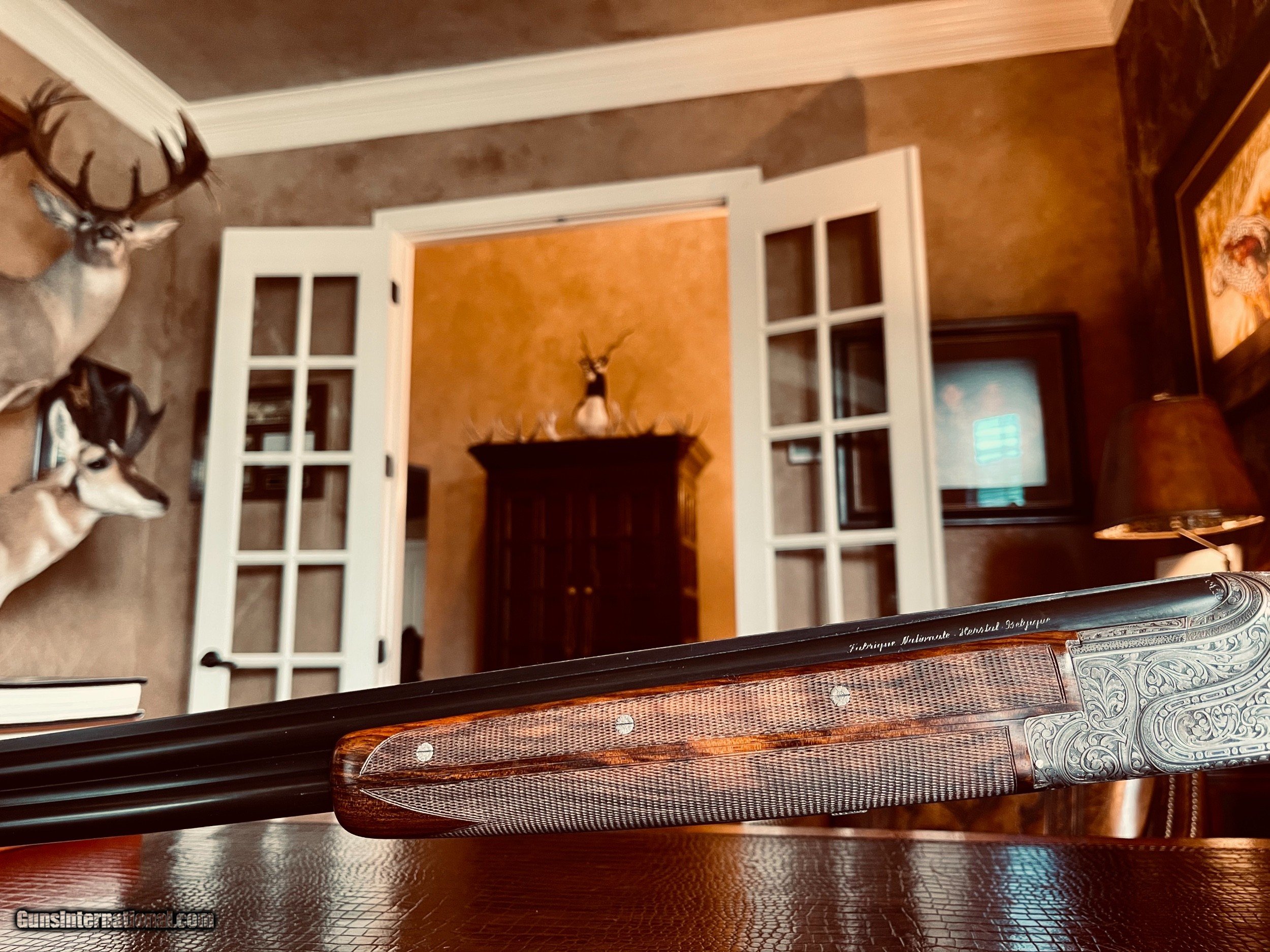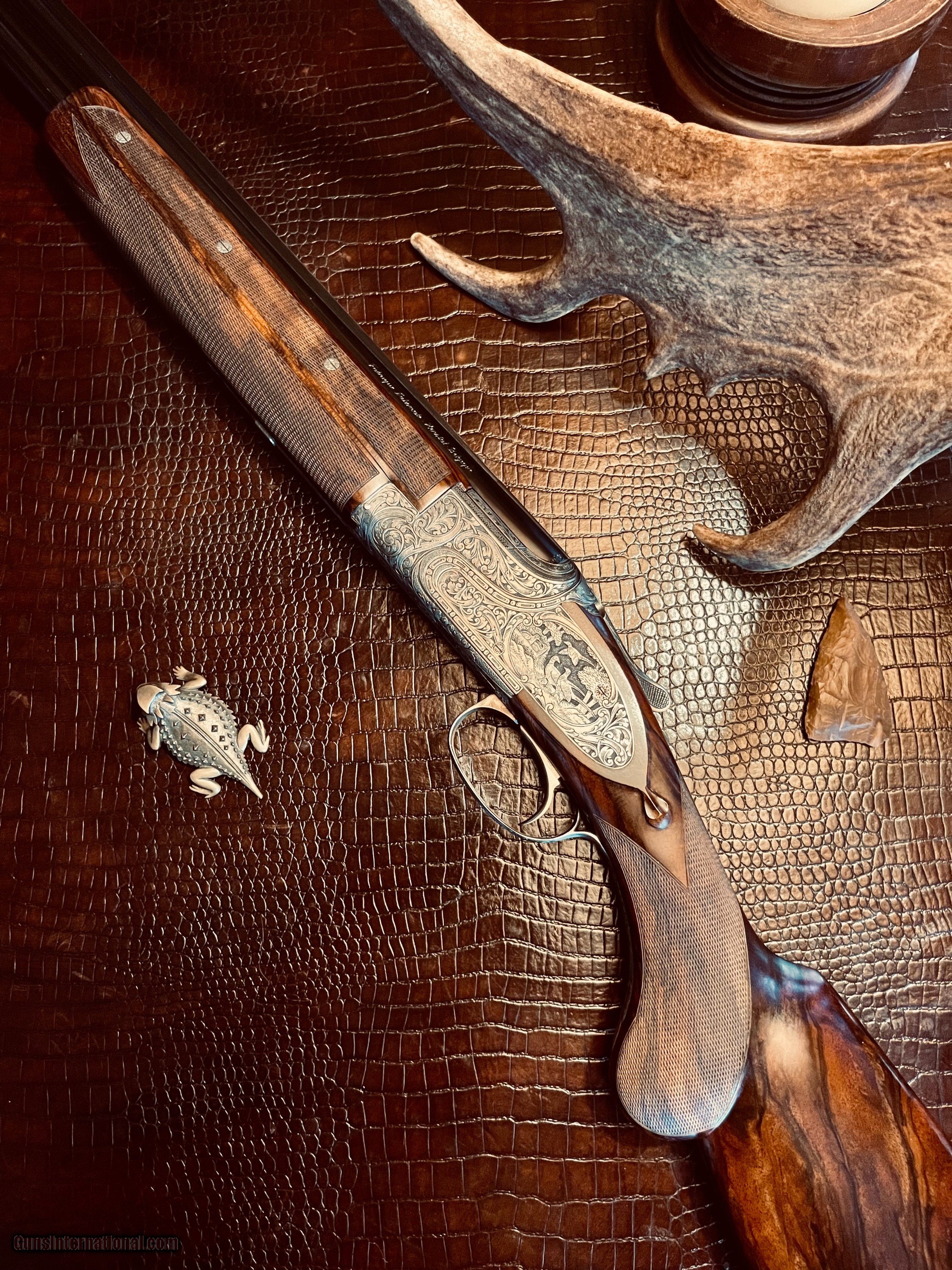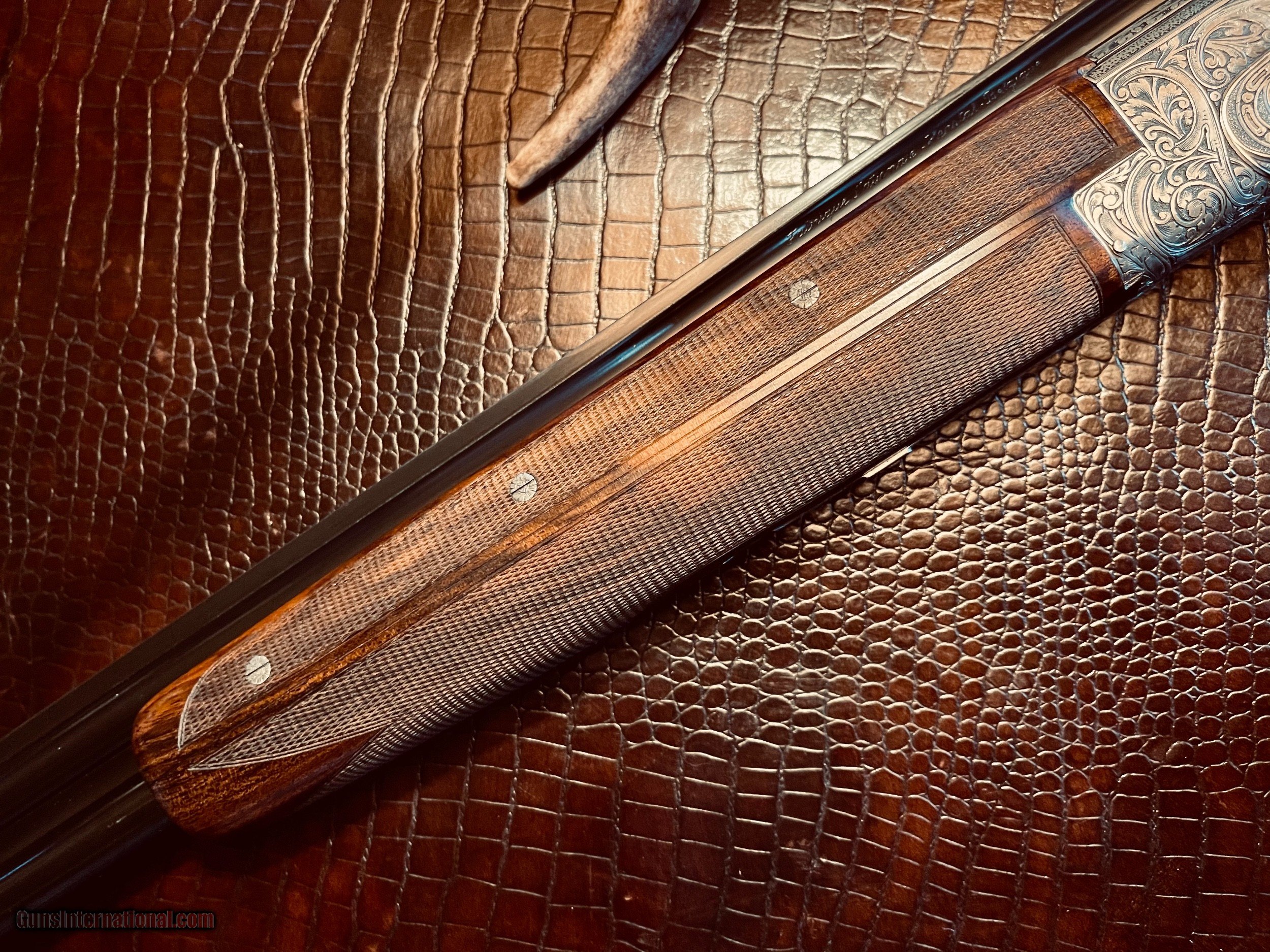 Description: Browning "FN" Belgium Superposed P4 Custom - 28ga - 32" Custom FN Barrels - J.M. Smets Custom Engraved - F/F - Solid Rib - Three Piece Style Forend - Circassian Walnut - Checkered Butt - This is a very rare configuration commissioned work built in Belgium - this engraver is one of my favorites - I own other work by him and it can be further appreciated when the time is taken to look deep in the backgrounds of his ornate engraving work. All custom. All over the top. Hundreds of man hours spent on this artwork of steel and wood. (***chokes can be opened to your specifications) 14 11/16 x 1 1/2 x 2 1/4 - 6.10 lbs - SN: 5514 Quillen-Worfe Fine Gun Collection & Consignments *****Please read prior to making a purchase*****: