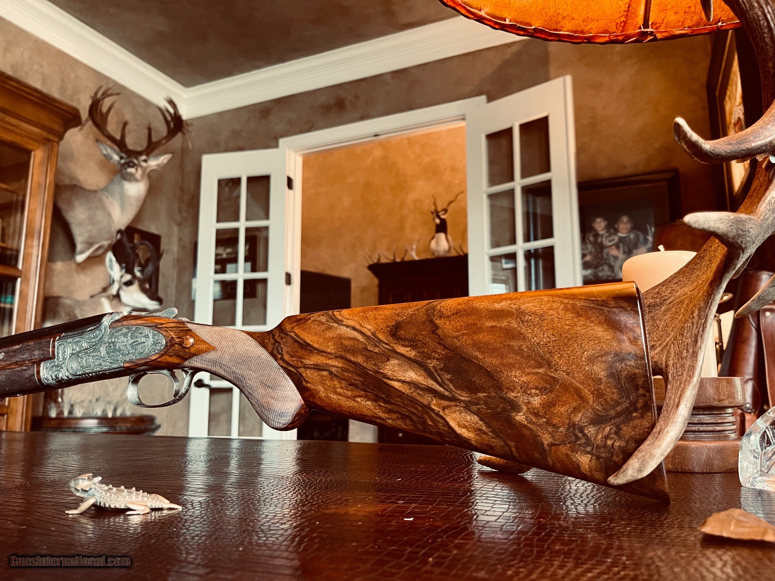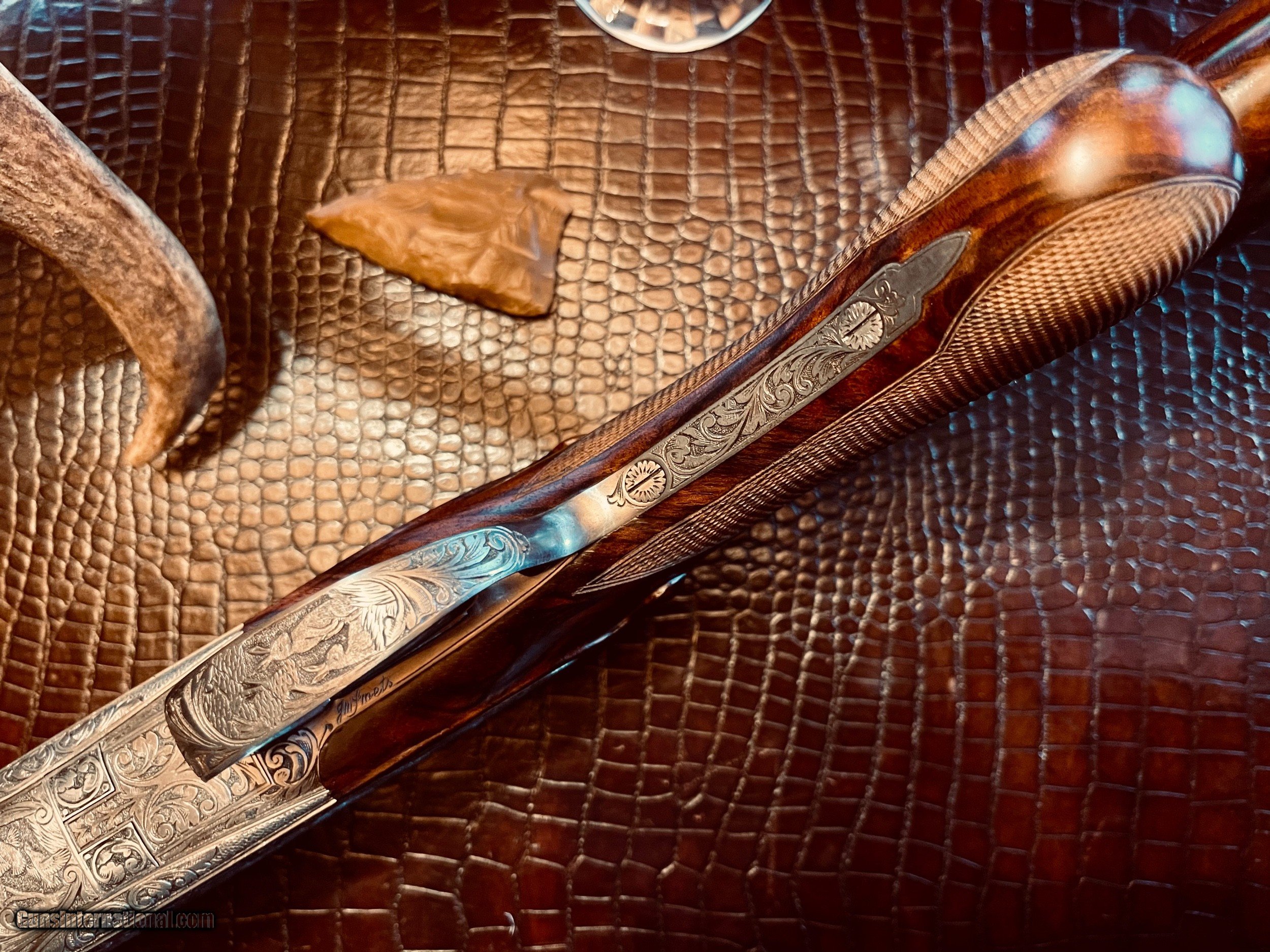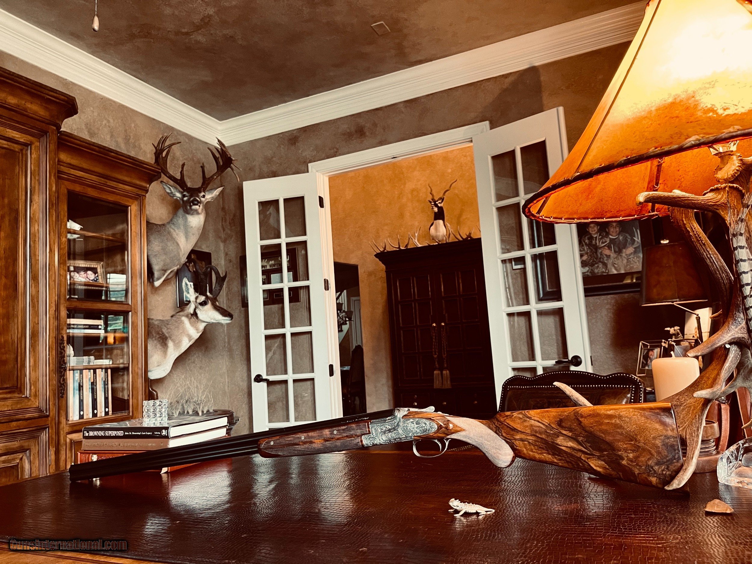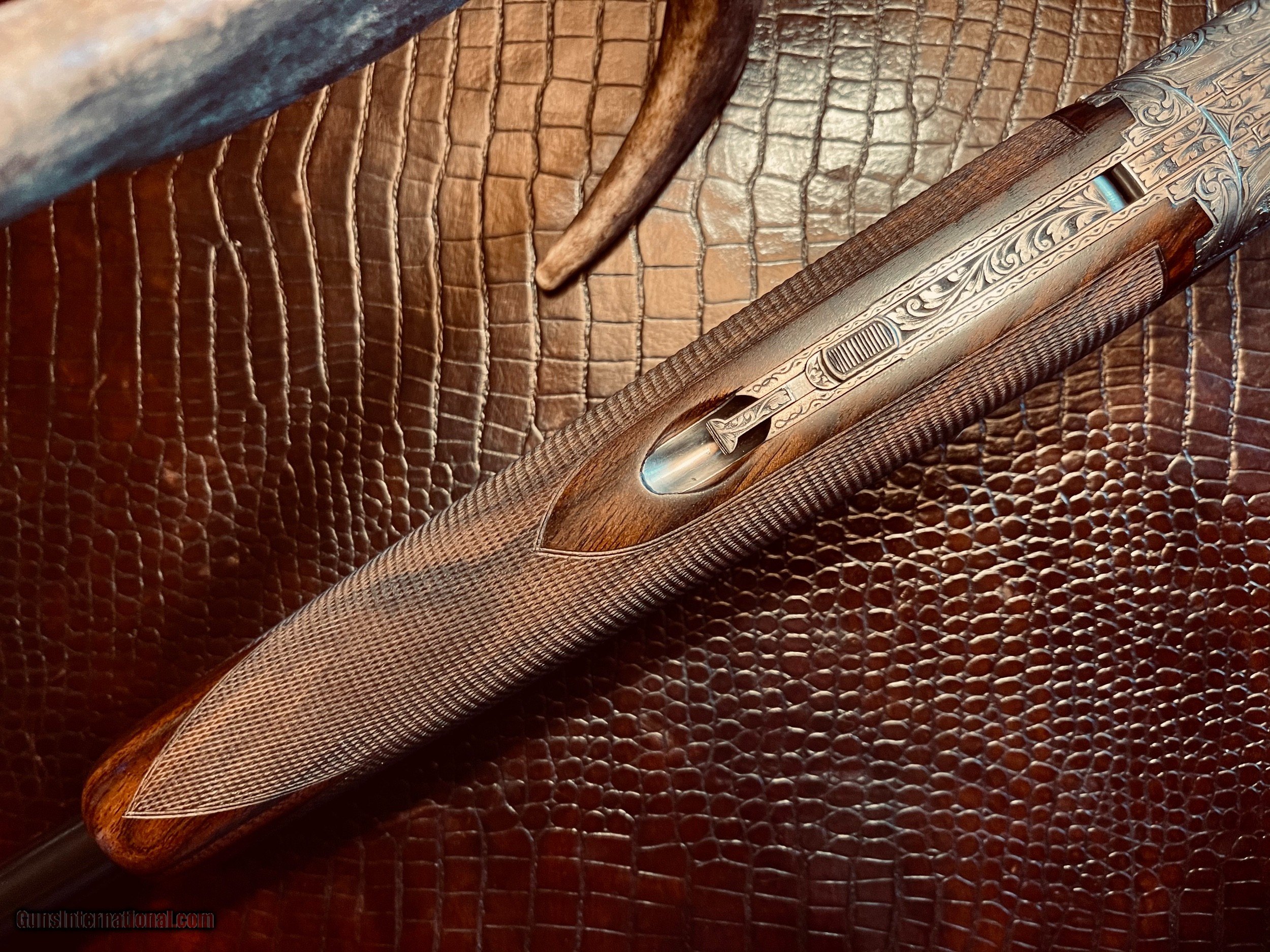 Description: Browning "FN" Belgium Superposed P4 Custom - 28ga - 32" Custom FN Barrels - J.M. Smets Custom Engraved - F/F - Solid Rib - Three Piece Style Forend - Circassian Walnut - Checkered Butt - This is a very rare configuration commissioned work built in Belgium - this engraver is one of my favorites - I own other work by him and it can be further appreciated when the time is taken to look deep in the backgrounds of his ornate engraving work. All custom. All over the top. Hundreds of man hours spent on this artwork of steel and wood. (***chokes can be opened to your specifications) 14 11/16 x 1 1/2 x 2 1/4 - 6.10 lbs - SN: 5514 Quillen-Worfe Fine Gun Collection & Consignments *****Please read prior to making a purchase*****: