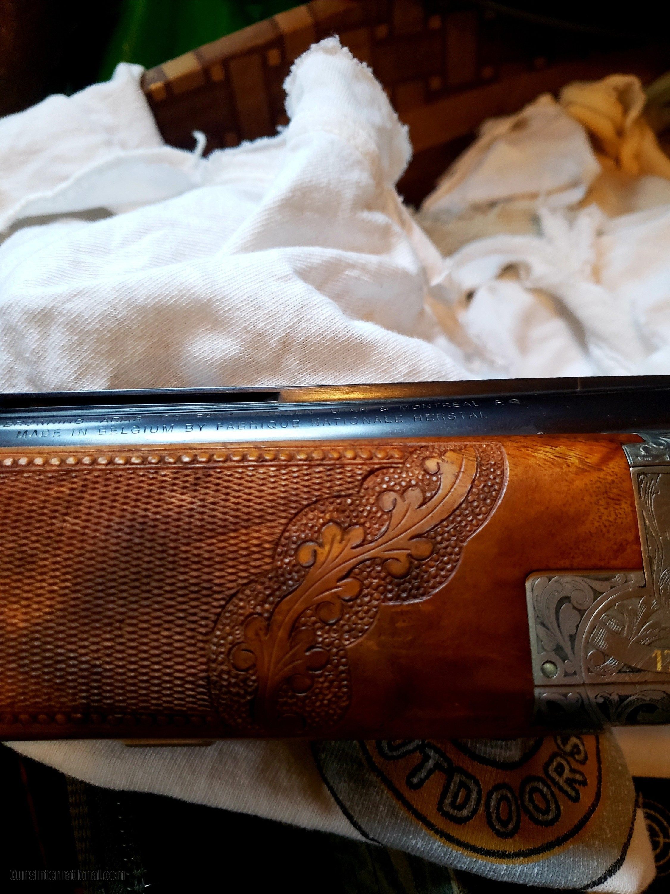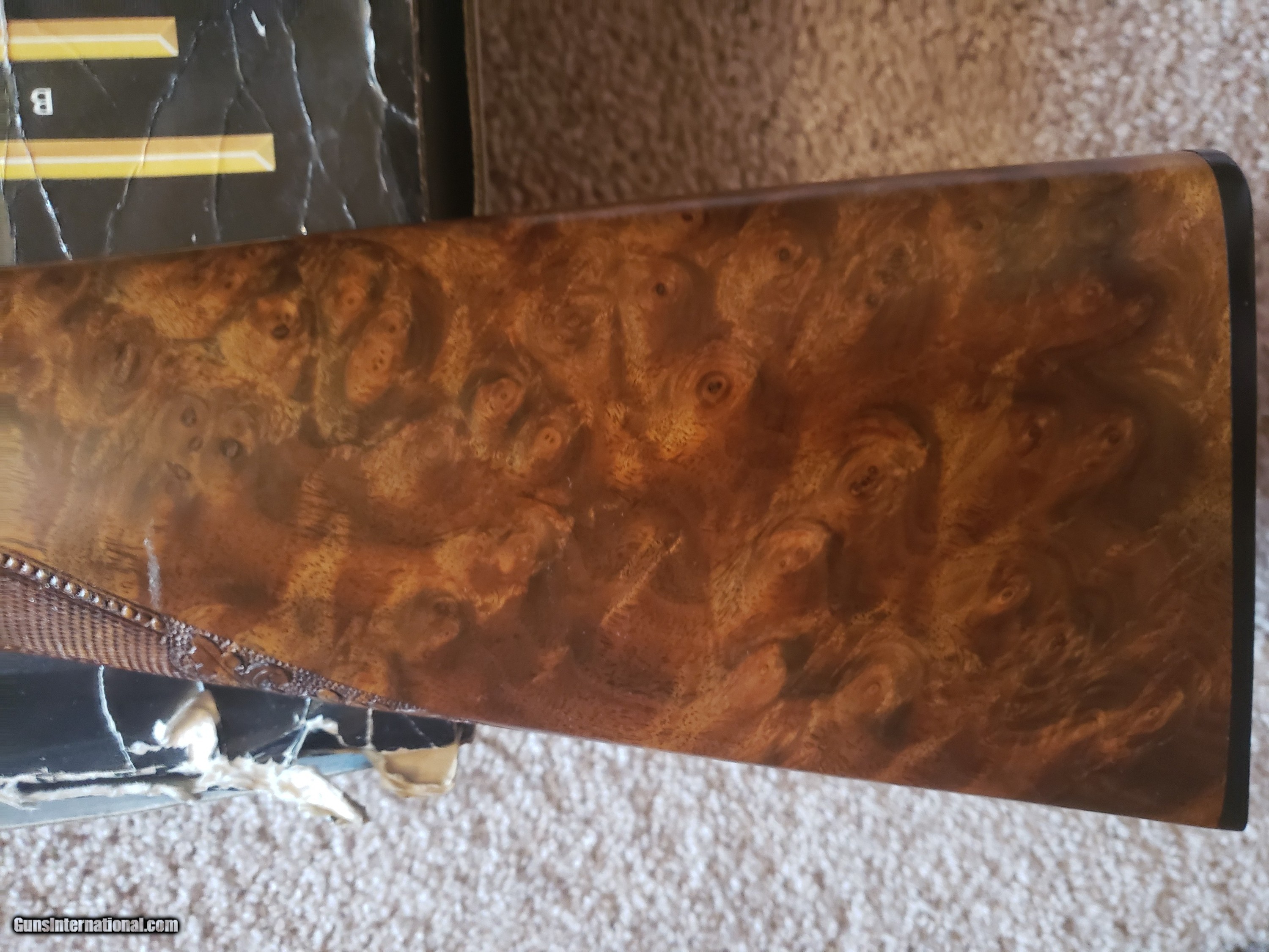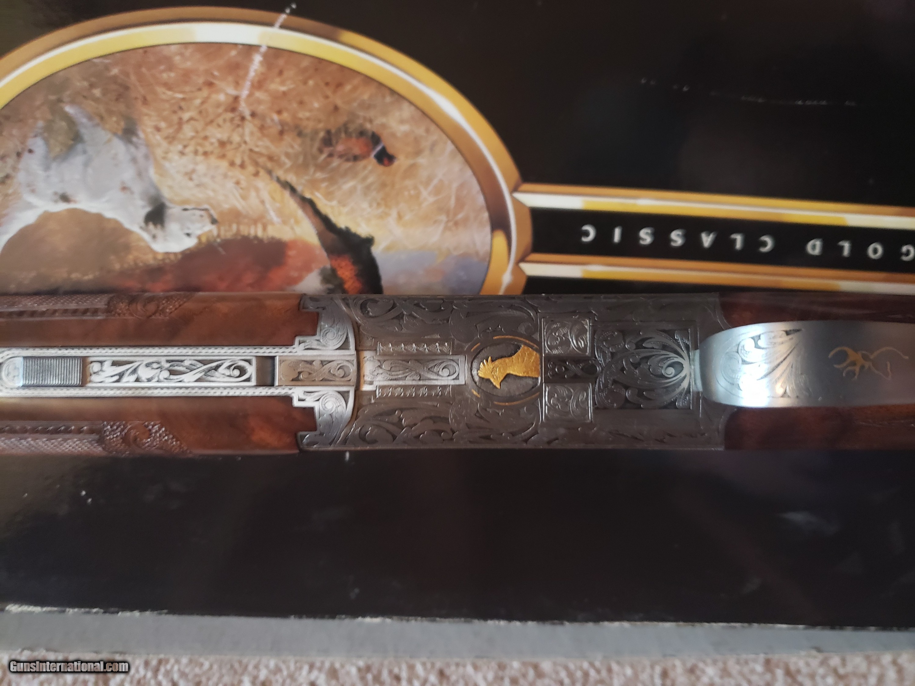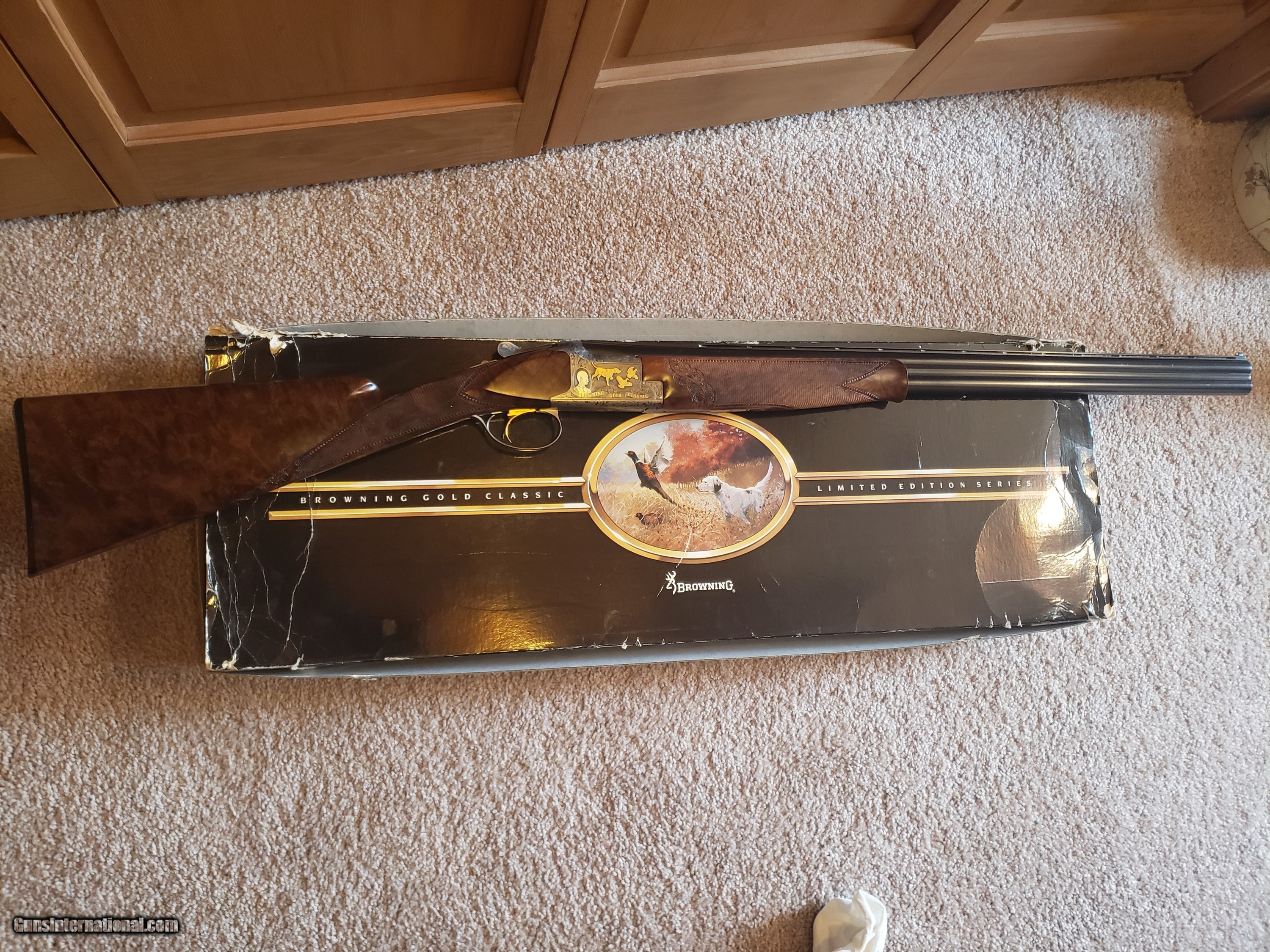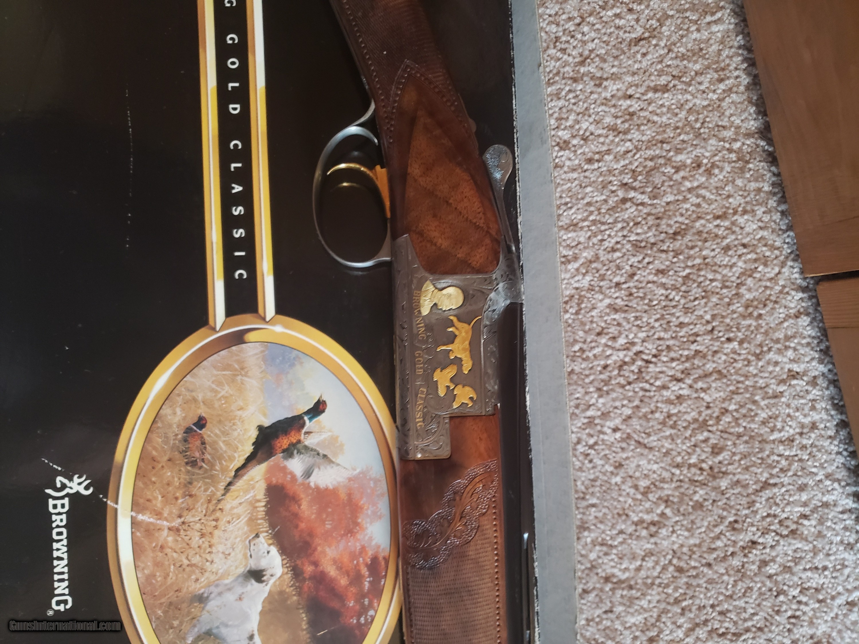 Description: Beautiful Commemorative Browning Gold Classic Superposed Superlight 20 ga, unfired and new in original Browning box. #174 of 500. 100% Belgium-made. SOLD Shotgun Gauge: 20 Gauge Manufacturer: Browning Belgium Model: Superposed Superlight Gold Classic Bore: 20 ga Chambers: 2 3/4 Ejectors: Yes Condition: Unfired new in box Metal Condition: Perfect Wood Condition: Perfect Bore Condition: Perfect Barrels: 26.5 Triggers: Single selective Stock: High-grade walnut Fore End: Schnabel Butt Pad: Original Browning plate LOP: 14 1/4 Rib: Ventilated Finish: Oil Weight: 5.75 lbs Sights: Silver bead Manufacture Date: 1984 Chokes: Mod./Imp cyl. Engraving: Intricately engraved, signed by engraver. Item Location: Minnesota |