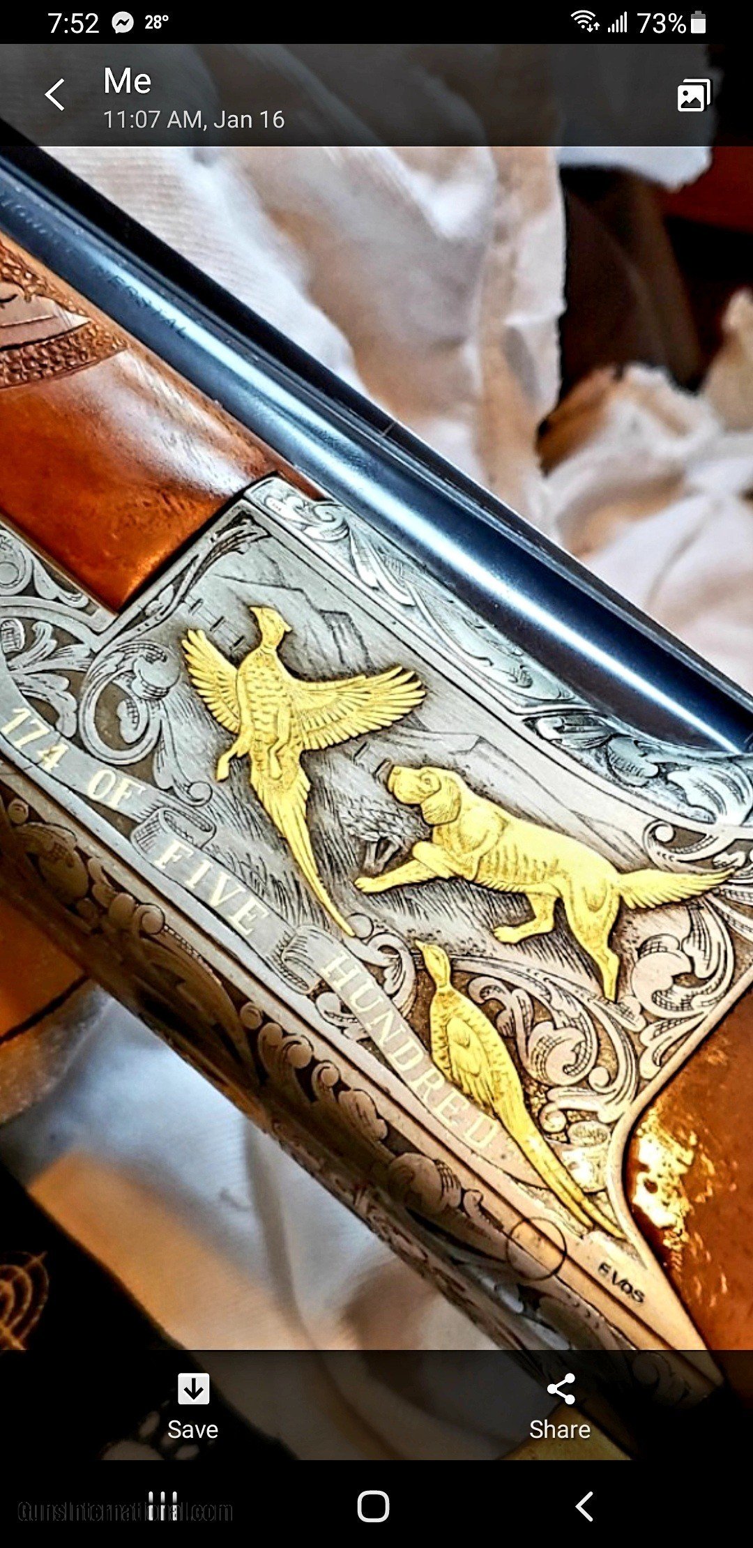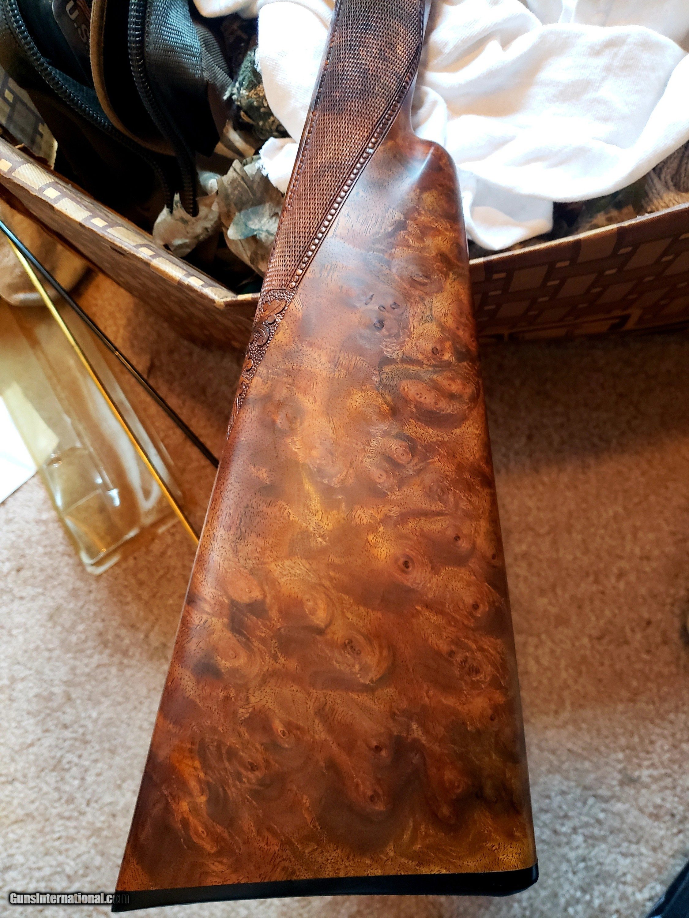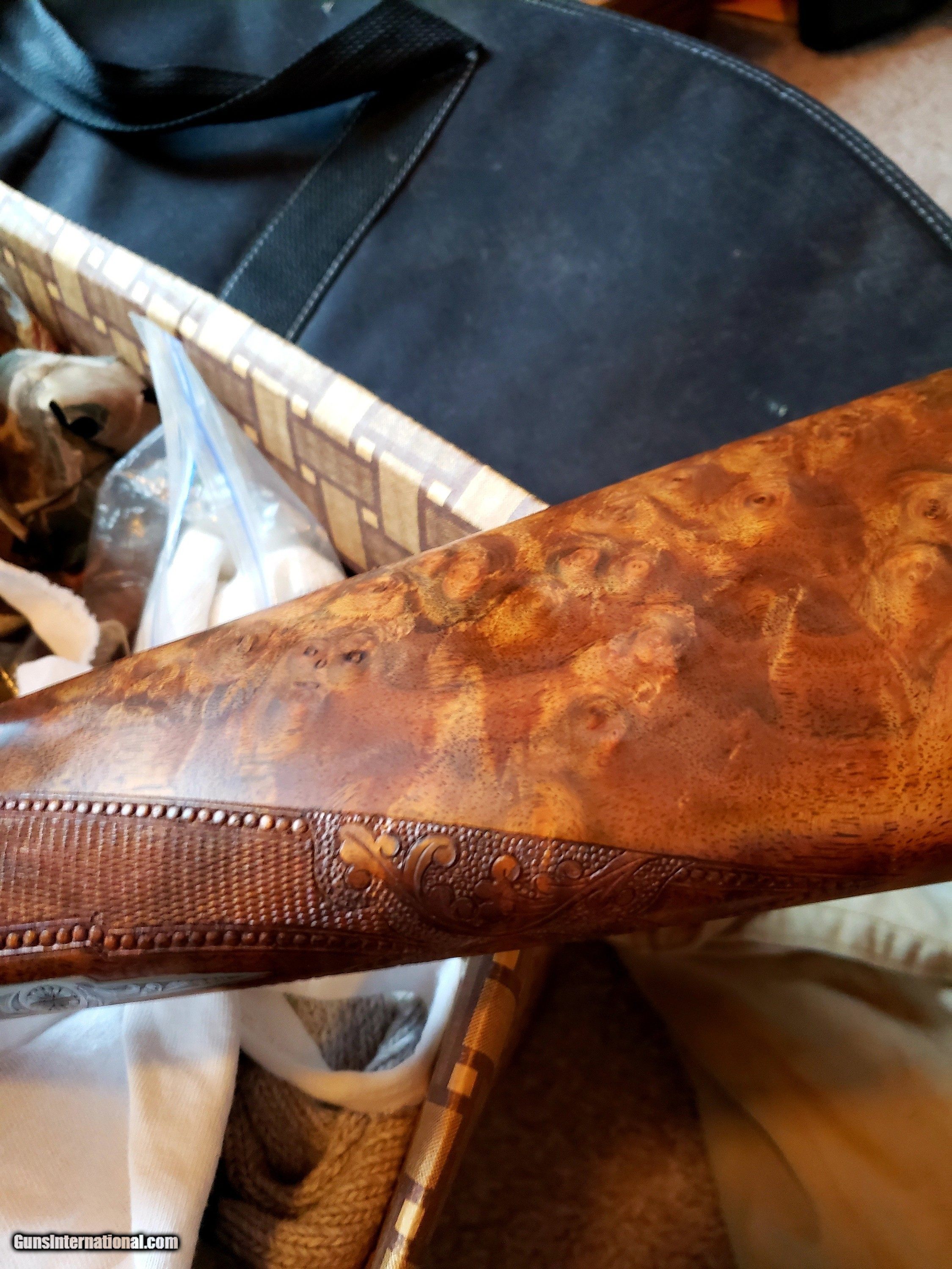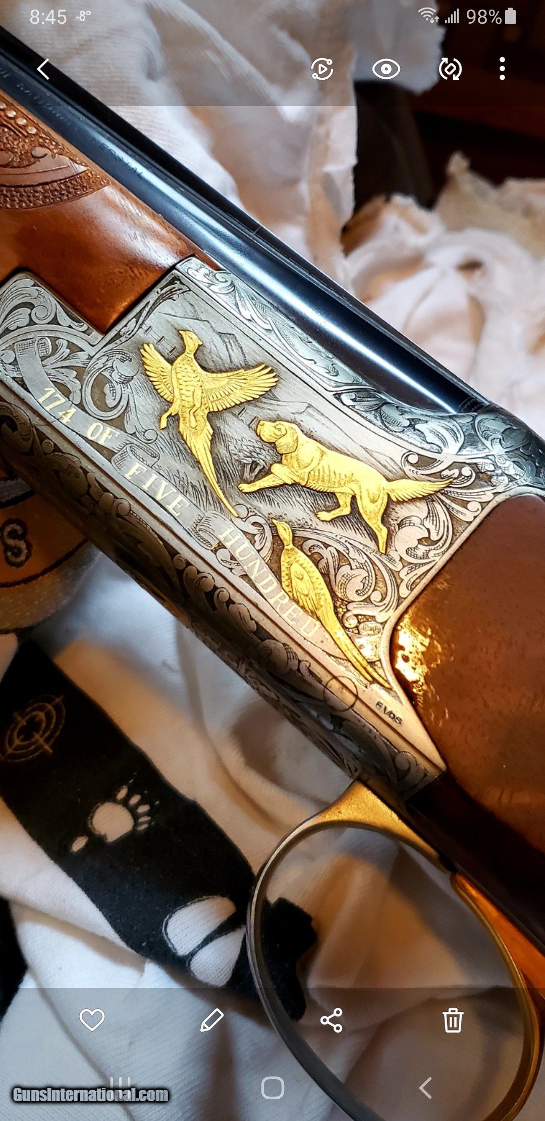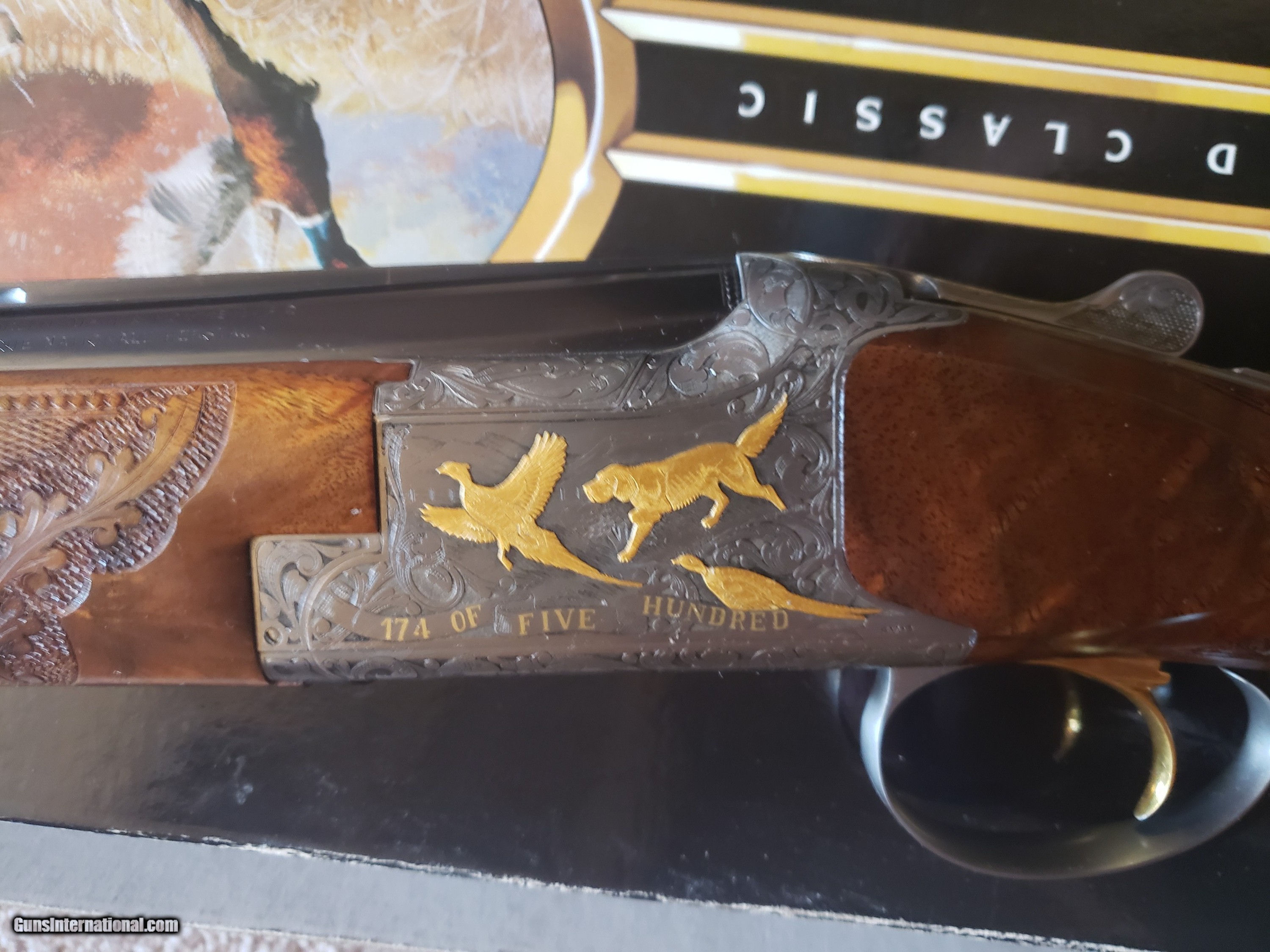 Description: Beautiful Commemorative Browning Gold Classic Superposed Superlight 20 ga, unfired and new in original Browning box. #174 of 500. 100% Belgium-made. SOLD Shotgun Gauge: 20 Gauge Manufacturer: Browning Belgium Model: Superposed Superlight Gold Classic Bore: 20 ga Chambers: 2 3/4 Ejectors: Yes Condition: Unfired new in box Metal Condition: Perfect Wood Condition: Perfect Bore Condition: Perfect Barrels: 26.5 Triggers: Single selective Stock: High-grade walnut Fore End: Schnabel Butt Pad: Original Browning plate LOP: 14 1/4 Rib: Ventilated Finish: Oil Weight: 5.75 lbs Sights: Silver bead Manufacture Date: 1984 Chokes: Mod./Imp cyl. Engraving: Intricately engraved, signed by engraver. Item Location: Minnesota |