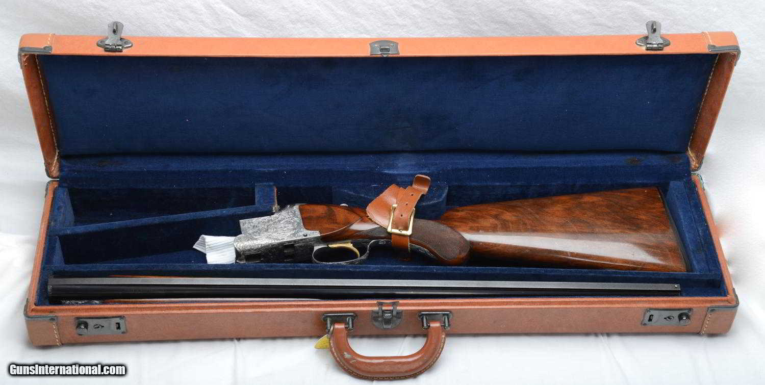 Description: Browning Gr V 12 gauge O/U shotgun. Made in 1952 and exquisitely engraved by one of the original and one of the very best master engravers from Browning, Felix Funken. This game gun has 26 ½” vent rib barrels choked Full/Full with a single metal front bead. The blue in 97-98%, the coin finish is 98%+ and the wood finish is 95% with the major deduction being for light scratches in the finish on right side rear of the buttstock where the gun would rub a vest or jacket when used by a left hand shooter. The buttstock has a 14 ¼” LOP to the original butt plate, 1 9/16” DAC & 2 3/8” DAH with left hand cast of ¼” at the heel and 3/8” at the toe. It weighs 7 lbs. 6 oz. and comes in what appears to be the original Tolex case. This is a very desirable superposed engraved by the Master Funken. SOLD Curio/Relic: Yes |