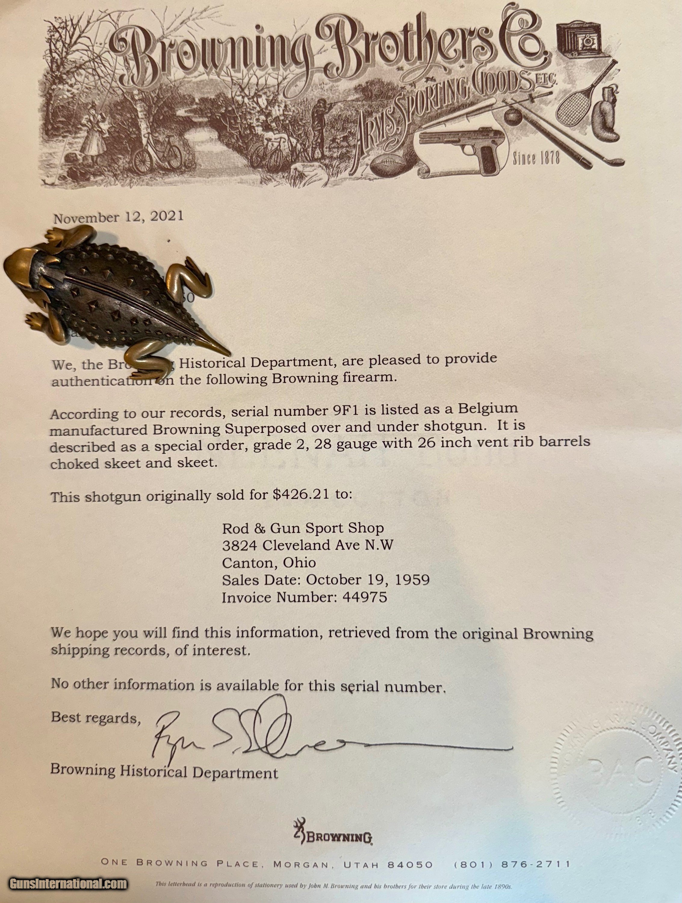Description: BROWNING GRADE II “PIGEON” 28GA SN: 9F1 SERIAL NUMBER ONE 1959 THE MOST HISTORICALLY SIGNIFICANT OF ITS’S GRADE