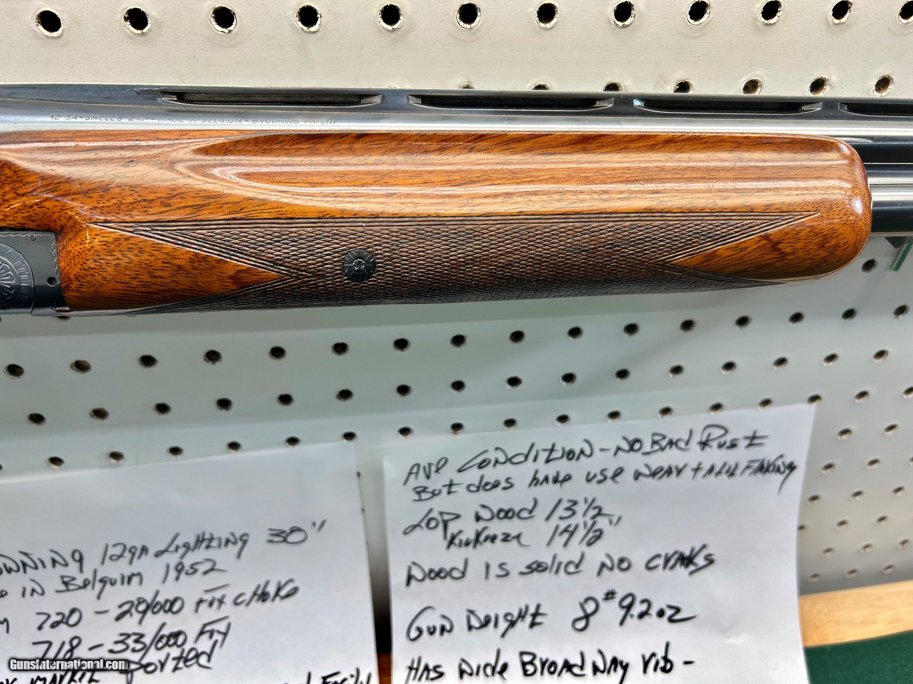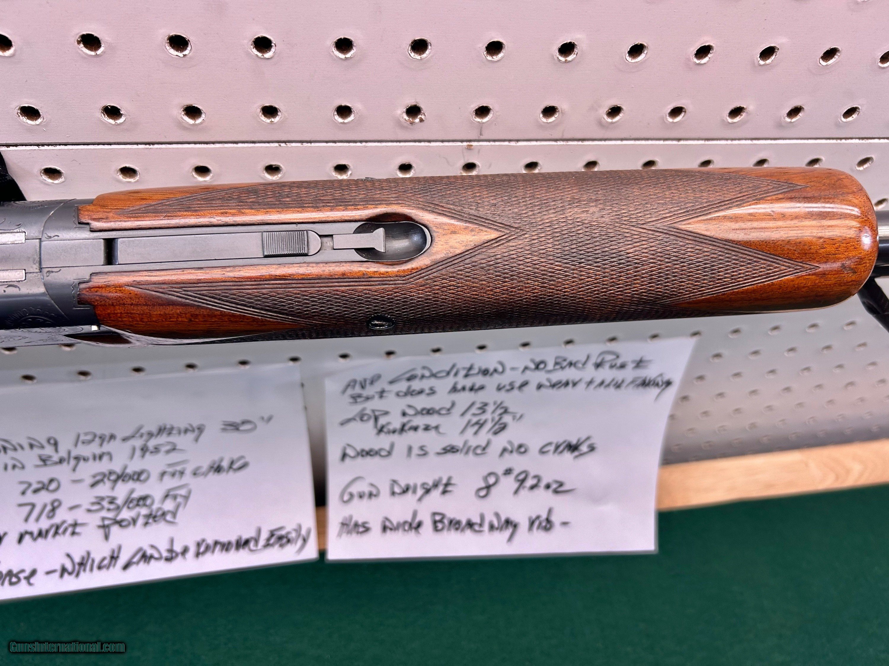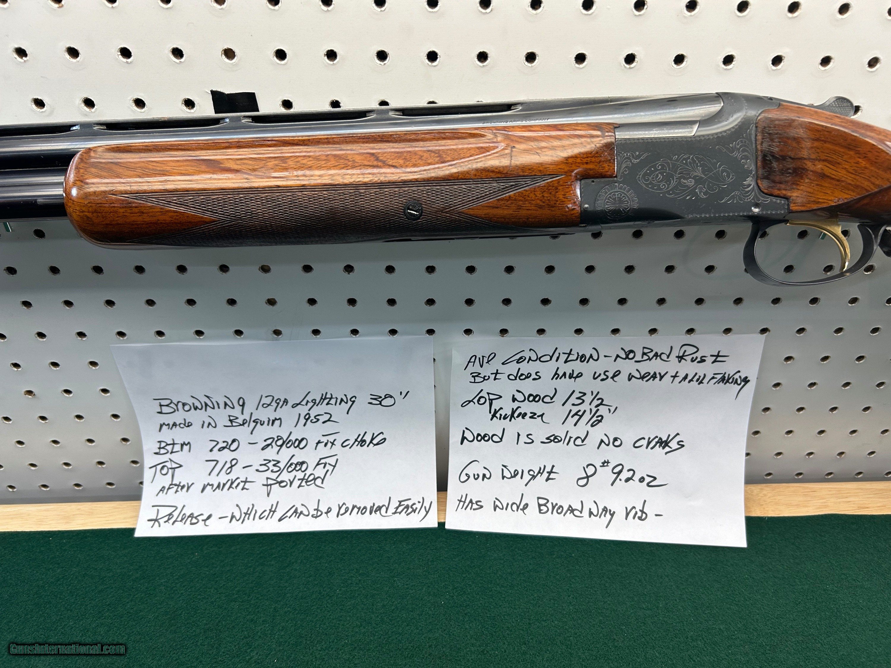 Description: browning grand lighting - 30" - belgium 1952 btm 720 bore 20/000 choke -- top 718 bore 33/000 choke aftermarket ported - release trigger ( can easily be converted to pull) LOP wood 131/2" w/ kickeeze pad 141/2" average condition - no deep pitting normal use wear and a lil specking on lower side of barrel - wood solid no cracks SOLD Shotgun Gauge: 12 Gauge Manufacturer: browning Model: grand lighting Barrel Length: 30 Bore: clean Chambers: clean Condition: average Metal Condition: average Wood Condition: average Bore Condition: clean Barrel Type: over under Stock Dimensions: 131/2 Stock Drop: 11/2 |