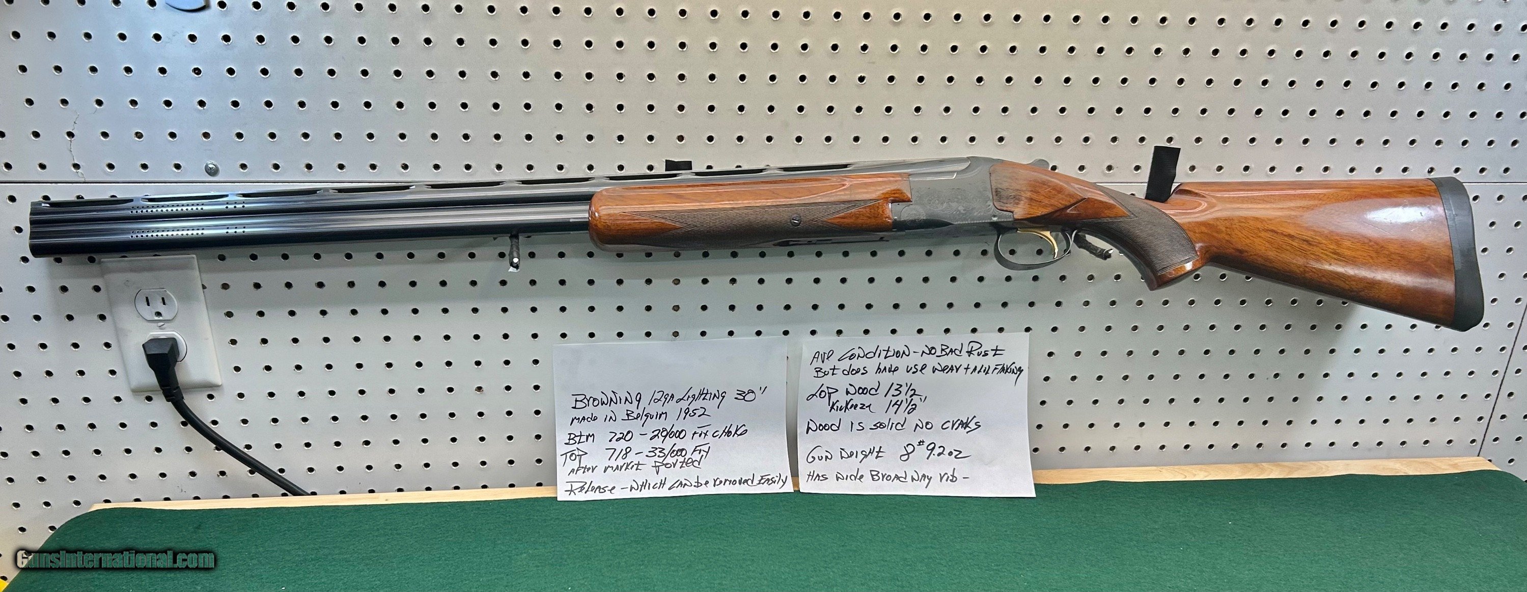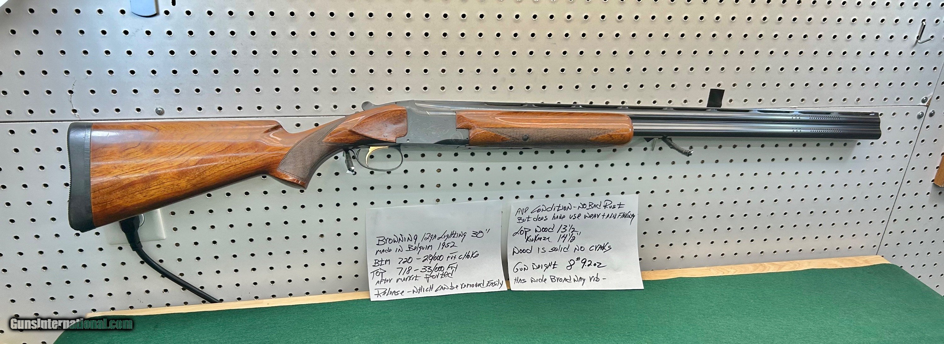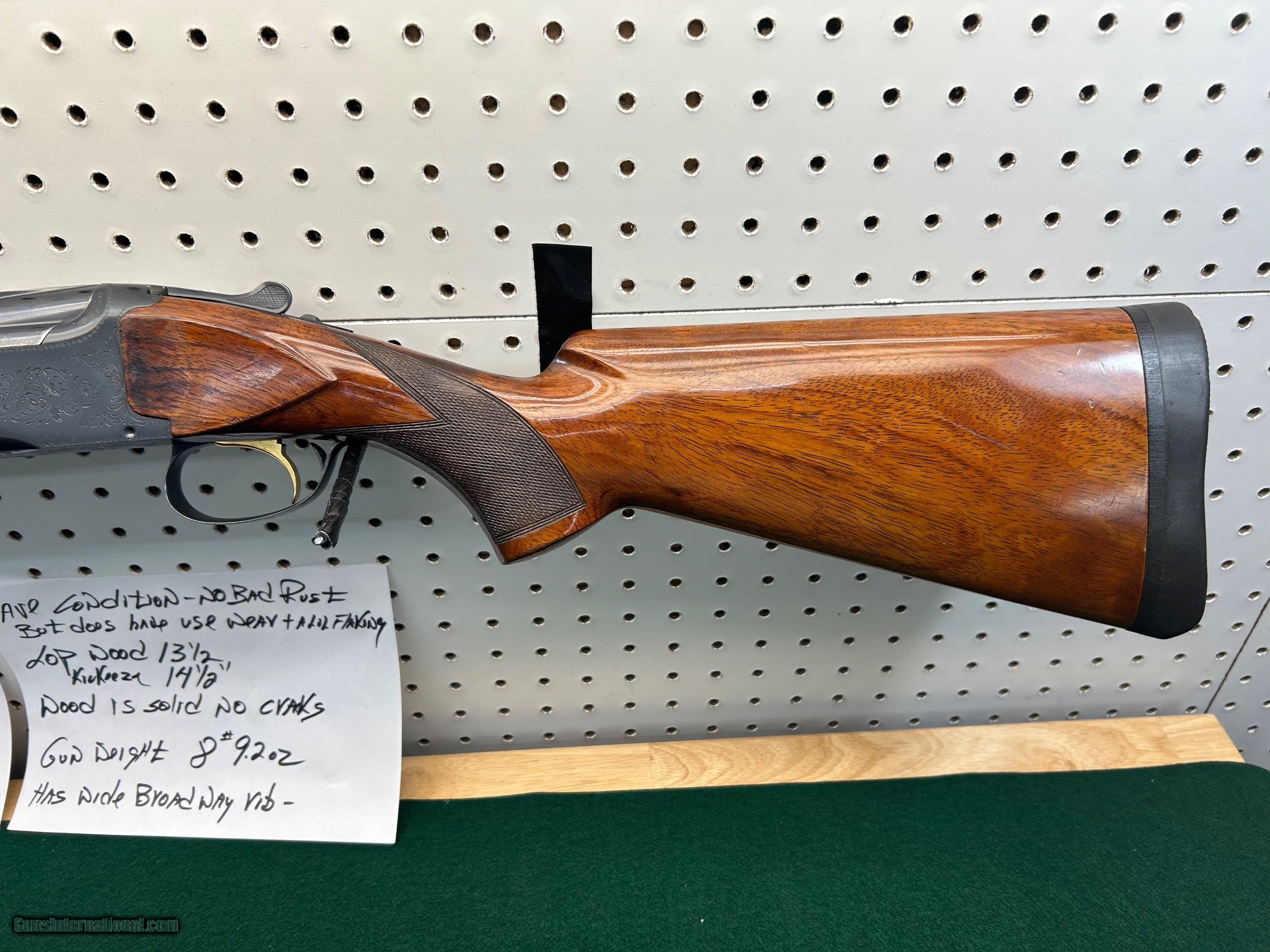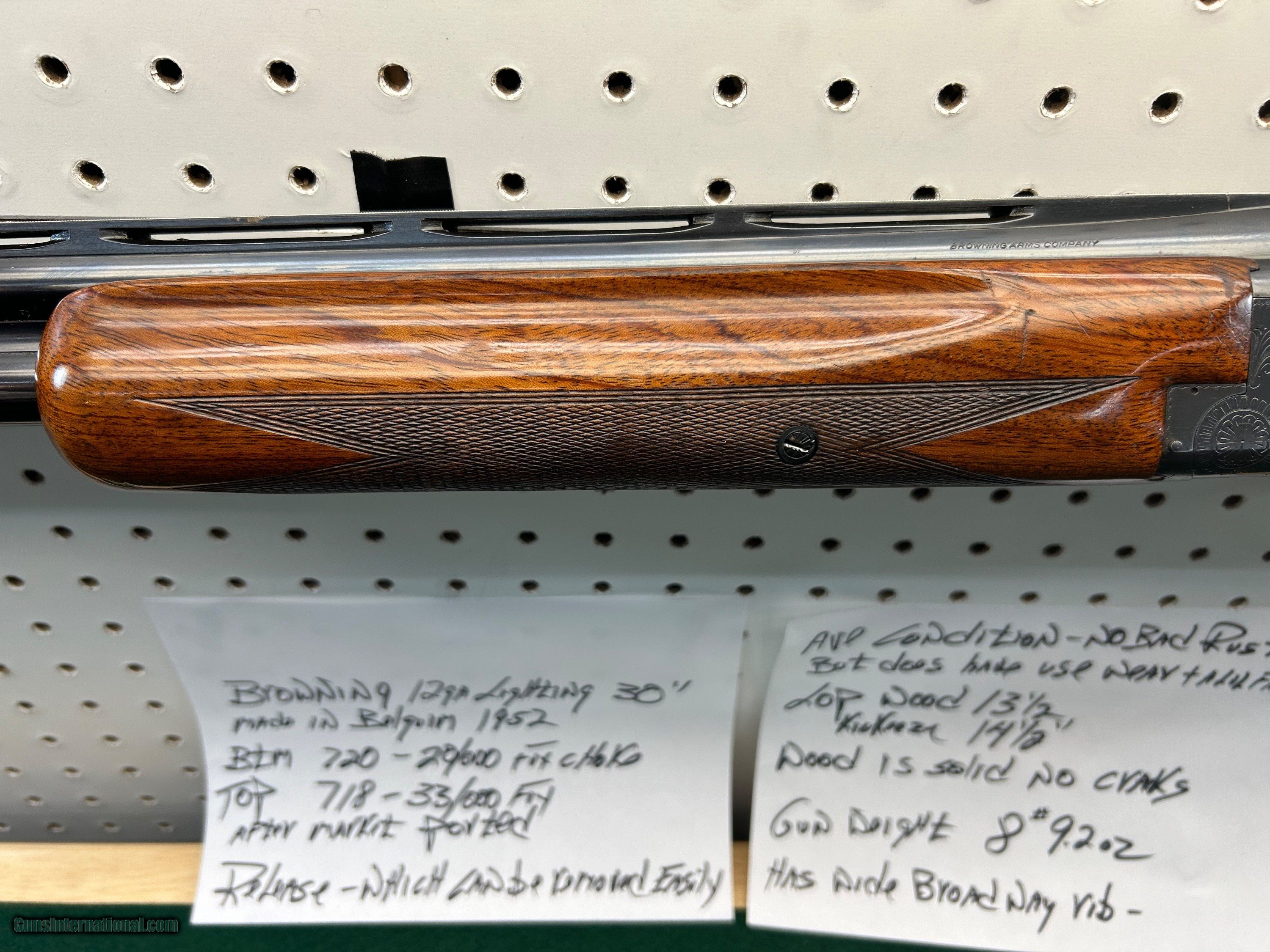 Description: browning grand lighting - 30" - belgium 1952 btm 720 bore 20/000 choke -- top 718 bore 33/000 choke aftermarket ported - release trigger ( can easily be converted to pull) LOP wood 131/2" w/ kickeeze pad 141/2" average condition - no deep pitting normal use wear and a lil specking on lower side of barrel - wood solid no cracks SOLD Shotgun Gauge: 12 Gauge Manufacturer: browning Model: grand lighting Barrel Length: 30 Bore: clean Chambers: clean Condition: average Metal Condition: average Wood Condition: average Bore Condition: clean Barrel Type: over under Stock Dimensions: 131/2 Stock Drop: 11/2 |
