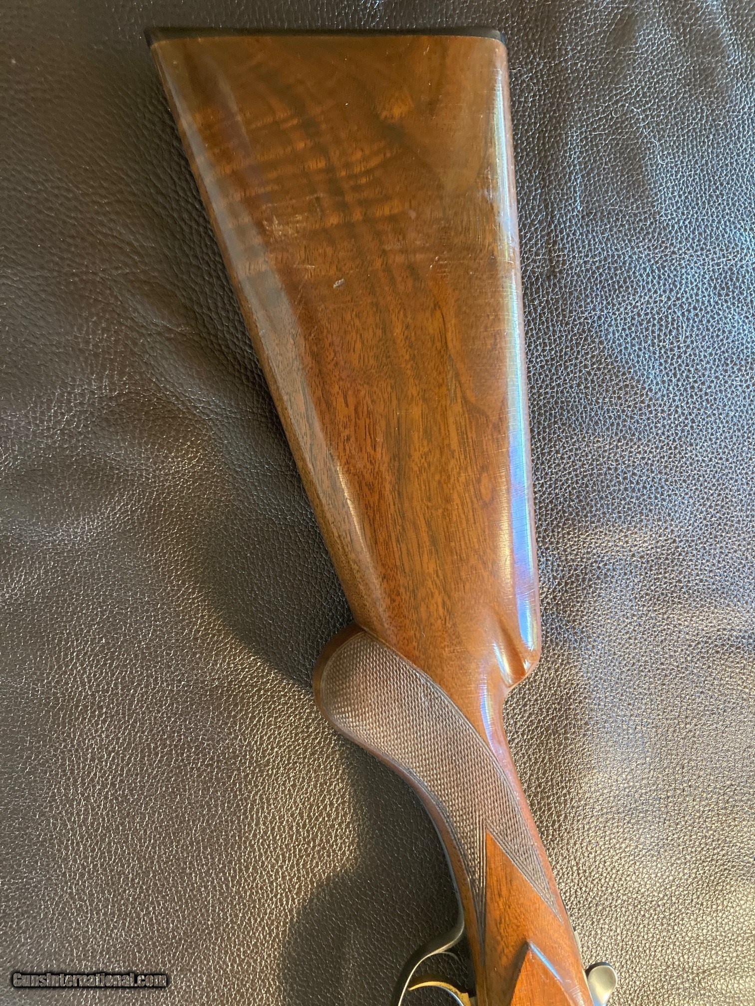 Description: A well preserved, original and used Belgium Superposed. Pictures show wear on blueing where carried in the field. Bores are immaculate. 26." barrels. Chokes are * and **. And given its age, it has the beautiful and increasingly hard to find round nob stock and long trigger tang. Serial number 39840 V5, made in 1965. SOLD Shotgun Gauge: 20 Gauge |