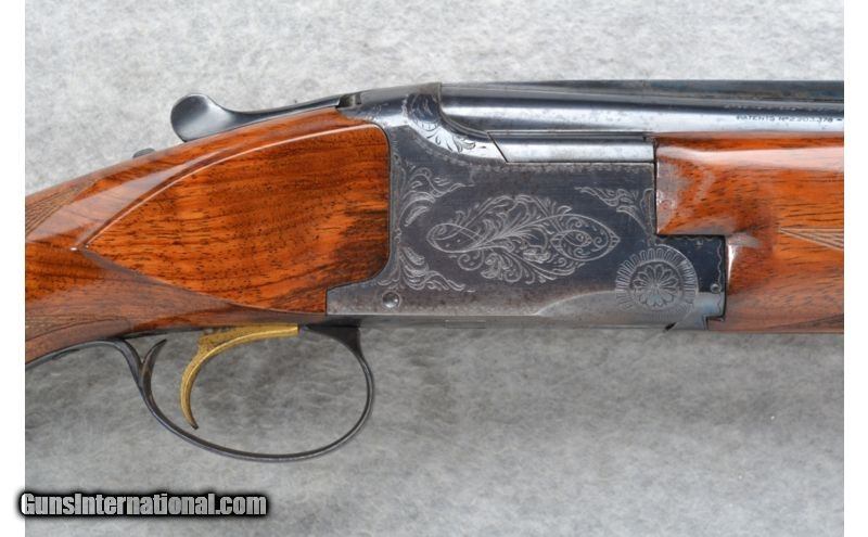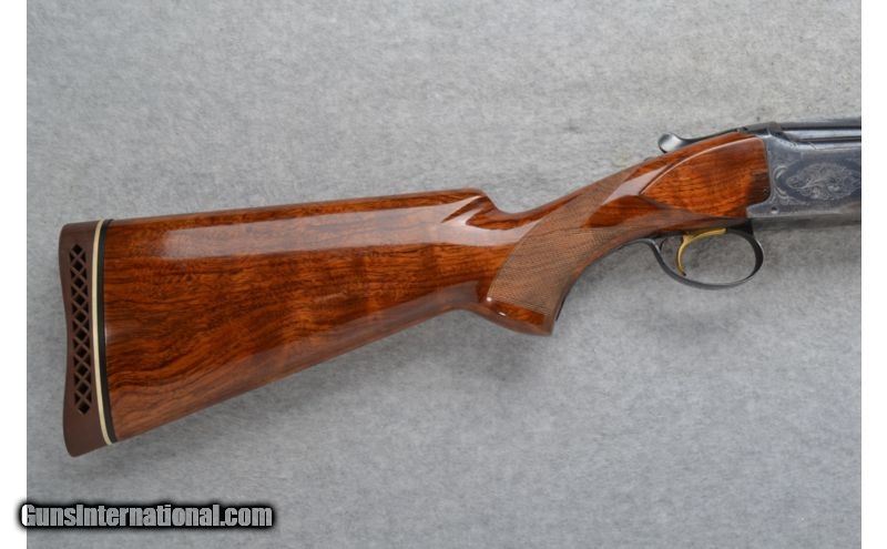 Description: Very nice lightly engraved receiver. SOLD Manufacturer: Made in Belgium. Caliber Info: 12 GA Chambers: 2 3/4 inch. Metal Condition: Good. Light wear, handling marks and freckling. Wood Condition: Good. Handling marks. Two fine cracks at back side of the trigger guard. Bore Condition: Shiny Barrels: 30 inches with a ventilated rib. Triggers: Single golden. Stock: Checkered grip high gloss walnut pistol grip. Stock Dimensions: LOP 14 3/8 inches. Fore End: Checkered grip high gloss walnut with finger grooves. Butt Pad: Browning rubber recoil pad. Weight: 8 lbs. 5 oz. Sights: White front and middle beads. Chokes: Fixed Full and Imp. Mod. Item Location: Richfield, WI |