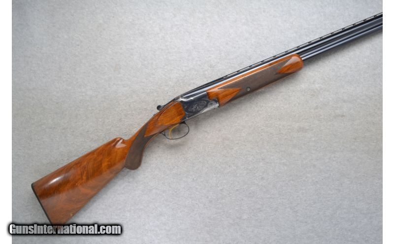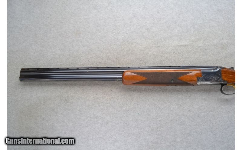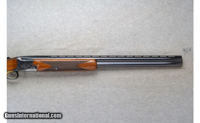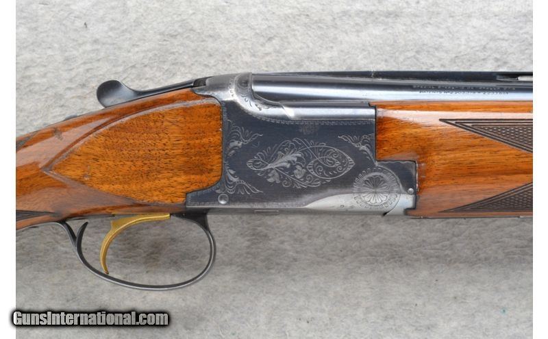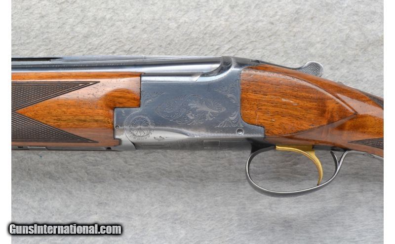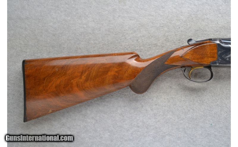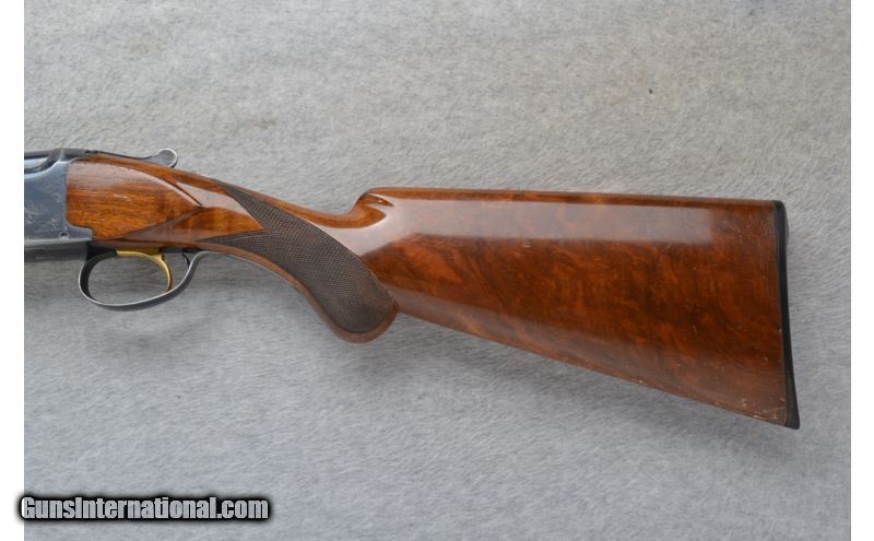 Description: This Browning Model Lightning is a 12 Ga. over and under shotgun. It has 26.5 inch barrels with ejectors and a top barrel ventilated rib. A metal front bead sight. In 2 3/4 inch chamber it has fixed Mod. and Imp. Cyl. chokes. The stock is a checkered walnut round knob grip butt and checkered walnut forearm. The receiver is lightly engraved. This gun does show some wear. SOLD Manufacturer: Made in Belgium. Caliber Info: 12 Ga. Chambers: 2 3/4 inch Over / Under with Ejectors. Metal Condition: Good. Has blue wear and light handling marks. Wood Condition: Fair. Shows use. Multiple handling marks. Bore Condition: Bright and shiny. Barrels: 26.5 inch blued with a top barrel ventilated rib. Triggers: Single Golden. Stock: Checkered walnut round knob. Stock Dimensions: LOP 14 1/8 inches. Fore End: Checkered grip walnut. Butt Pad: Browning black plate. Weight: 7 lbs. 9 oz. Sights: Metal front bead. Chokes: Fixed Mod. & Imp. Cyl. Item Location: Richfield, WI |