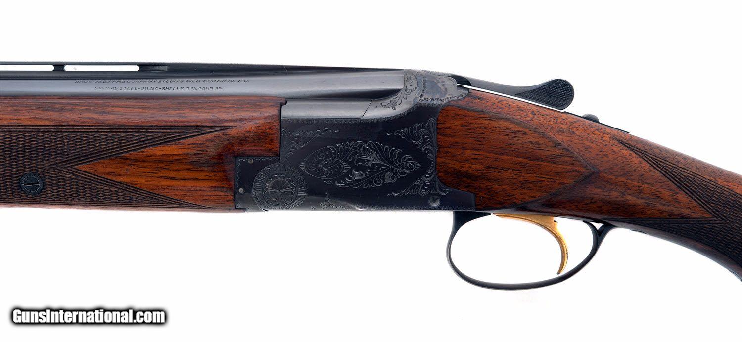 Description: Browning - Lightning - 20 ga - Item Number: BRO17284 Shotgun type: O&U Action: Boxlock Ejectors: Yes Trigger: Single Grip: Rounded Pistol Grip Forend: Checkered Lop: 14 1/4 " Pad thickness: 0.25 " Type of butt: Factory Drop comb: 1 5/8 " Drop heel: 2 3/8 " Cast amount: 1/8 " Cast: Off Weight: 6 lbs, 4 oz Manufactured in: Belgium Manufacture Year: Finish: Blue Overall condition: Good Stock condition: Good Metal condition: Good Stock: Original finish Metal: Original finish Type of Case: none Extra barrels: 0 Barrel info: Gauge: 20 ga Chamber: 3 " Length: 26 " Chokes: IC/M Rib type: Ventilated Comments : Gun is in good condition with typical wear and handling for its age. SG-56 SOLD |