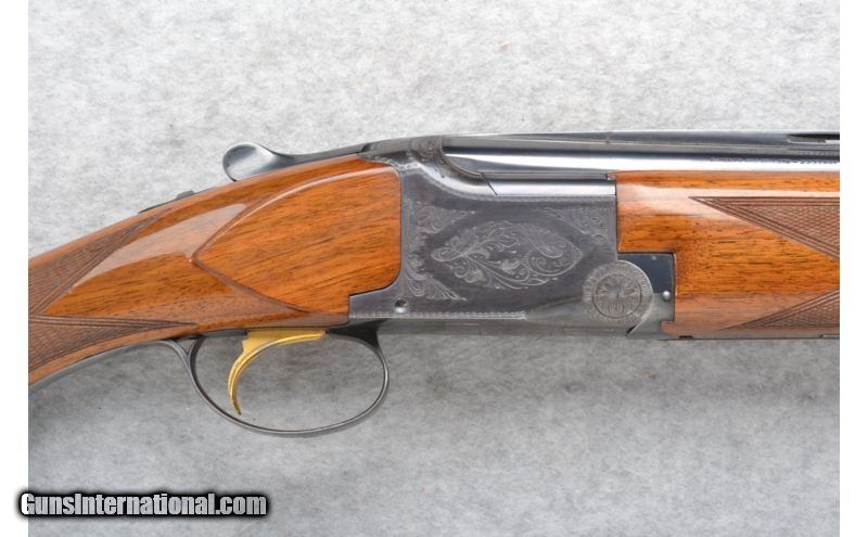 Description: Reciever is lightly engraved with scroll. SOLD Manufacturer: Made in Belgium. Caliber Info: 12 GA Chambers: 2 3/4 inch. Both barrel sets. Metal Condition: Both barrels sets are in very good condition with a spot or two of minor freckling. Receiver has some minor blue wear. Wood Condition: Very good with handling marks. Bore Condition: Shiny Barrels: 26.5 inch (ported) and 28 inch (non-ported) with ventilated ribs. Triggers: Single gold. Stock: Checkered walnut round knob grip. Stock Dimensions: LOP 14 1/8 inches. Fore End: Checkered walnut both barrel sets. Butt Pad: Pachmayr White Line rubber recoil pad. Weight: 7 lbs. 12 oz. with the 26.5 inch barrel set. Sights: 26.5 inch has brass beads. 28 inch has white beads. Chokes: 26.5 inch - fixed Modified both barrels. 28 inch - fixed Full and Modified. Item Location: Richfield, WI |