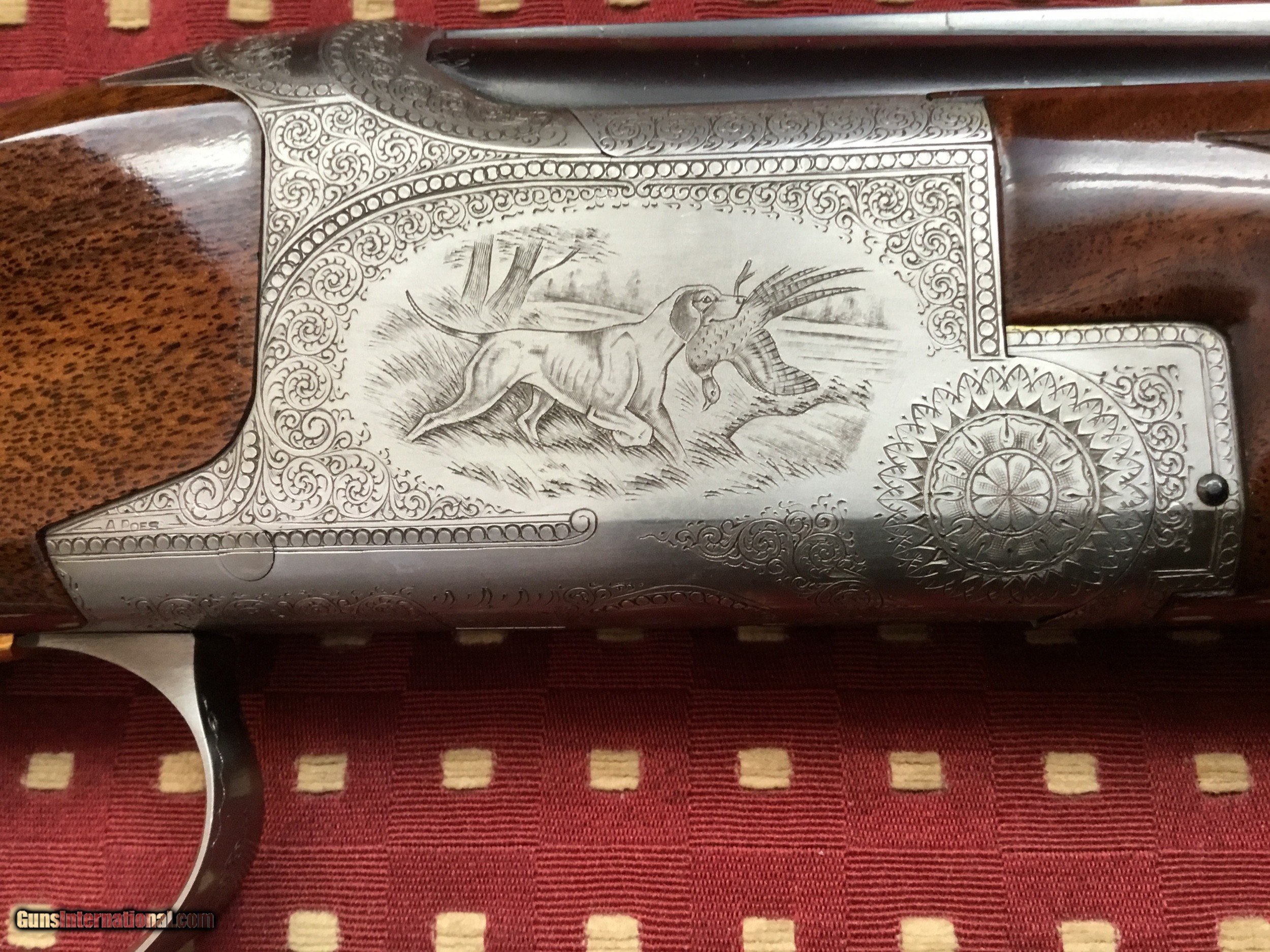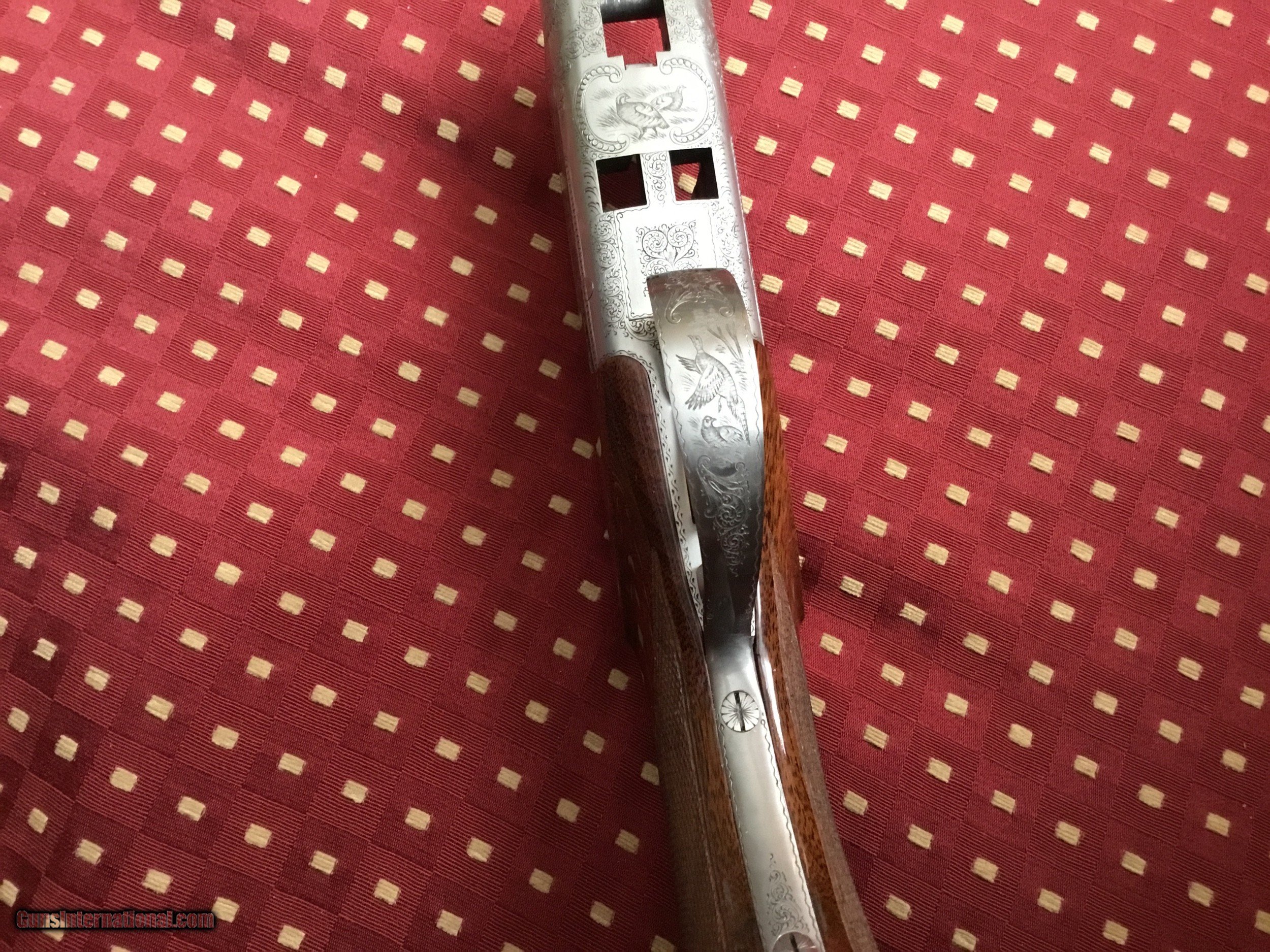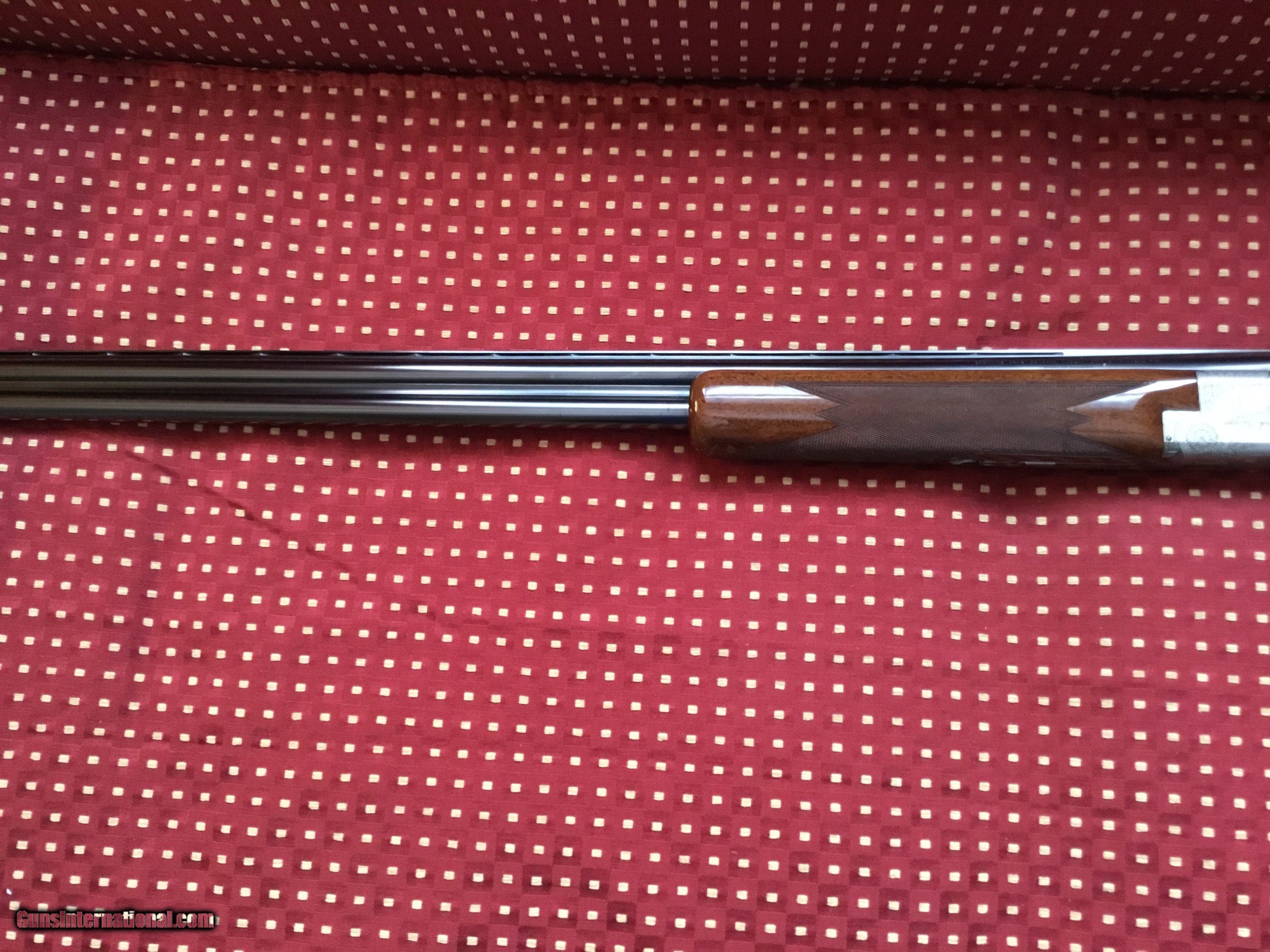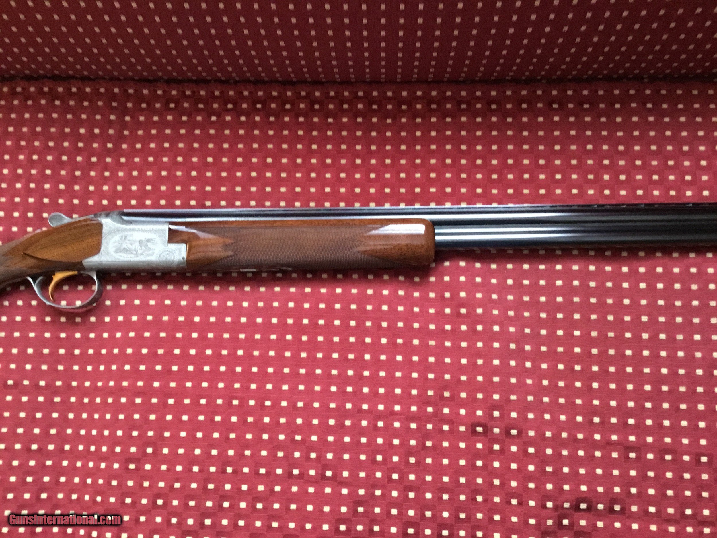 Description: Very desirable Pointer grade round knob long tang 20 ga.with 28" barrels choked Full and Mod. with 3" chambers. Beautifully engraved and signed once by M Bodson and twice by A. Poes. Outstanding feathercrotch buttstock. Made in 1980. Appears unfired, no knicks, dings or scratches in wood or metal. Original box with factory letter and manual SOLD |