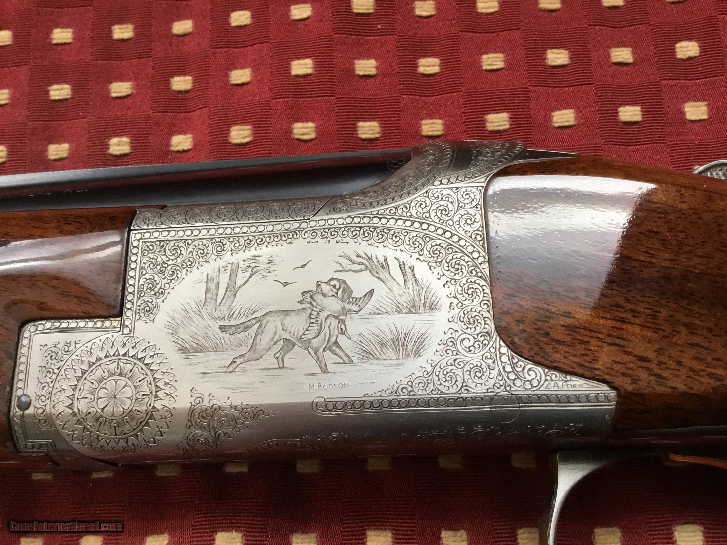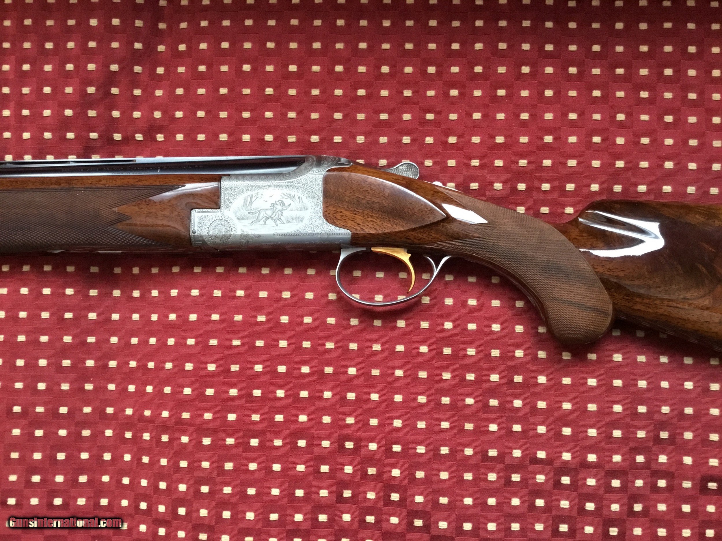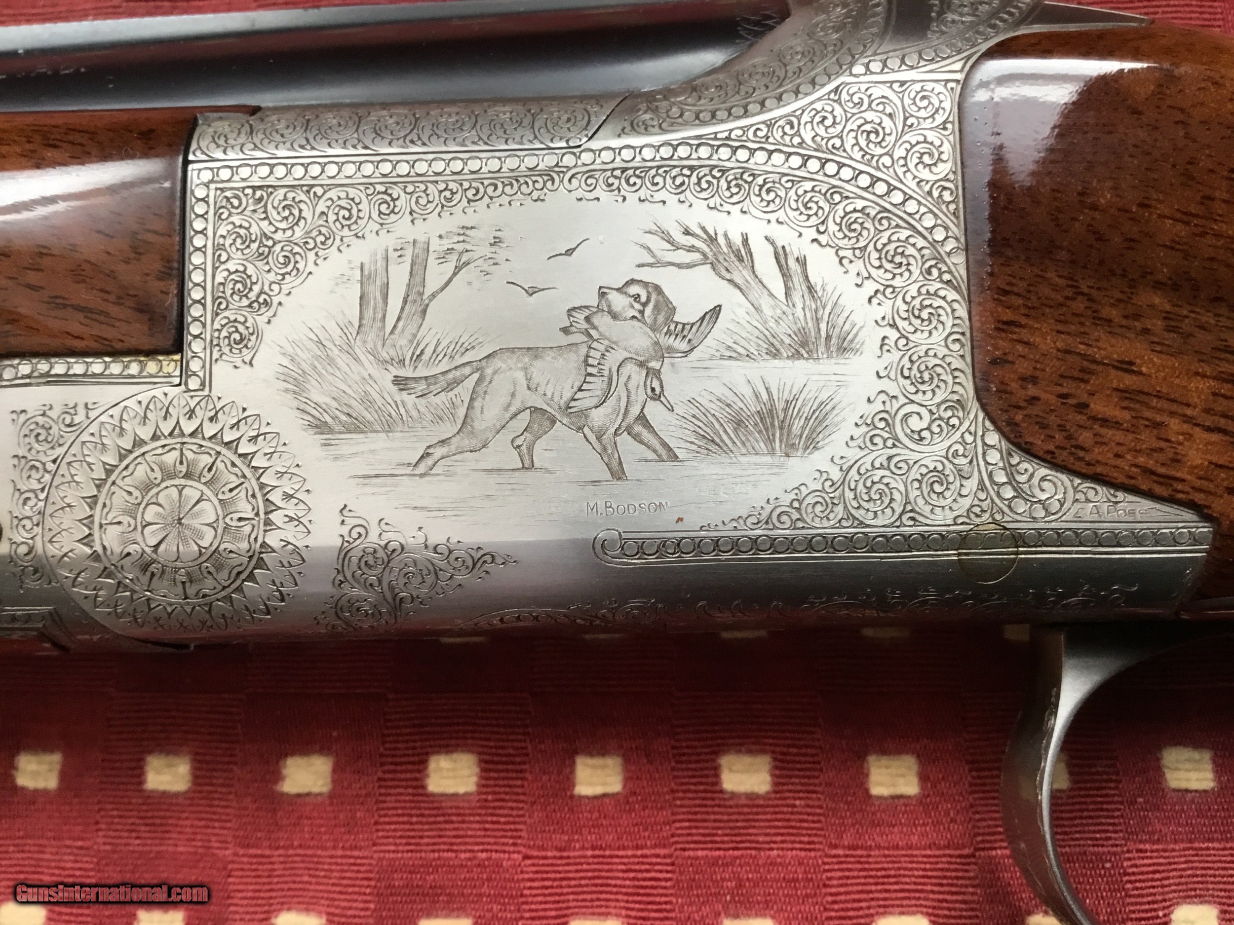 Description: Very desirable Pointer grade round knob long tang 20 ga.with 28" barrels choked Full and Mod. with 3" chambers. Beautifully engraved and signed once by M Bodson and twice by A. Poes. Outstanding feathercrotch buttstock. Made in 1980. Appears unfired, no knicks, dings or scratches in wood or metal. Original box with factory letter and manual SOLD |