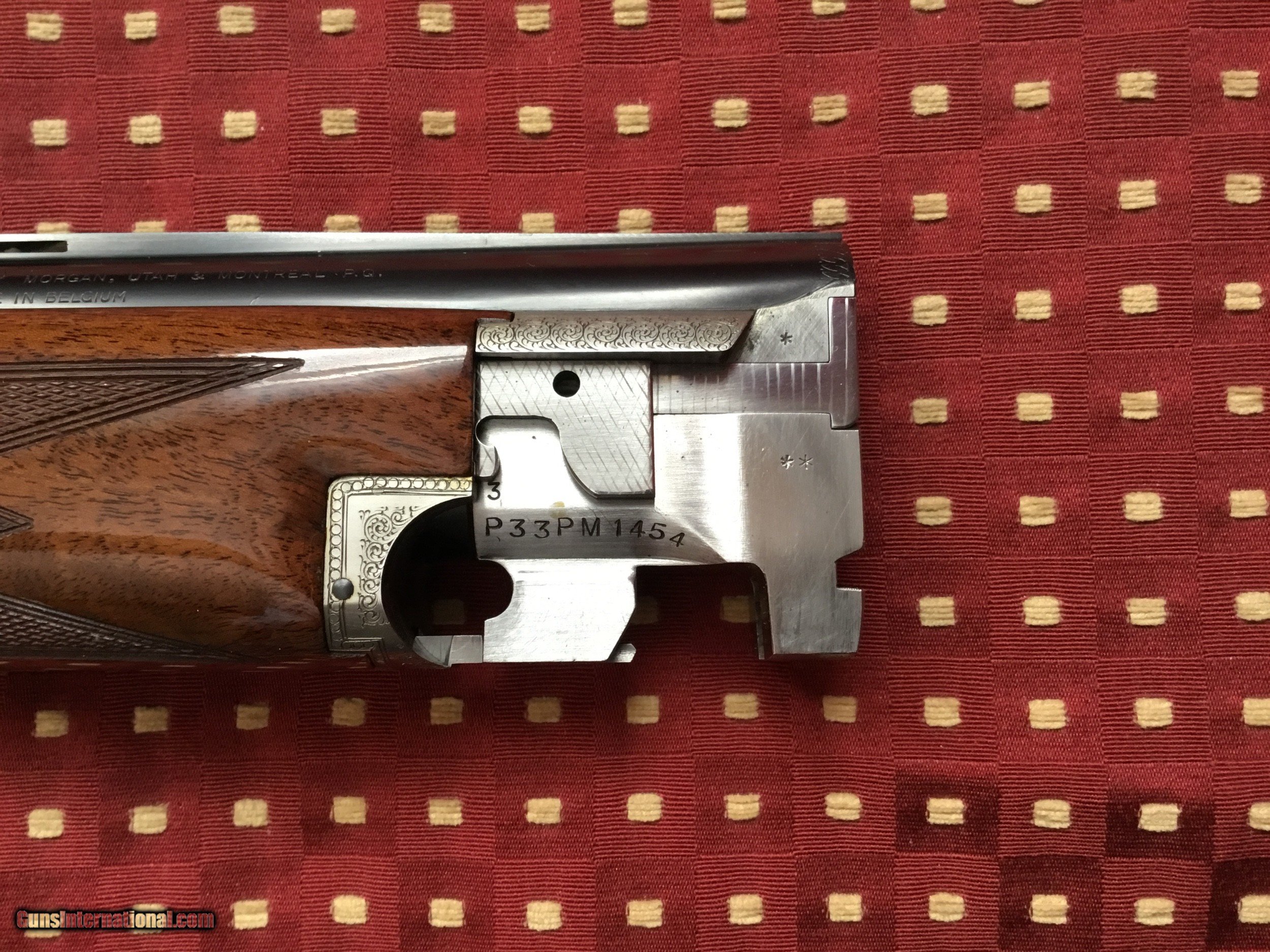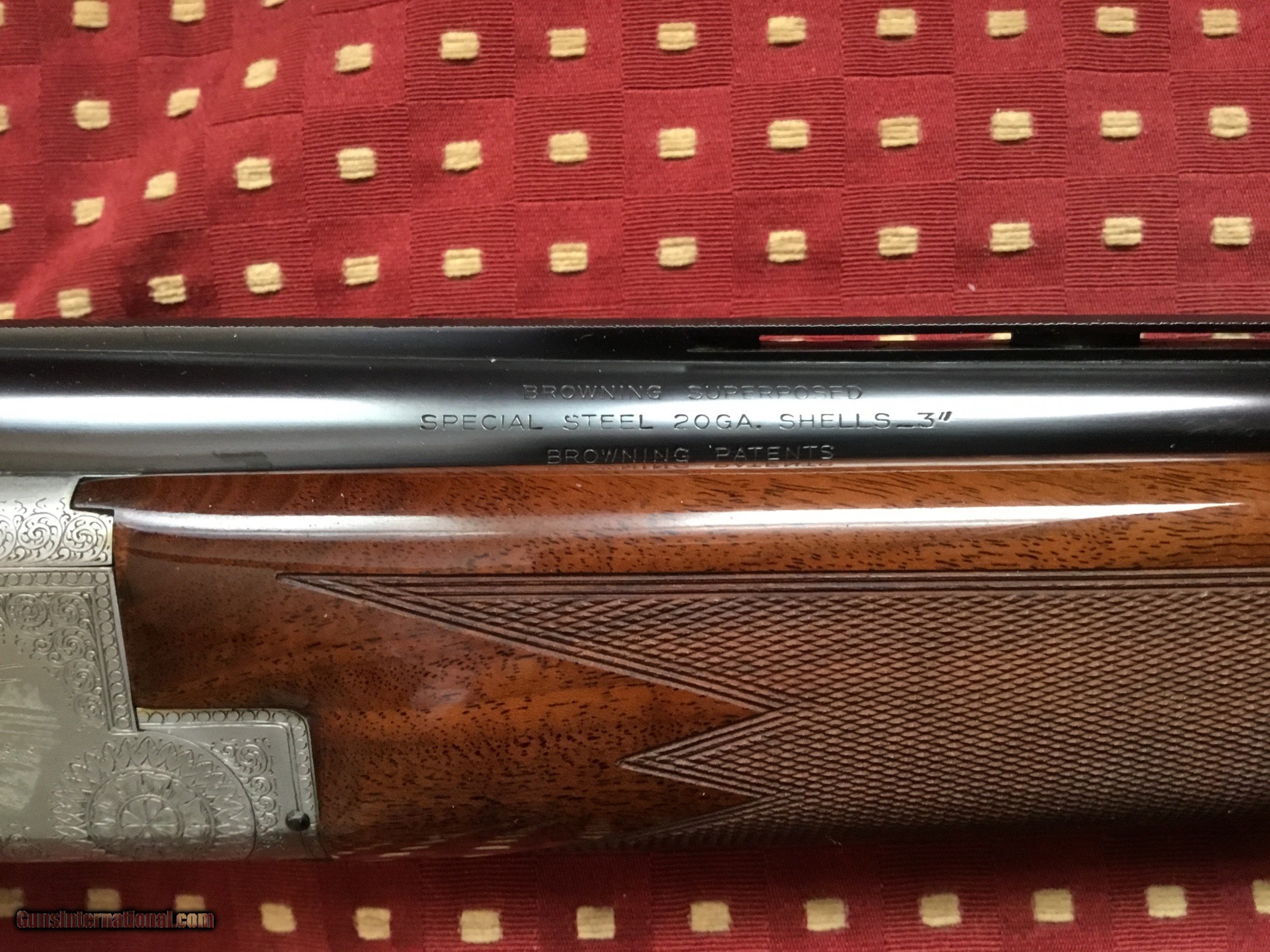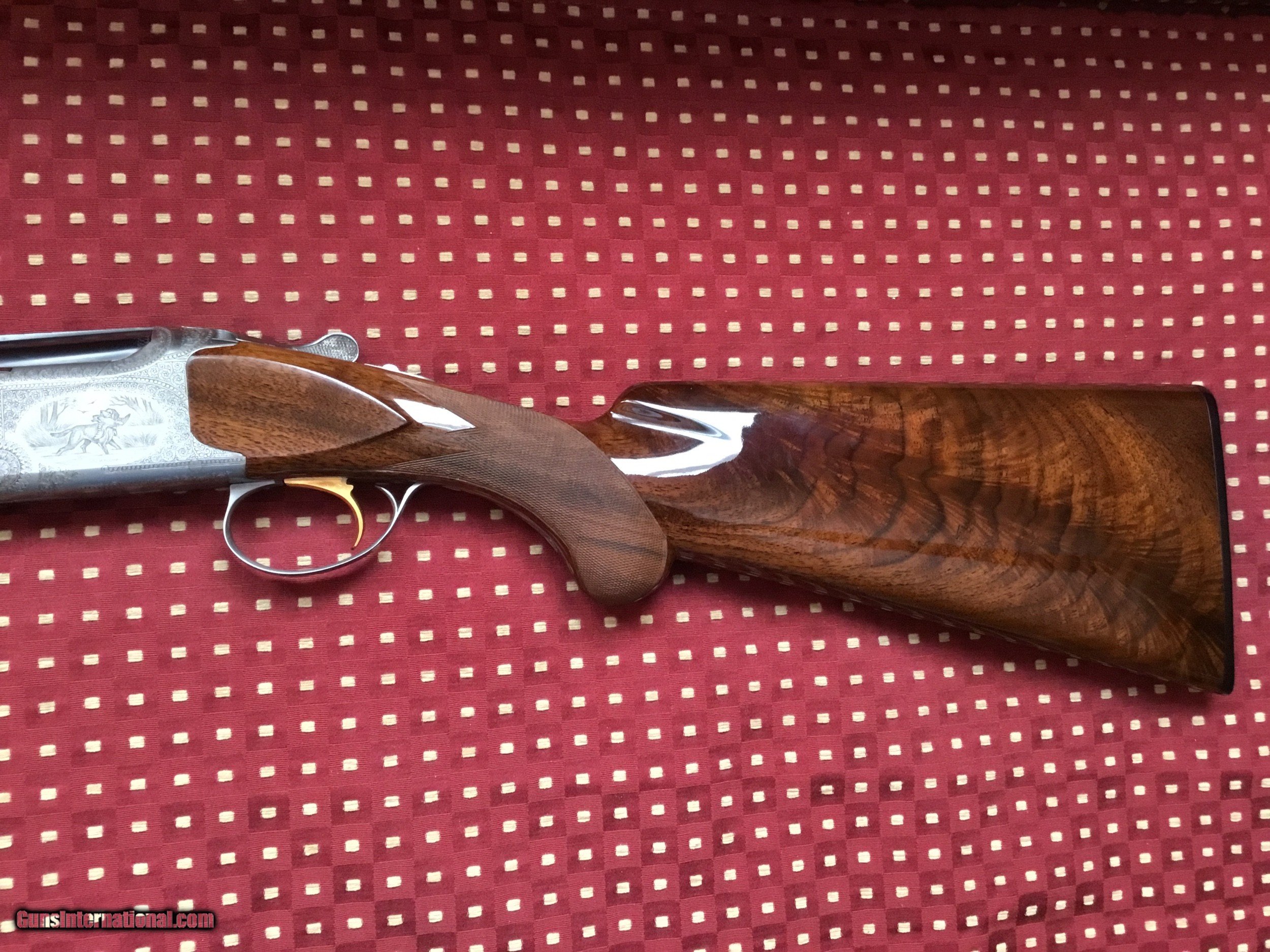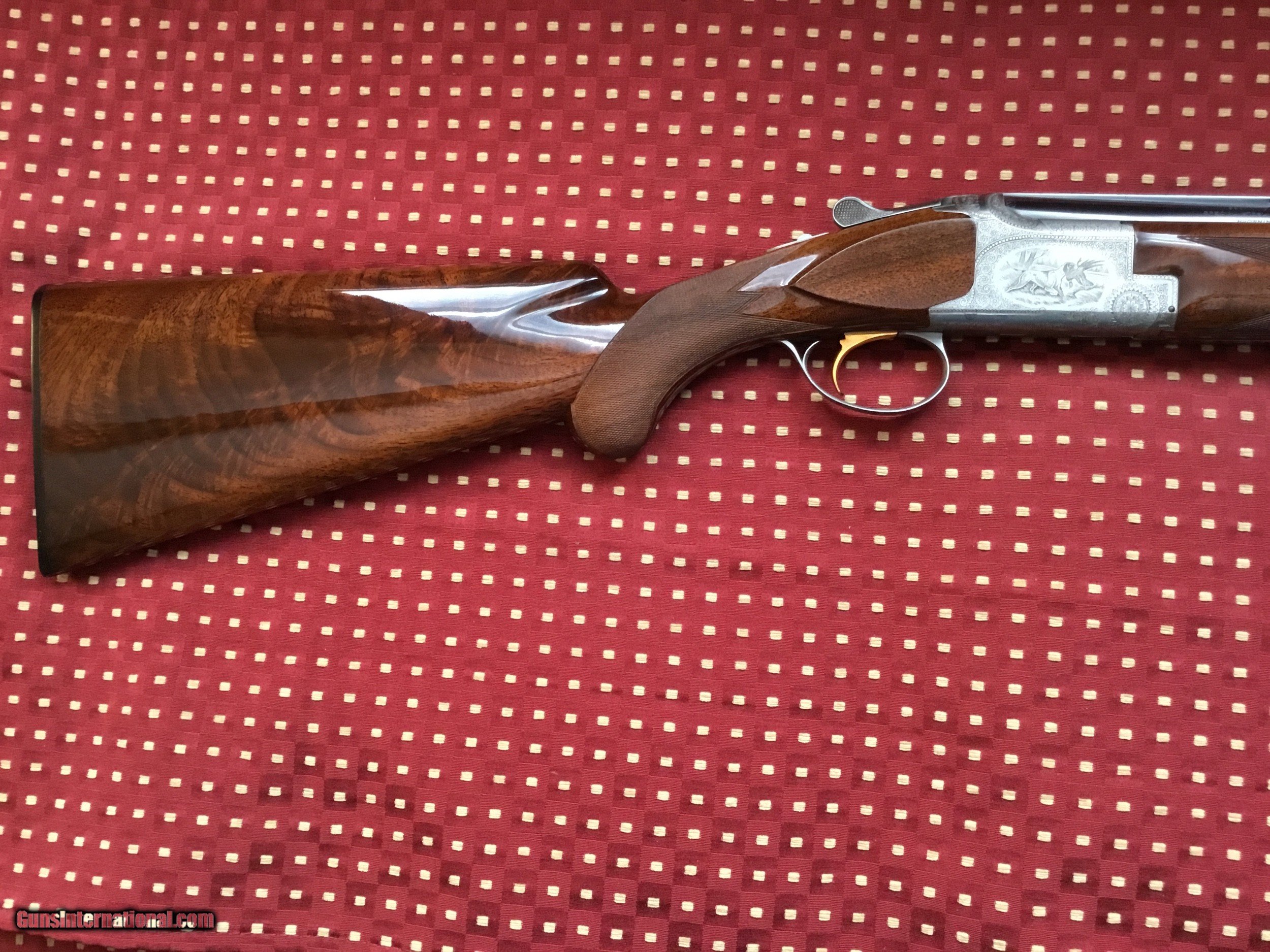 Description: Very desirable Pointer grade round knob long tang 20 ga.with 28" barrels choked Full and Mod. with 3" chambers. Beautifully engraved and signed once by M Bodson and twice by A. Poes. Outstanding feathercrotch buttstock. Made in 1980. Appears unfired, no knicks, dings or scratches in wood or metal. Original box with factory letter and manual SOLD |