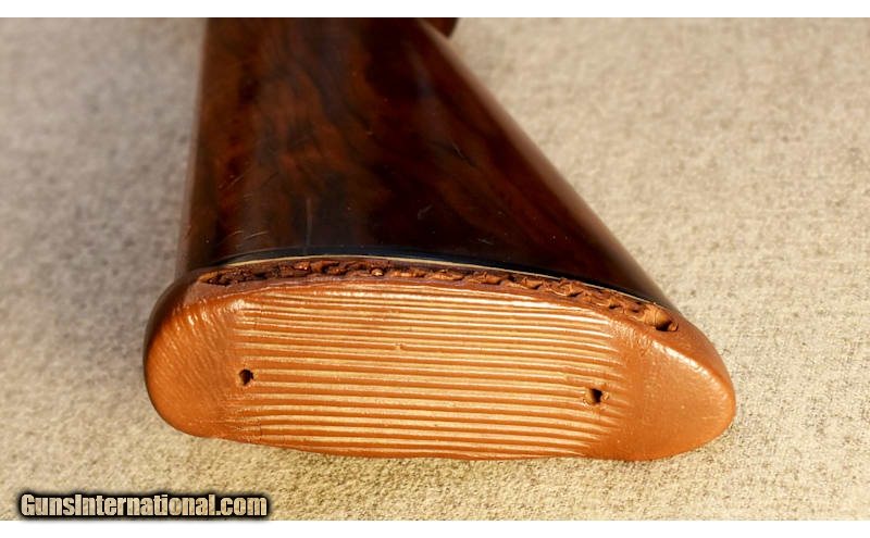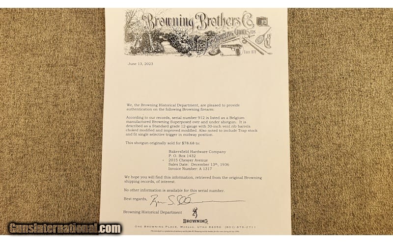 Description: This is a pre-owned. Pre-war Browning Superposed in 12 gauge, originally sold in 1936 with 30-inch vent rib barrels, single selective trigger, horseshoe style fore end, early Ogden Utah address on the barrel and a copy of the factory letter 12 Gauge SOLD Chambers: 2 3/4 Metal Condition: "70% to 75% of the blue remains with the majority of the wear on the lower portion of the receiver, the trigger guard and tang Wood Condition: "Good overall condition with some handling wear including numerous scratches and dents, no cracks or splits Bore Condition: Clean and bright Barrels: 30 Triggers: Single selective Stock Dimensions: 13 3/4" LOP Fore End: "Checkered walnut, horseshoe style Butt Pad: Compressed Mershon pad Weight: 7 Lbs. 12 Oz. Sights: Brass front and mid-bead Chokes: Fixed (Imp. Mod. ~ Modified) Item Location: Glendale, AZ |
