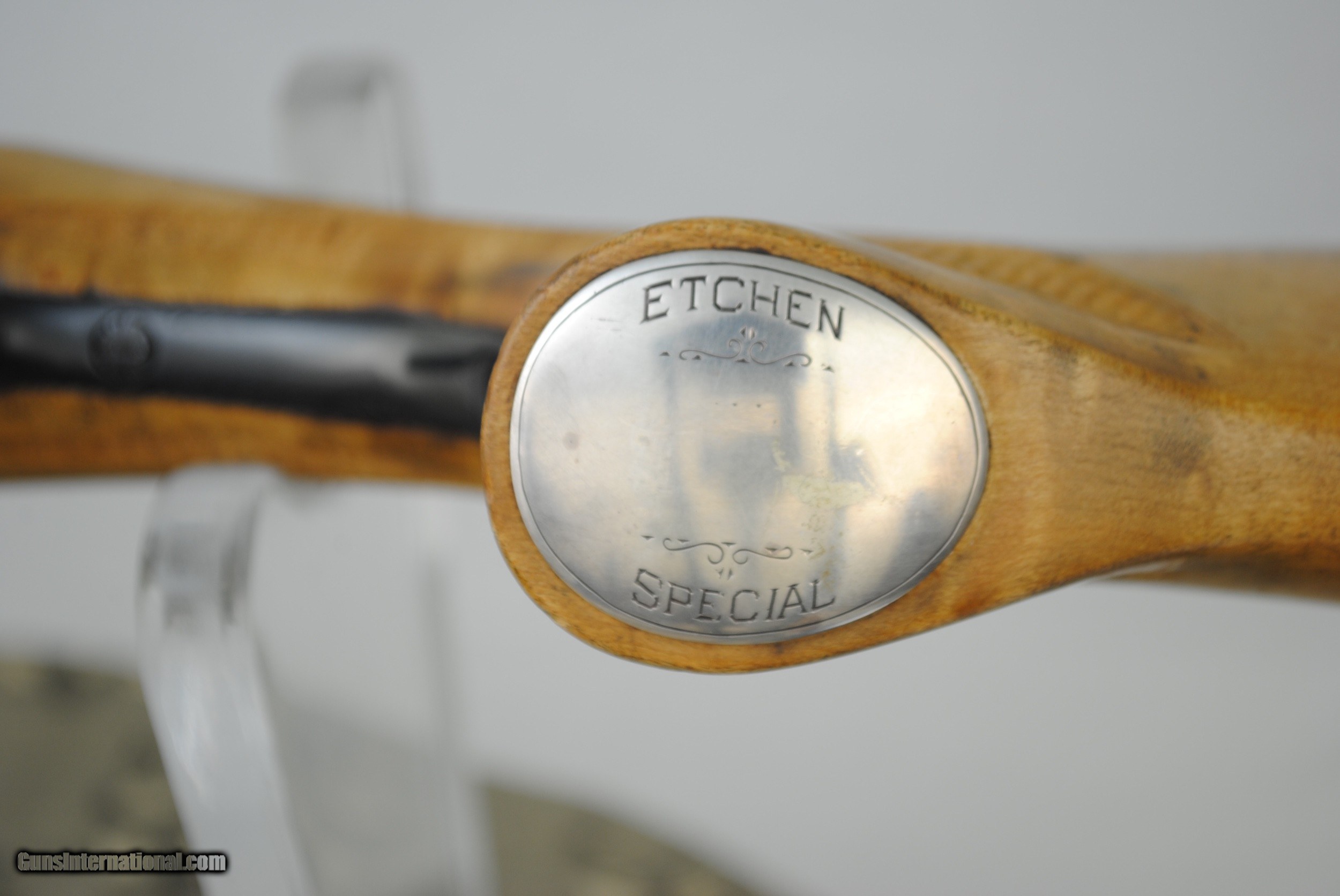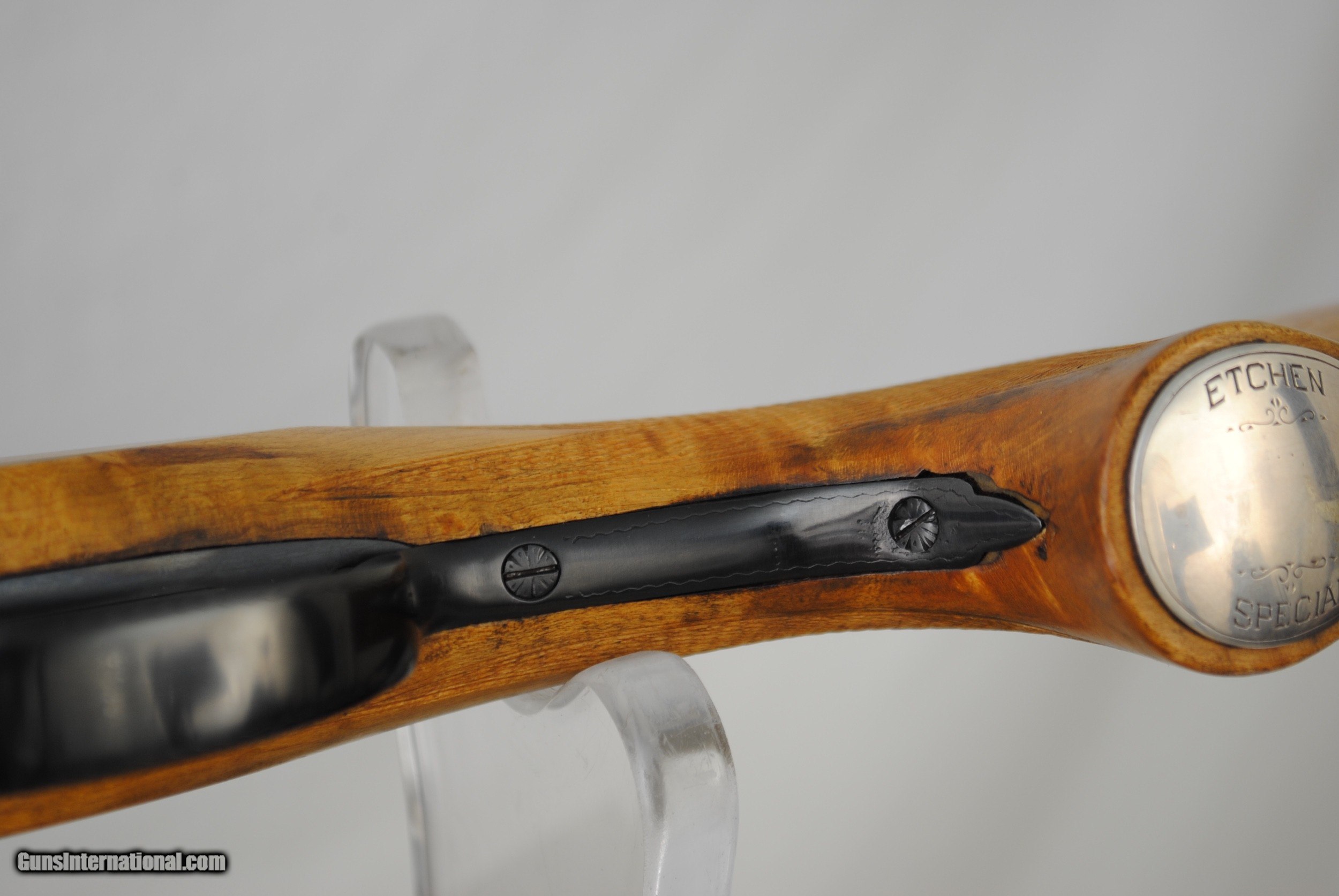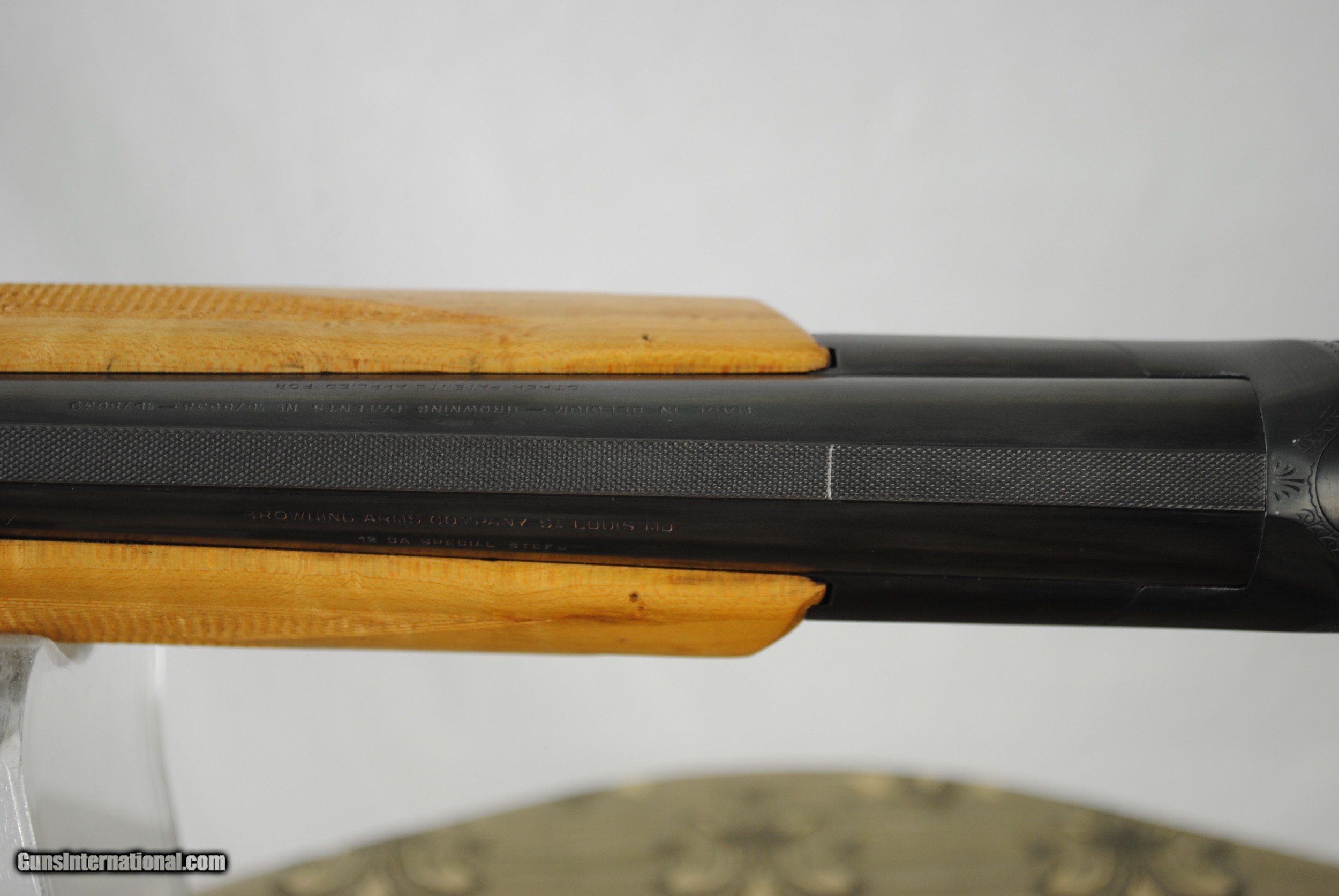Description: Vintage Browning Etchen Special 12 gauge with 30" flat rib barrels Birdseye Maple Stock and Forend with correct Etchen Grip Silver Cap .725 Bores with Mod (15/1000) and Full (39/1000) Chokes Chambers 2 3/4" Mirror bores Complete metal restoration - rust blue barrels, hot blue receiver/forend iron, gold plate trigger blade - engraving still sharp and crisp Tight on face Single selective trigger "Horseshoe" forend cap Serial number 12,744 LOP - 13 5/8", Drop at Comb 1 7/16", Drop at Heel 2 1/8 SOLD Shotgun Gauge: 12 Gauge |