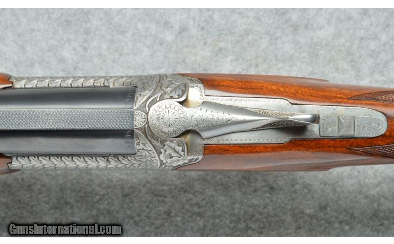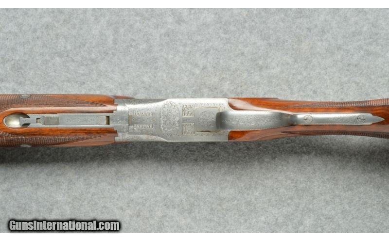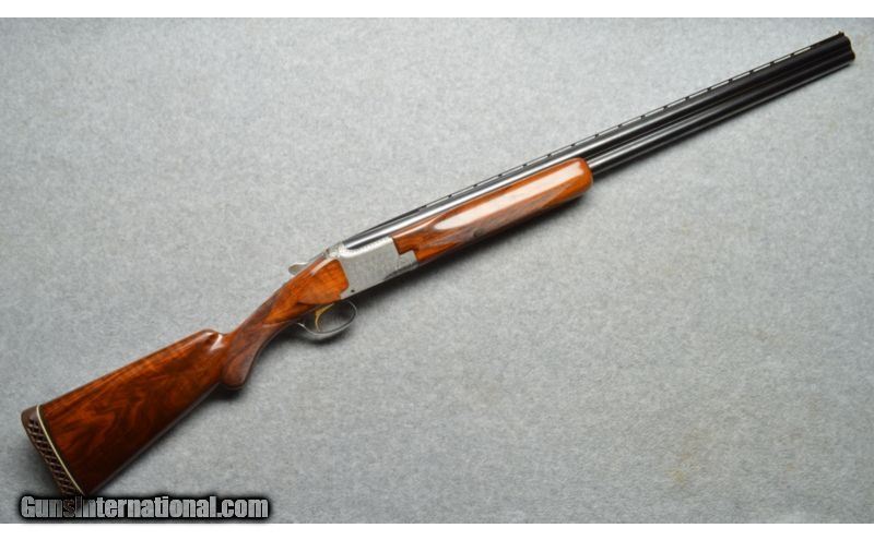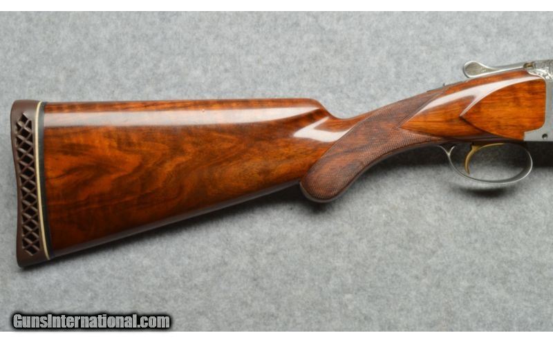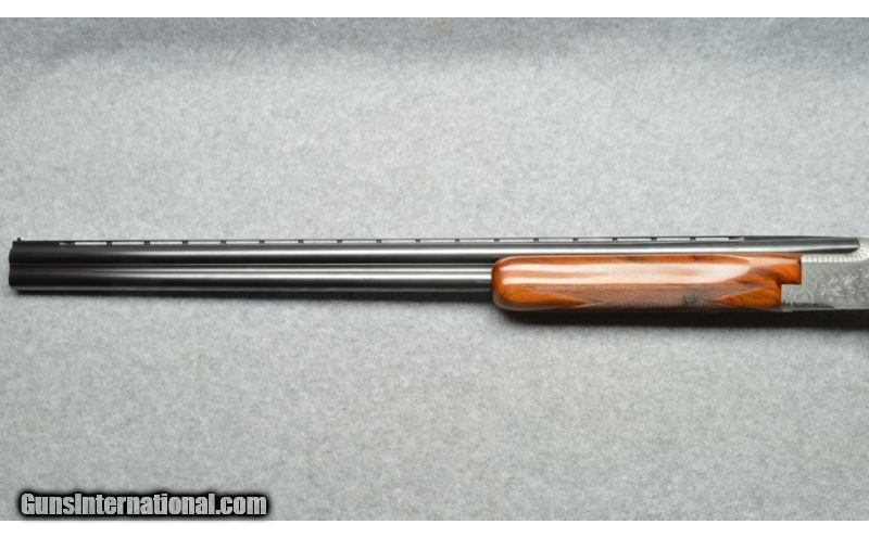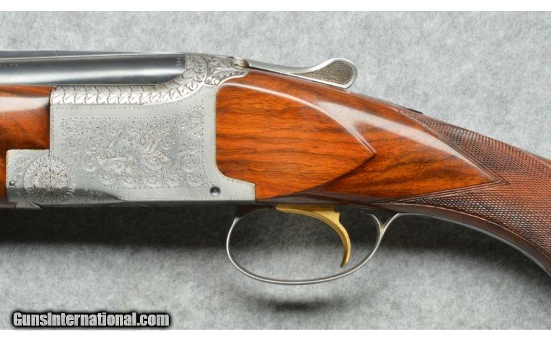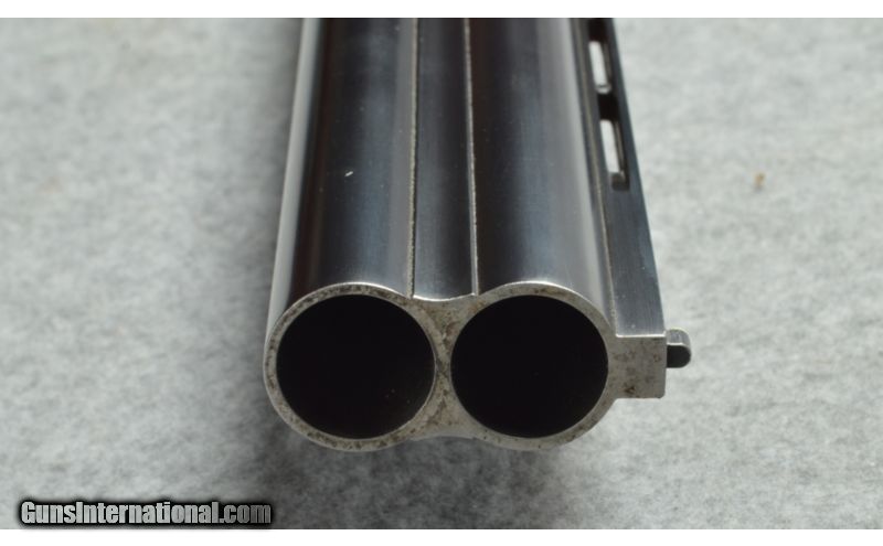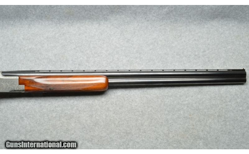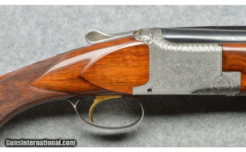 Description: Pigeon Grade Trap gun. SOLD Manufacturer: 1949 manufacture date. Caliber Info: 12 Ga. Chambers: Break action 2 3/4" shells, Pigeon Grade Trap gun. Metal Condition: Very good,lower barrel has two small wear marks where the fore-end slides forward. Receiver is exquisitely engraved. Wood Condition: Very good, checkering is mildly worn, not as sharp as new. Bore Condition: Excellent, clean and shiny. Barrels: 30 inch Over/Under round blue barrels. Triggers: Single stage trigger with tang mounted barrel selector safety. Stock: Checkered semi pistol grip wood stock with semi gloss finish. Stock Dimensions: 14 inch length of pull. Fore End: Checkered wooden fore-end to match the stock. Butt Pad: Brown rubber butt pad. Weight: 8 pounds. Sights: White dot at the muzzle, small silver bead mounted mid vent rib. Chokes: Fixed chokes, Full over Full. Item Location: Berlin, MA |