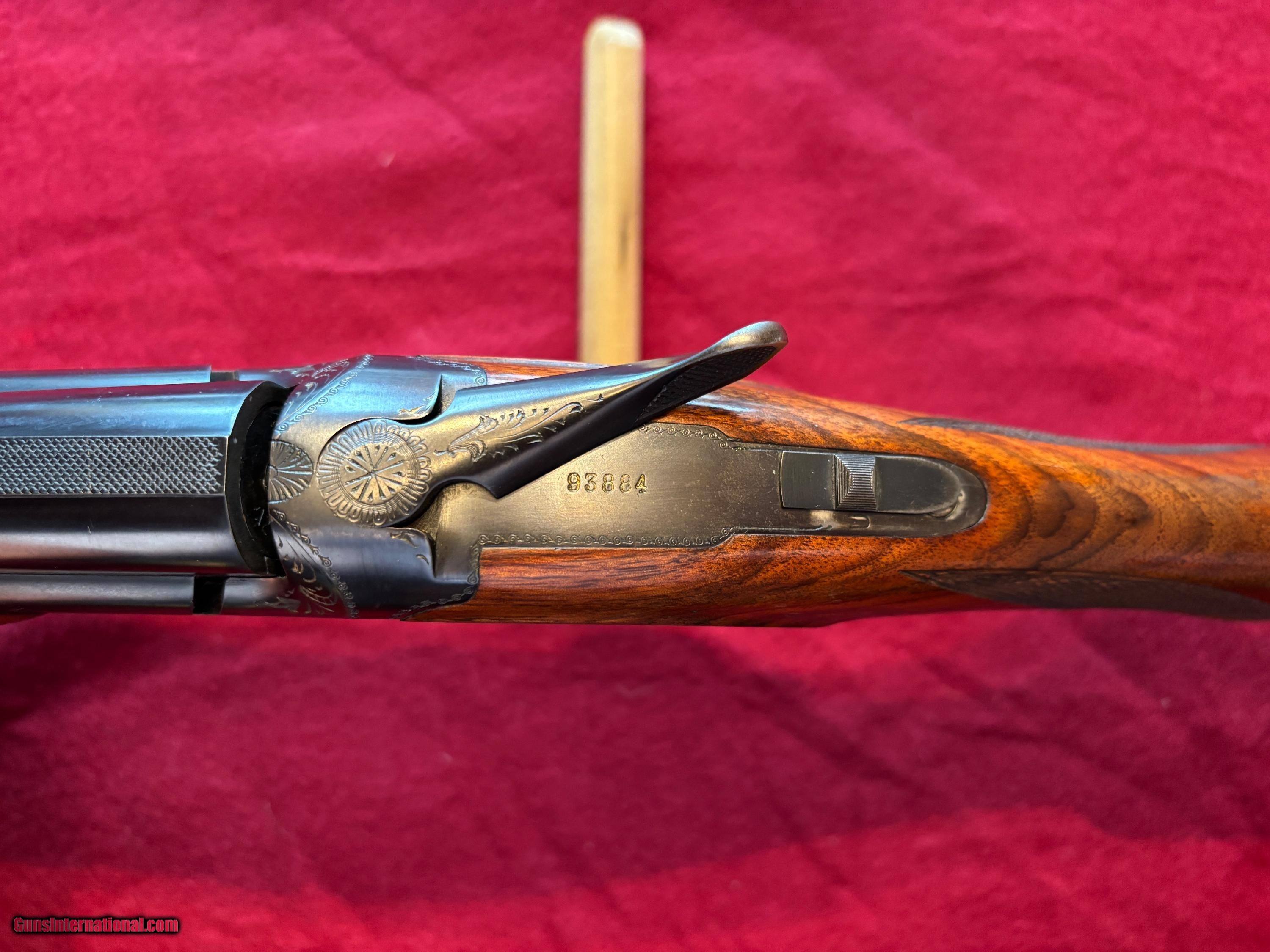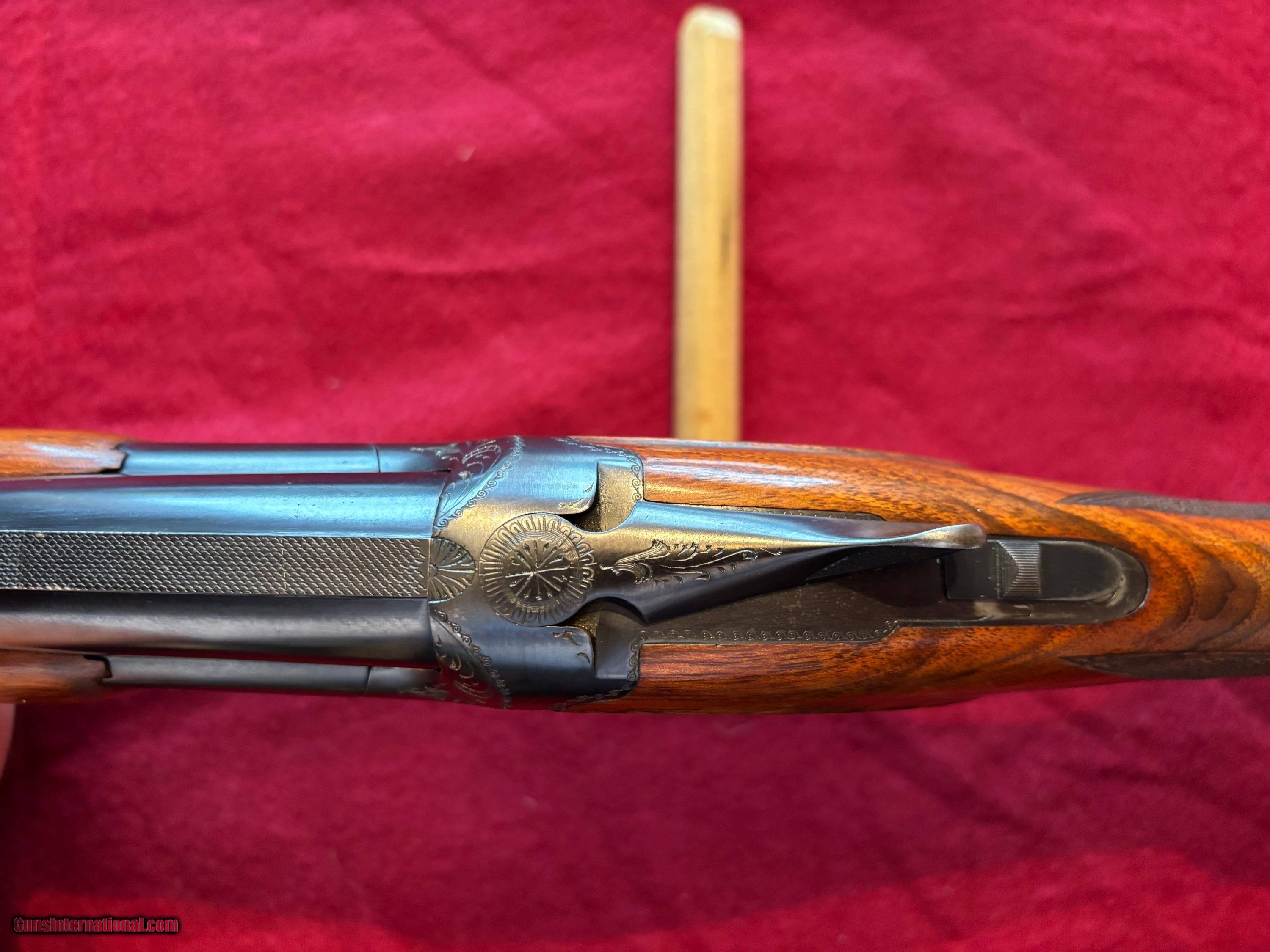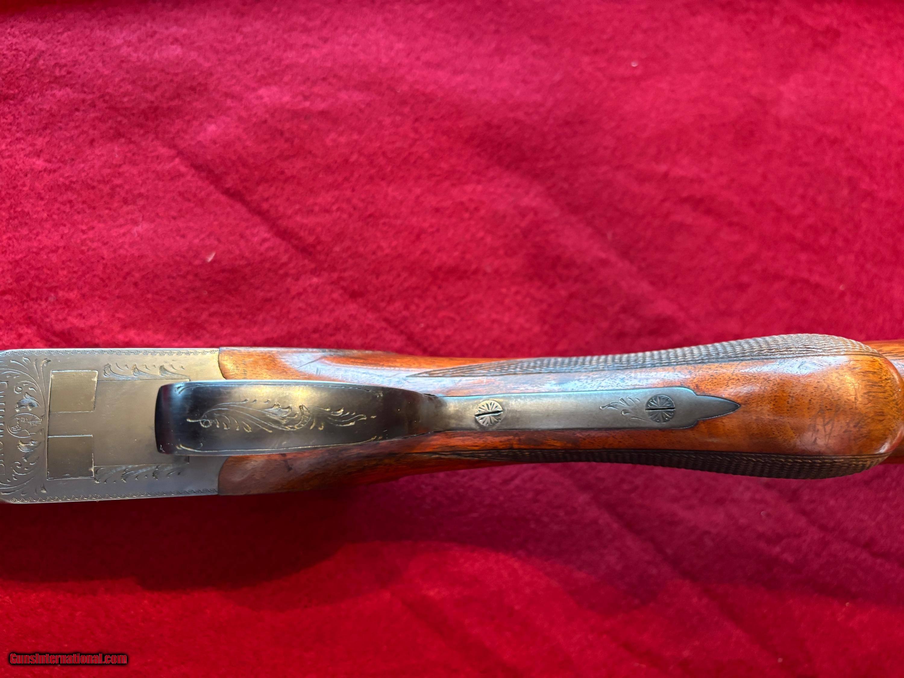 Description: Browning RKLT Superposed 12 gauge field shotgun with 28" M/ F ventilated rib barrels, 2 3/4" chambers, excellent bores, Excellent medium color French walnut, no splits or cracks, toplever well to right, S/N 93884, mfg.1959, Browning horn buttplate, 14 1/4" LOP, 1 5/8" DAC, 2 9/16" DAH, neutral cast for left or right handed shooter, weight 7lbs. 12 ozs., very clean metal and blue, 95% original clean blue w/ no patina, wood with 95% plus original oil finish not crazing at all. This is a great old Superposed with the best late 50's material and workmanship, ready for the field this Fall. $2,095.00 or Best Offer. Shotgun Gauge: 12 Gauge Manufacturer: FN Browning Model: B-25 Superposed Serial Number: 93884 Barrel Length: 28 Chambers: 2 3/4 Ejectors: Yes Condition: Excellent Metal Condition: Excellent Wood Condition: Excellent Bore Condition: Excellent Barrel Type: Fluid Steel Action: Boxlock Triggers: SST Stock: SPG to horn butt Stock Comb: 1 5/8 Stock Heel: 2 9/16 Stock Cast: None; neutral for right or left hand Fore End: Standard Butt Pad: No; Browning horn butt LOP: 14 1/4" from Rear Position ST Rib: Ventilated Finish: Blue Weight: 7 lbs. 12 ozs. Sights: Bead front Manufacture Date: 1959 Choke Left: Modified (under) Choke Right: Full ( over) Engraving: Standard scroll Proof:Nitro: Yes Price: $2,095.00 Shipping: $50.00 Contact Seller |