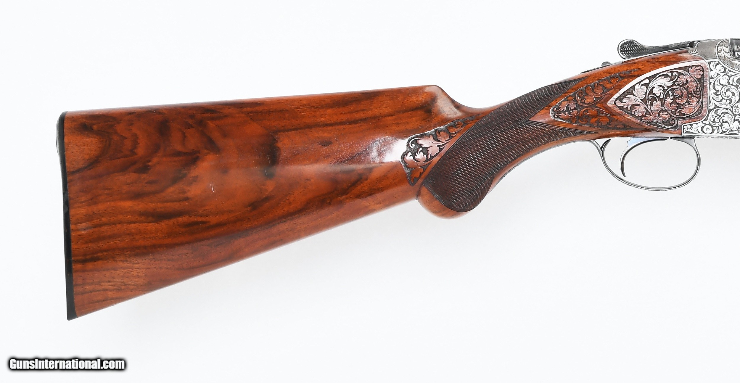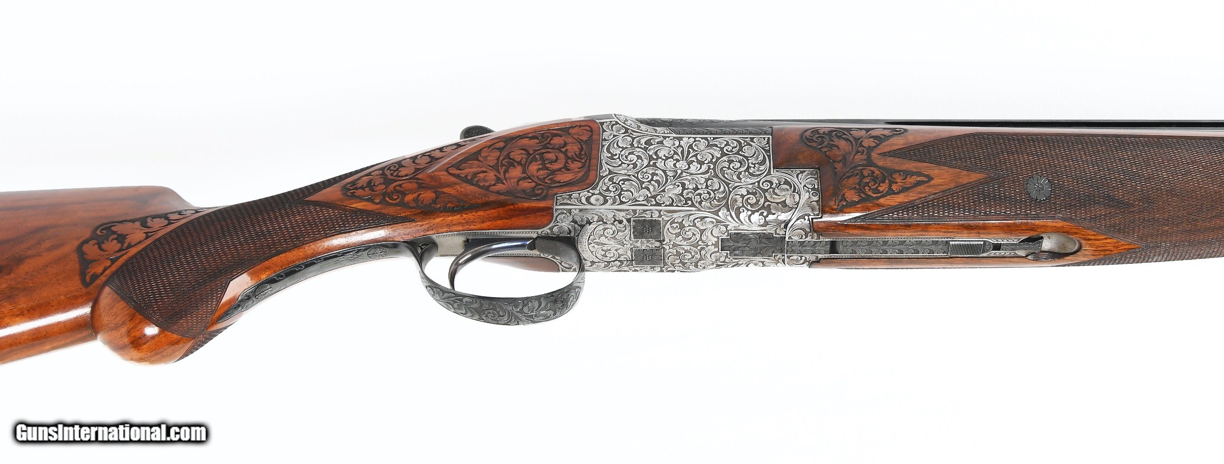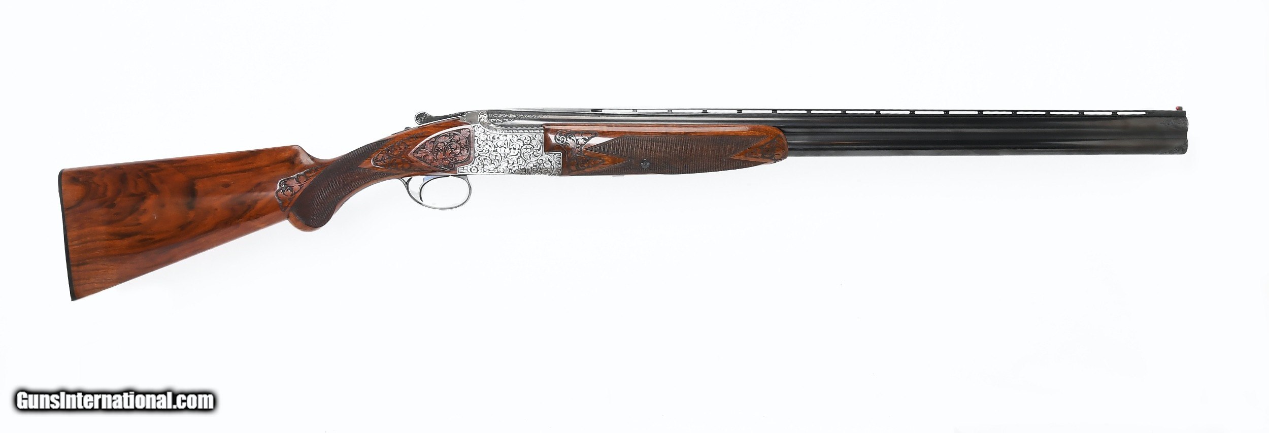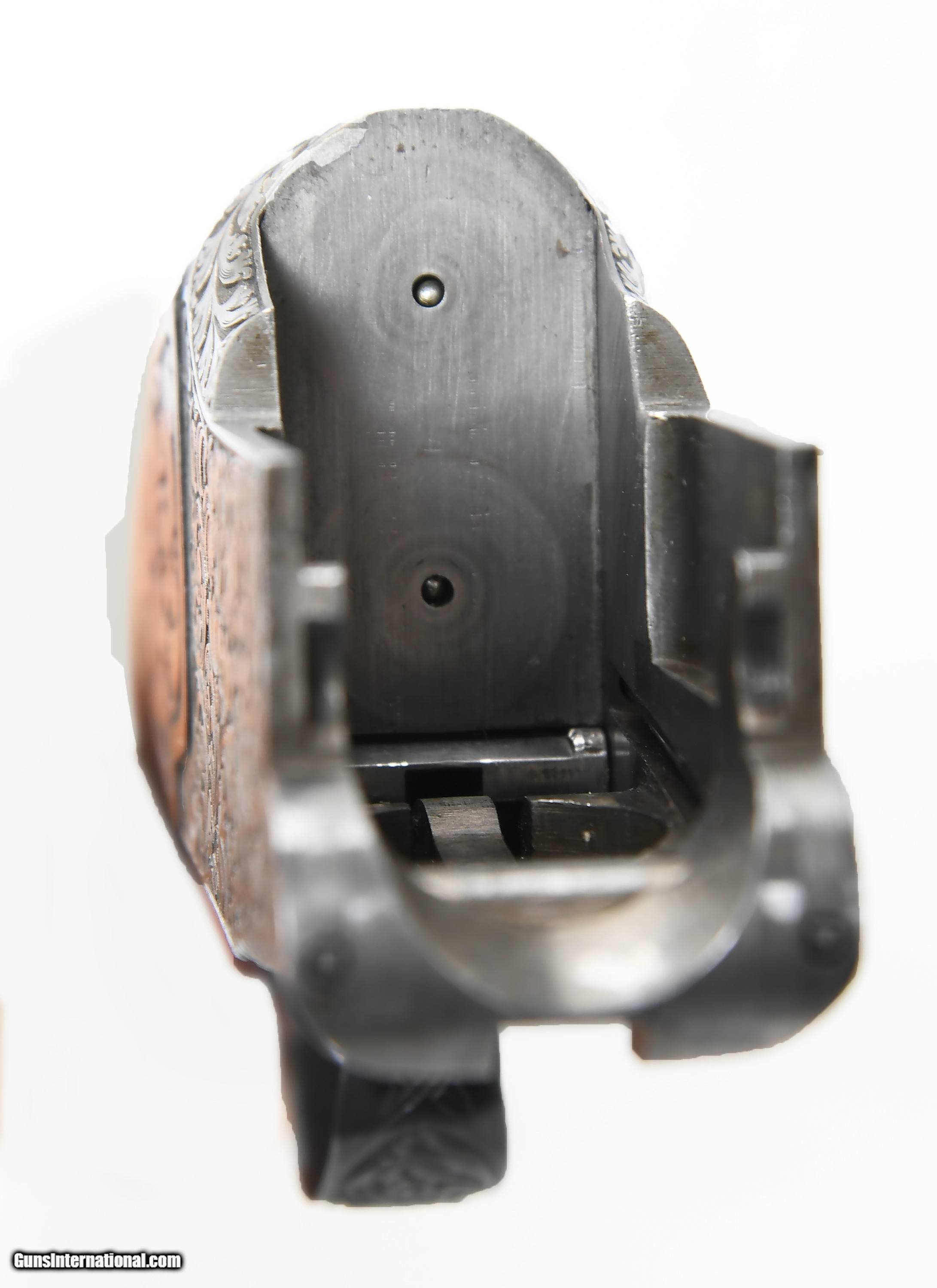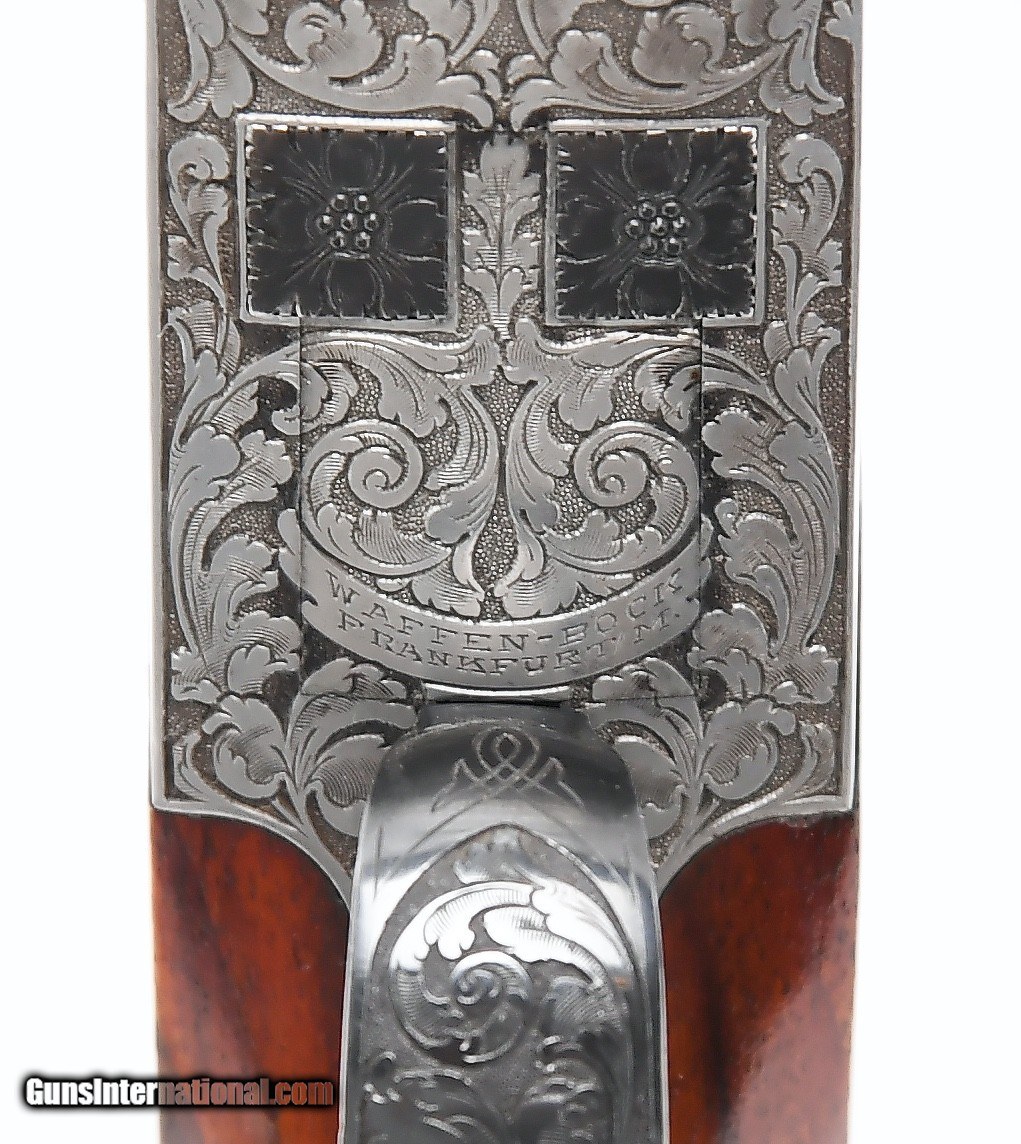 Description: SOLD Browning Superposed 12 gauge O/U shotgun. This gun is not a Browning USA import. All work, engraving and carving was done in Europe by unknown artisans. Built with 28” barrels choked skeet/skeet. Round knob/long tang which is typical for a gun made in 1960. It is the heavy floral engraving pattern on the frame and the similar floral carving on the stock that sets this gun apart from any other. Inscribed just ahead of the trigger guard in a banner is: WAFFEN BOCK/FRANKFURT M The stock has a 14 ¼” LOP with neutral cast, 1 ½” DAC & 2 ½” DAH weighing 7 lbs. 8 oz. $4,800.00 SN: 80646 SOLD |