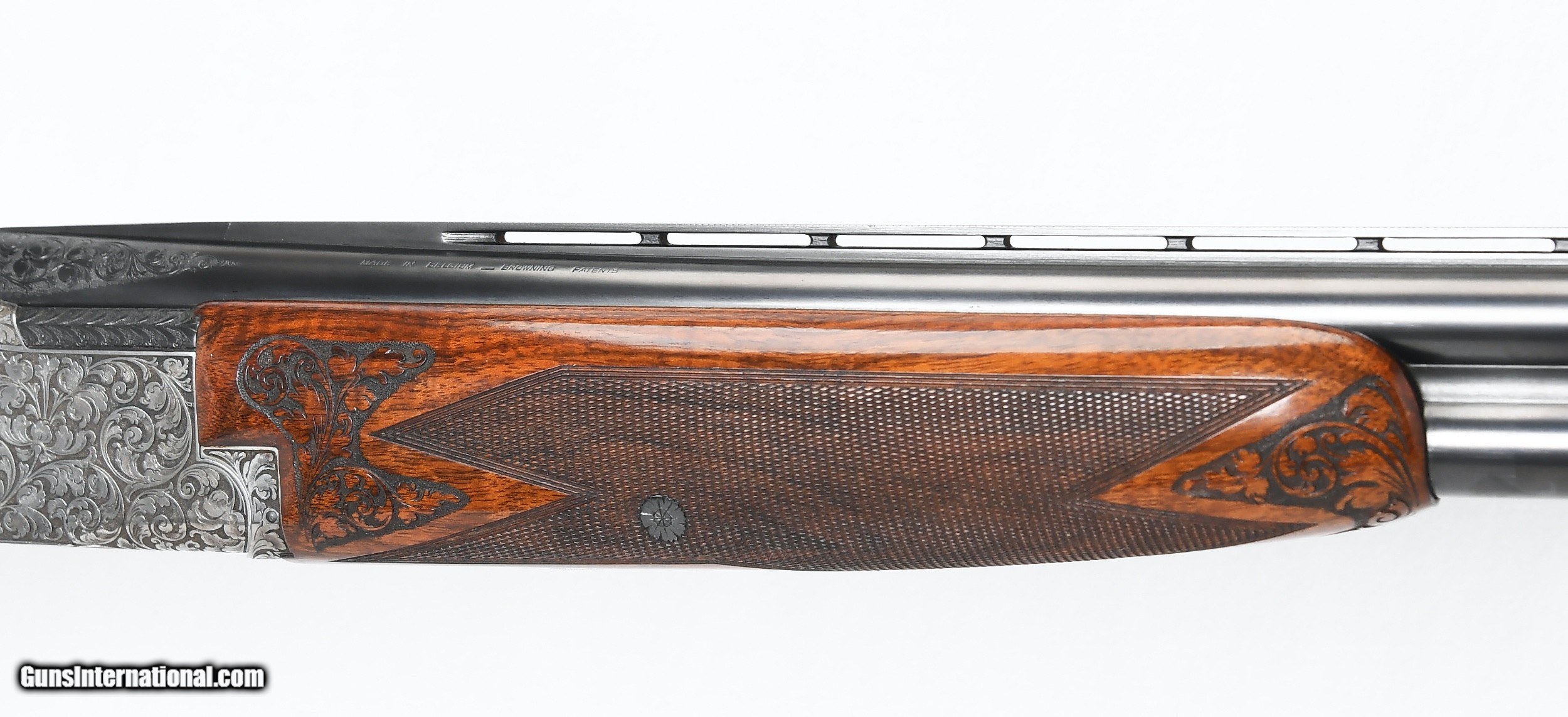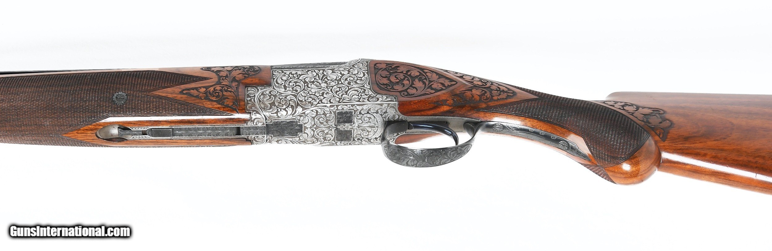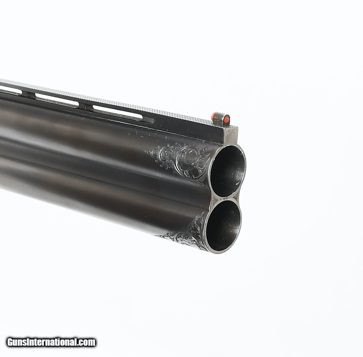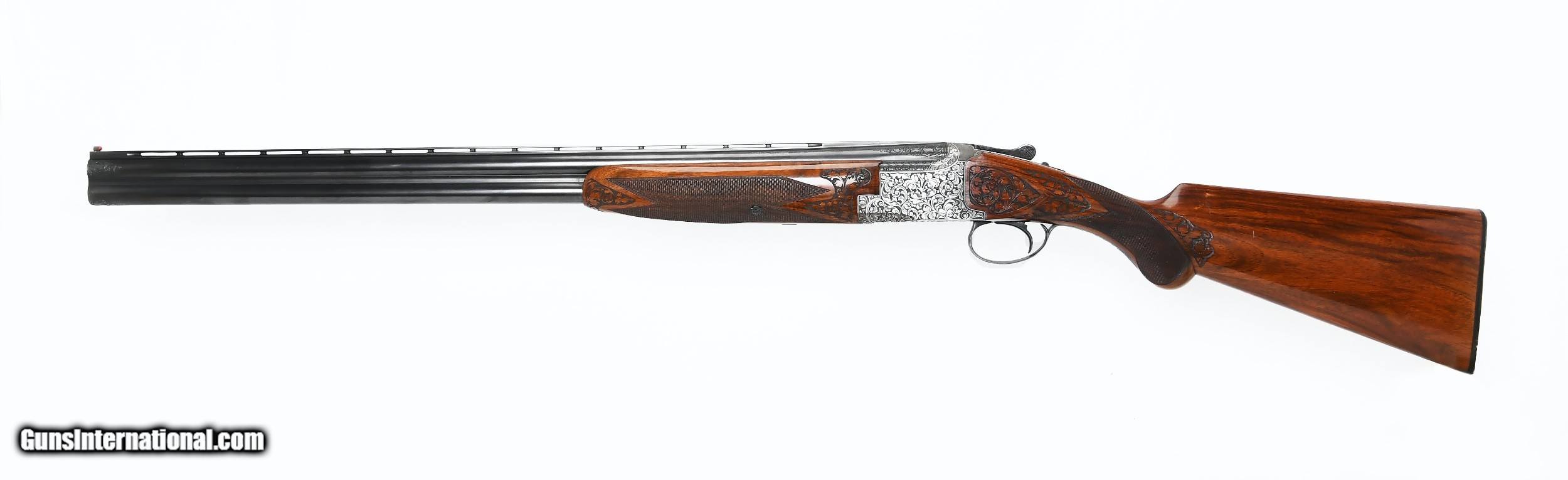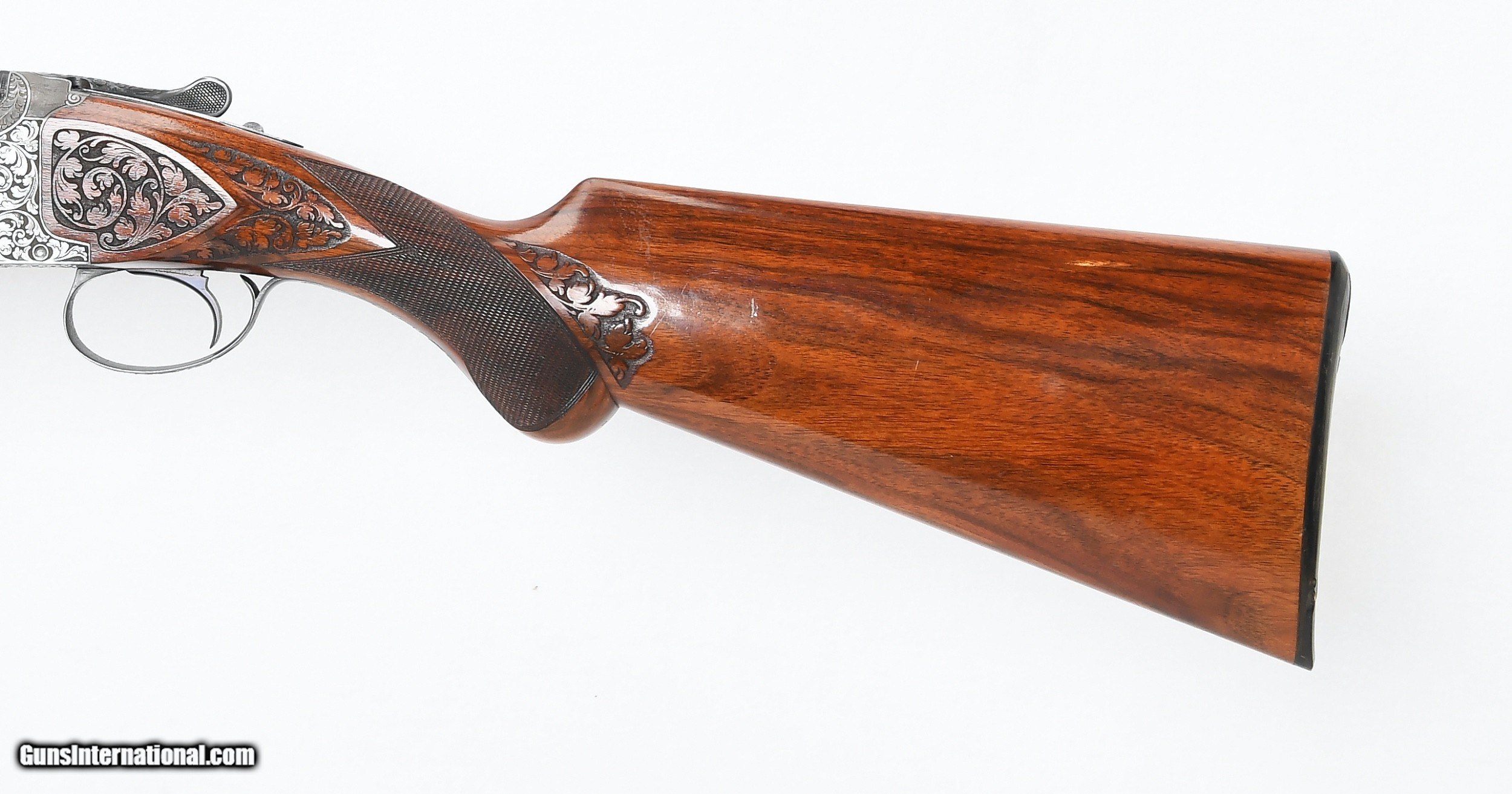 Description: SOLD Browning Superposed 12 gauge O/U shotgun. This gun is not a Browning USA import. All work, engraving and carving was done in Europe by unknown artisans. Built with 28” barrels choked skeet/skeet. Round knob/long tang which is typical for a gun made in 1960. It is the heavy floral engraving pattern on the frame and the similar floral carving on the stock that sets this gun apart from any other. Inscribed just ahead of the trigger guard in a banner is: WAFFEN BOCK/FRANKFURT M The stock has a 14 ¼” LOP with neutral cast, 1 ½” DAC & 2 ½” DAH weighing 7 lbs. 8 oz. $4,800.00 SN: 80646 SOLD |