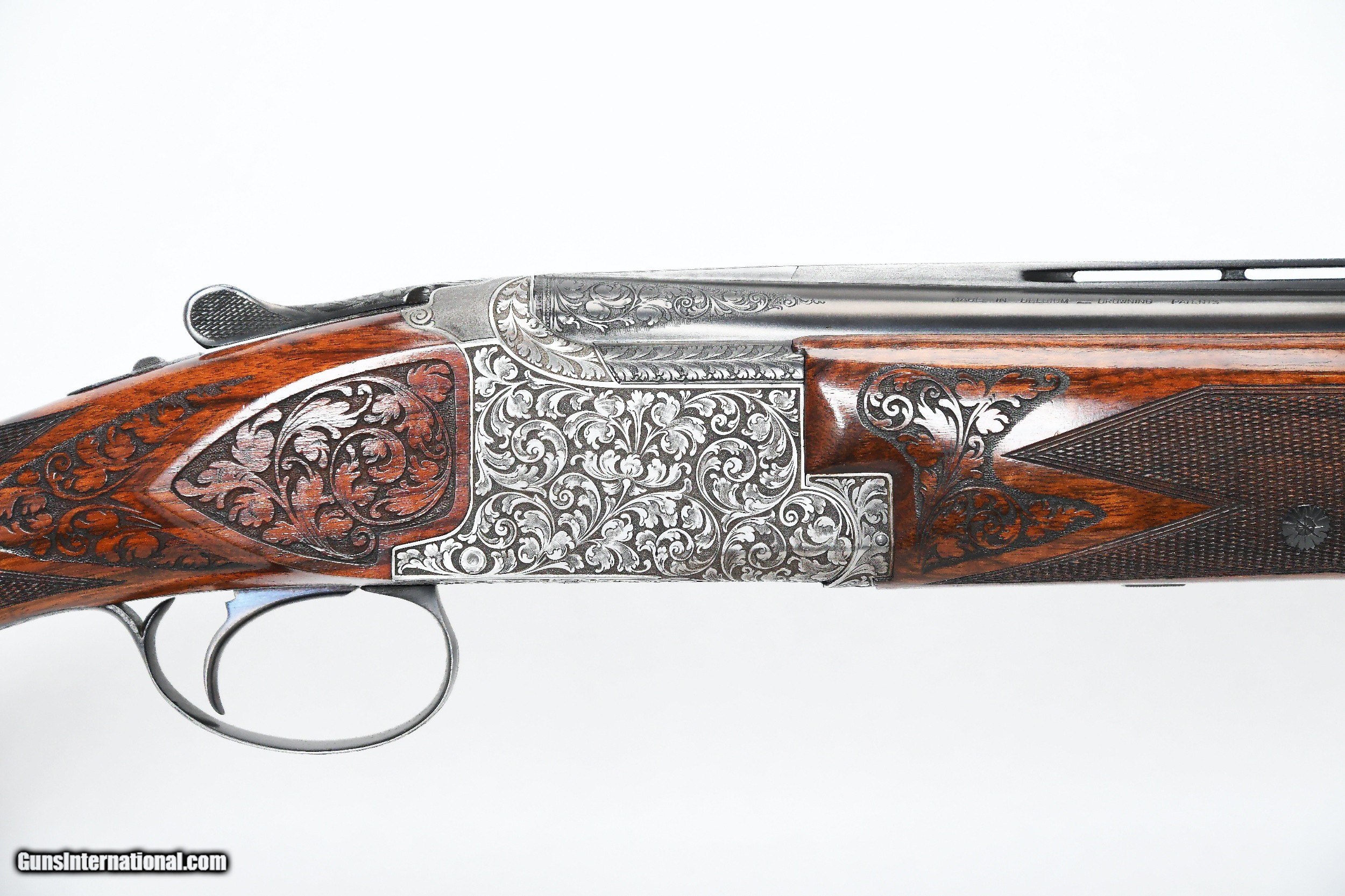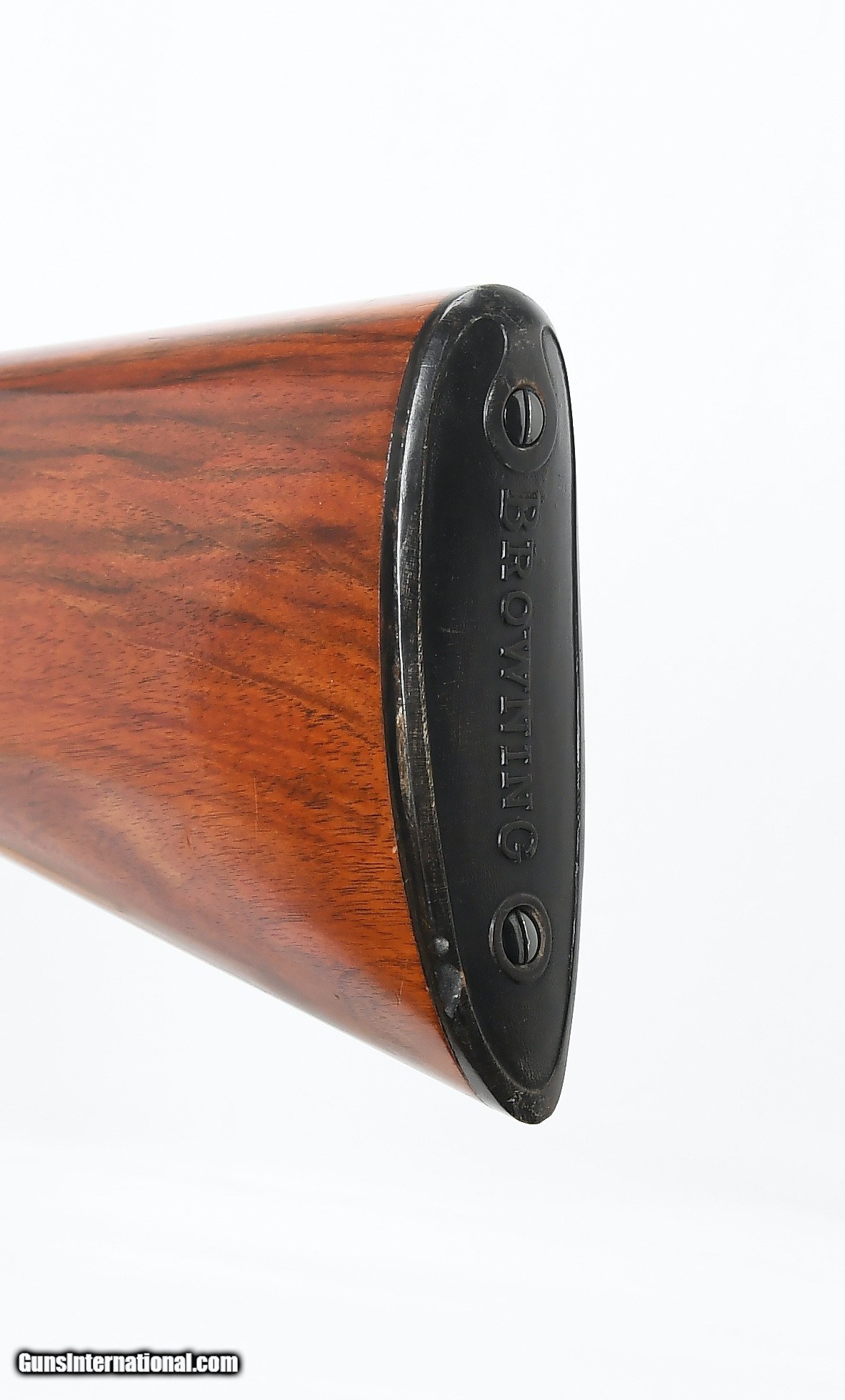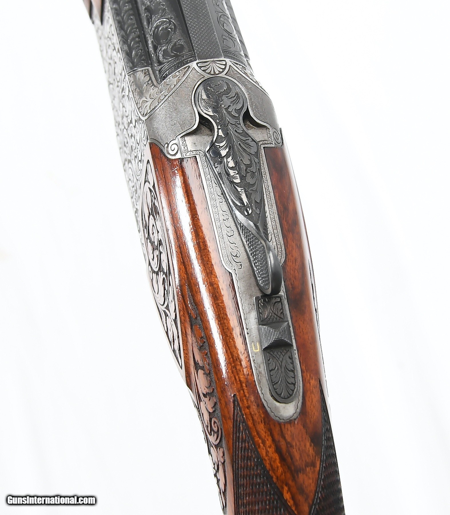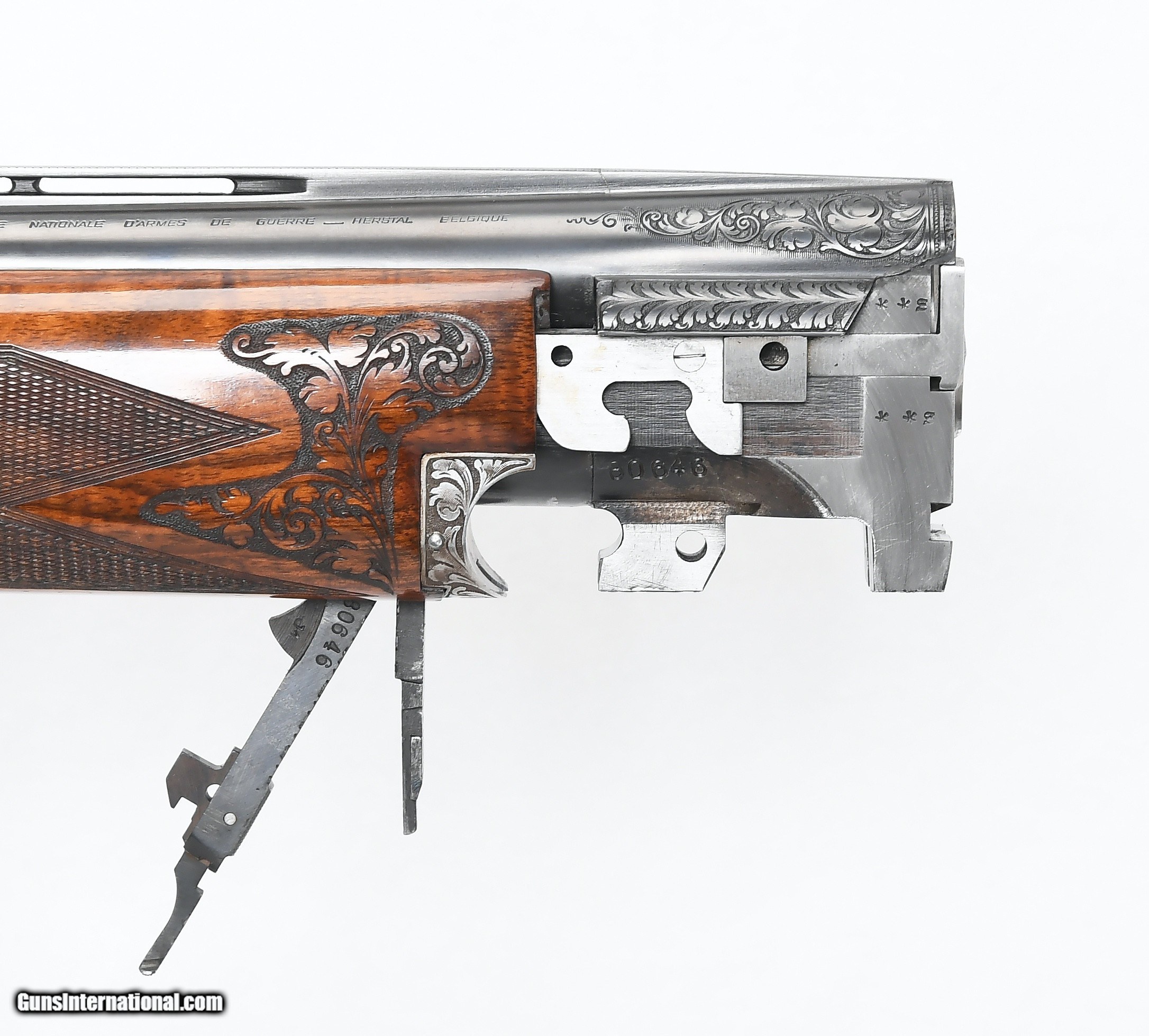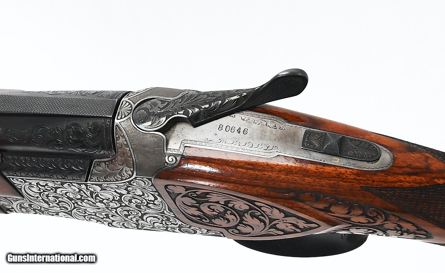 Description: SOLD Browning Superposed 12 gauge O/U shotgun. This gun is not a Browning USA import. All work, engraving and carving was done in Europe by unknown artisans. Built with 28” barrels choked skeet/skeet. Round knob/long tang which is typical for a gun made in 1960. It is the heavy floral engraving pattern on the frame and the similar floral carving on the stock that sets this gun apart from any other. Inscribed just ahead of the trigger guard in a banner is: WAFFEN BOCK/FRANKFURT M The stock has a 14 ¼” LOP with neutral cast, 1 ½” DAC & 2 ½” DAH weighing 7 lbs. 8 oz. $4,800.00 SN: 80646 SOLD |
