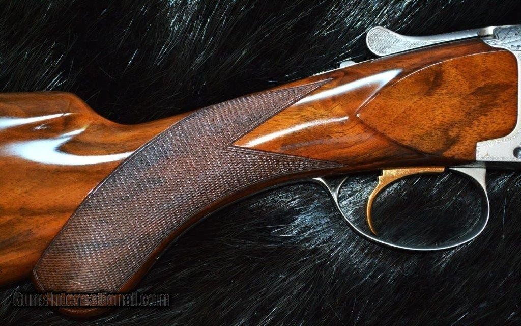 Description: This is a Browning Superposed Pigeon Grade Skeet 20 gauge with 2 3/4" and 3" chambers and 28" vent rib barrels. The DaC is 1-3/8" and the DaH is 2-3/8". The LOP is 14-5/8" to a black recoil pad and the gun weighs 6 lbs, 9 ounces. The chokes are marked Skeet & Skeet. It has a white mid bead and a white Bradley style front sight. It is a desirable RKLT that was manufactured in 1962. This being an early gun, I believe it has 26 lines per inch checkering, which is very nicely done in typical Belgium Browning fashion. The Pigeon grade features a French gray receiver with 2 flying pigeons surrounded by fine scroll engraving on each side of the frame. The receiver bottom and tangs also exhibit fine scroll work. The engraved bottom tang screws are perfect. It has very crisp mechanicals, very shiny bores, and nicely figured wood. The gun retains a very high percentage of it's rust blue finish (99%) and shows only very, very few light scattered handling marks on the wood. There is no gold loss on the trigger. SOLD Curio/Relic: Yes Shotgun Gauge: 20 Gauge Serial Number: 24290 Barrel Length: 28 |