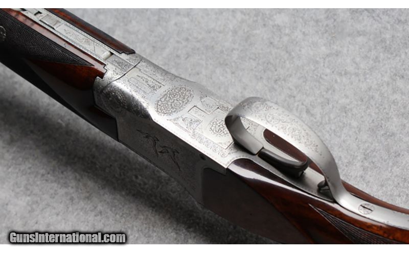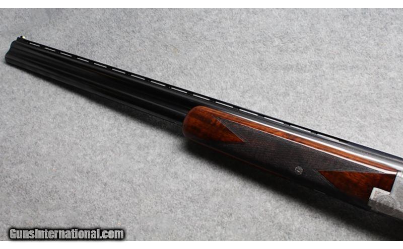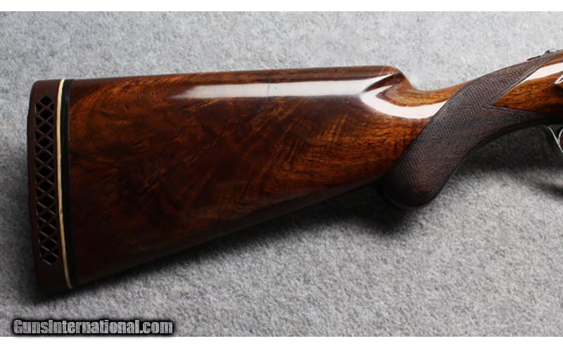 Description: This Superposed features high quality wood, fine line checkering, and sharp engravings with upland birds both sides. It has a low ventilated rib and an oversize fore bead. The stock has round knob pistol grip. SOLD Caliber Info: 12/20/28/.410 Gauge Chambers: 2-3/4 inch. Metal Condition: Very good. There are very few blemishes. Wood Condition: Good. Very few blemishes. Bore Condition: Shiny and bright. Barrels: 26-1/2 inch, blue, vent rib. Triggers: Factory trigger. Stock: Checkered high grade walnut with round knob pistol grip. Stock Dimensions: LOP: 13-5/8, DAC: 1-3/8, DAH: 2-1/8 Inches, both drops measured relative to the 1/4 inch high rib. Fore End: Well-matched checkered walnut. Note: There are two fine cracks on the right side, propagating from receiver forward 1-3/4 inch and 2 inches. Butt Pad: Ventilated rubber pad. Weight: 7 lb. - 11 oz. Sights: Ventilated rib with oversize ( approximately .190 dia.) white bead. Chokes: Fixed choke, Skeet/Skeet. Extras: Case, 3 sets of sub-tubes, ejector sets for each of the sub-gauges. Item Location: Farmington, UT |