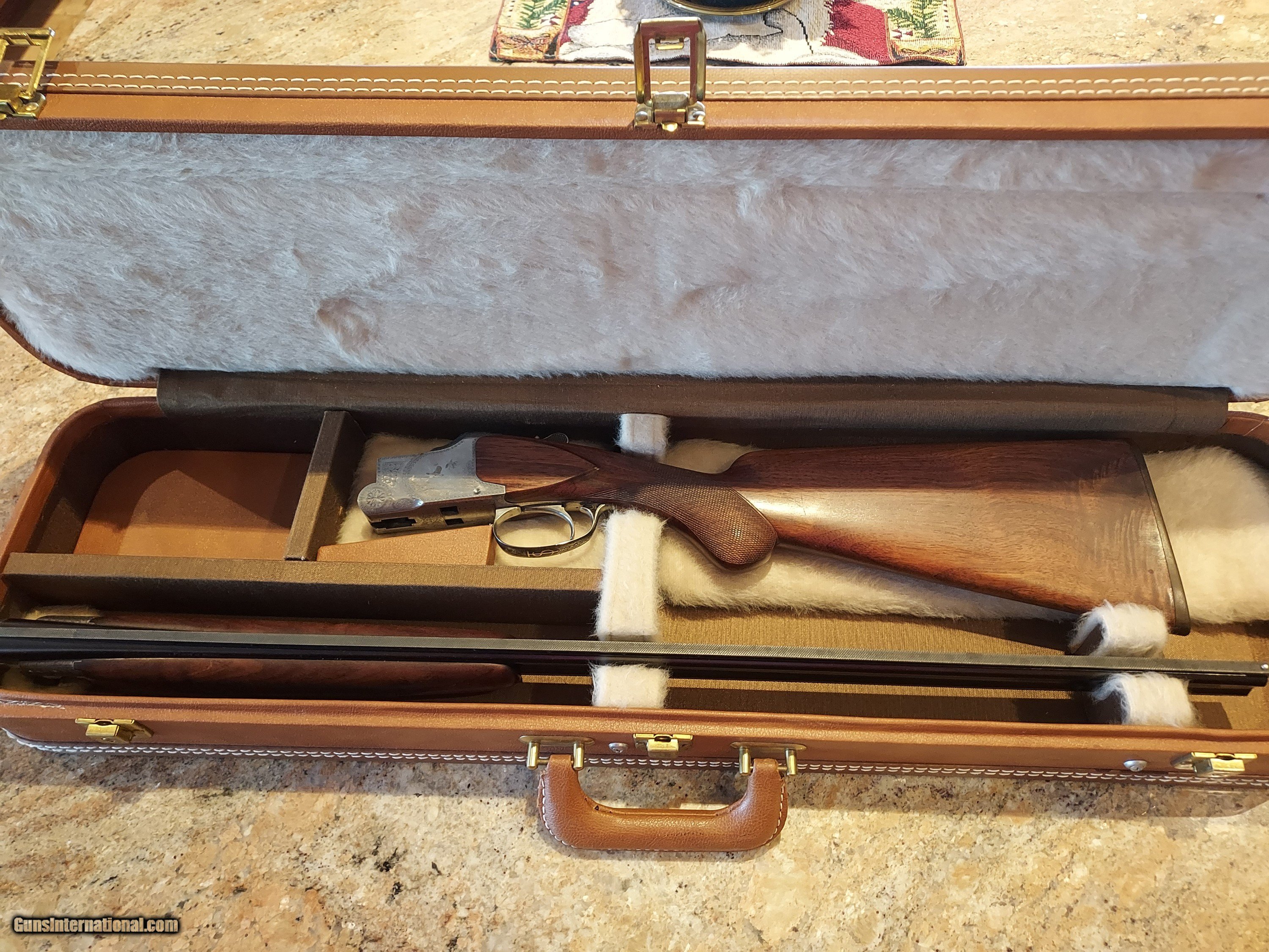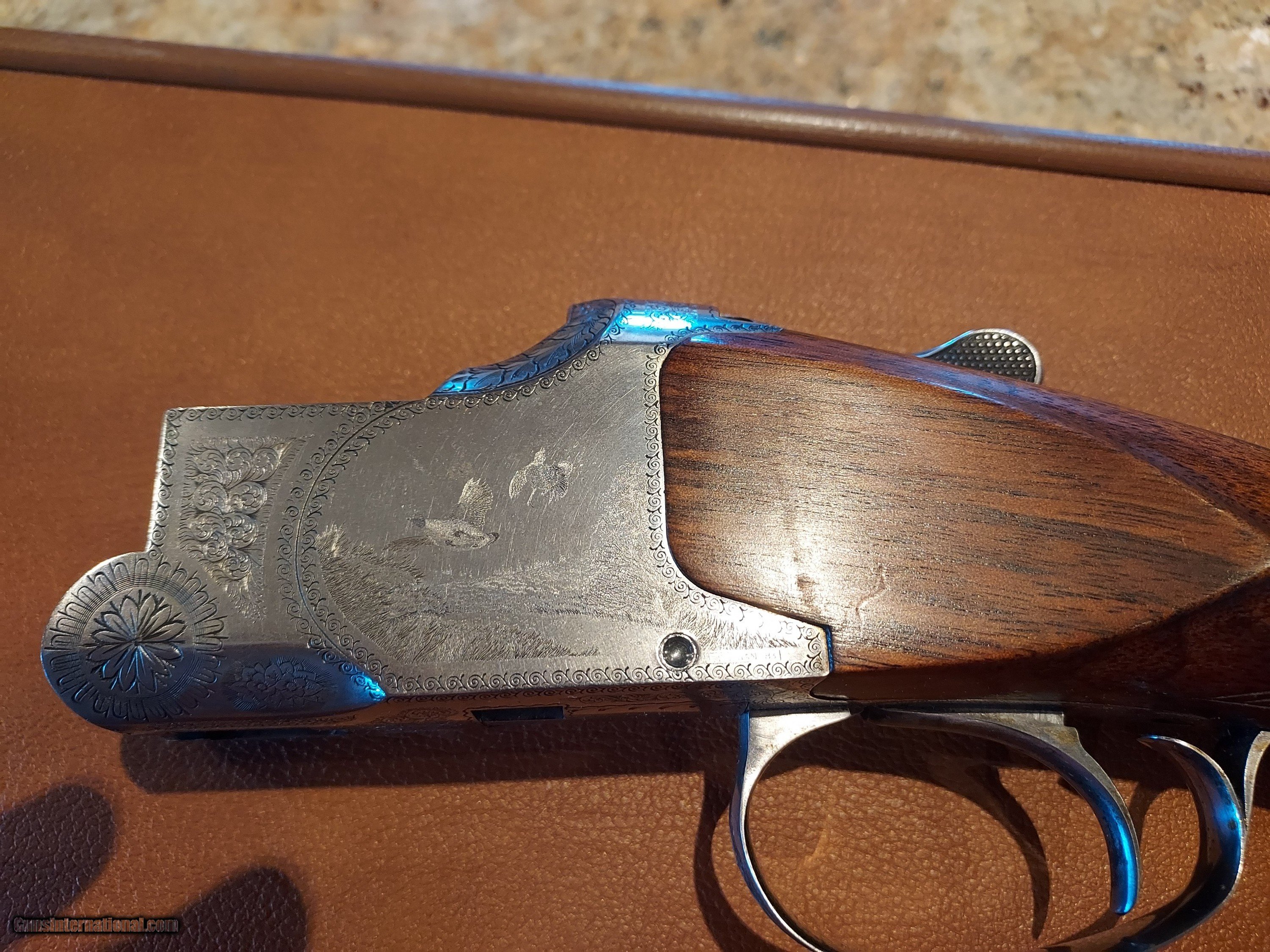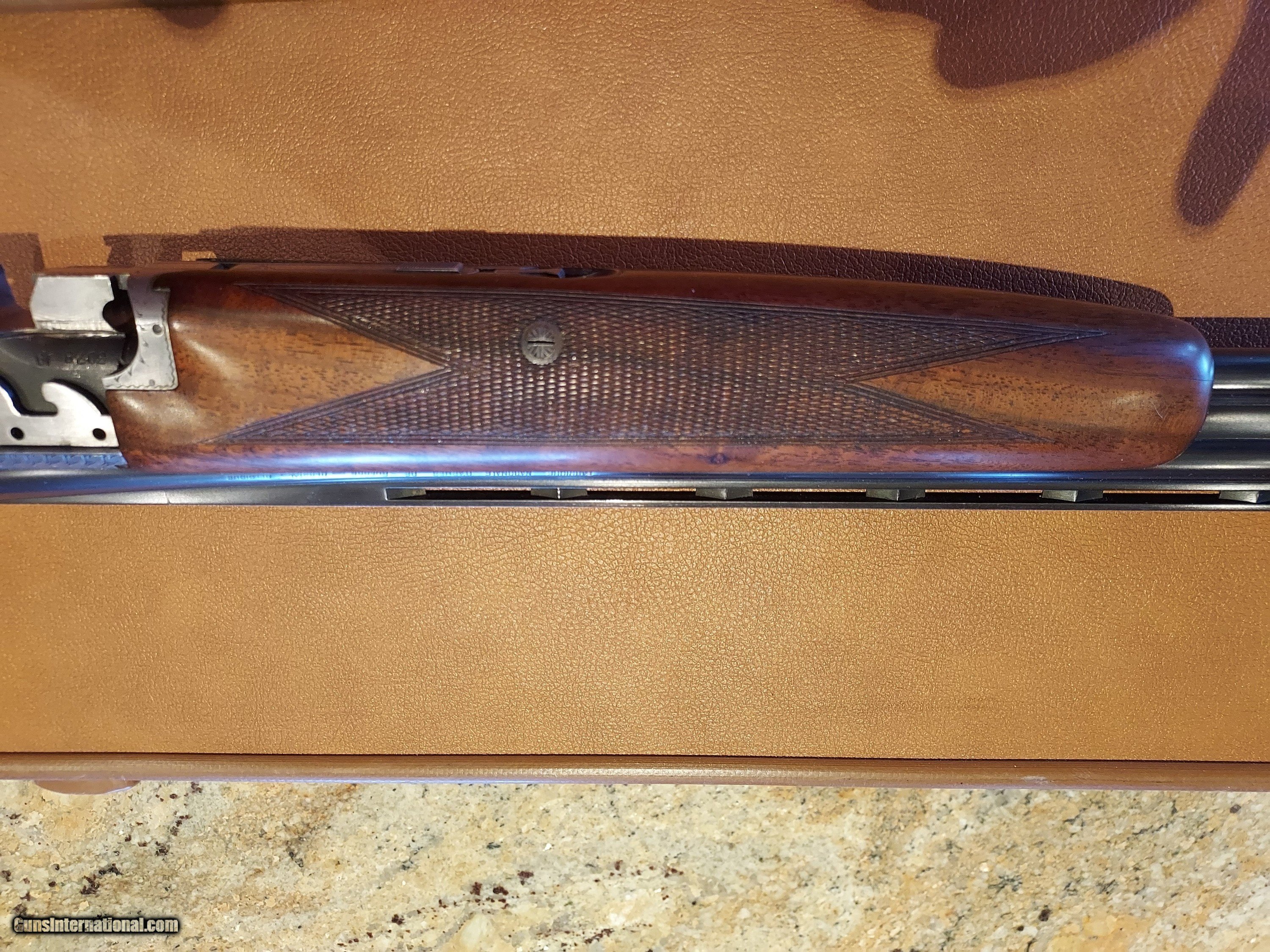 Description: This superposed was upgraded by Philip Coggan, noted English engraver who also did work for Holland & Holland and other English gun makers. The birds and scrolling have been tastefully done. and the diamond cut rib and wooden butt plate add extra appeal. The barrels are 28" mod/full. The stock measures 14 1/8" and there are no marks on the oil finished stock or forearm. A beautifully upgraded 410 priced at a grade 1 level in an exceptionally clean Hartman case. SOLD |