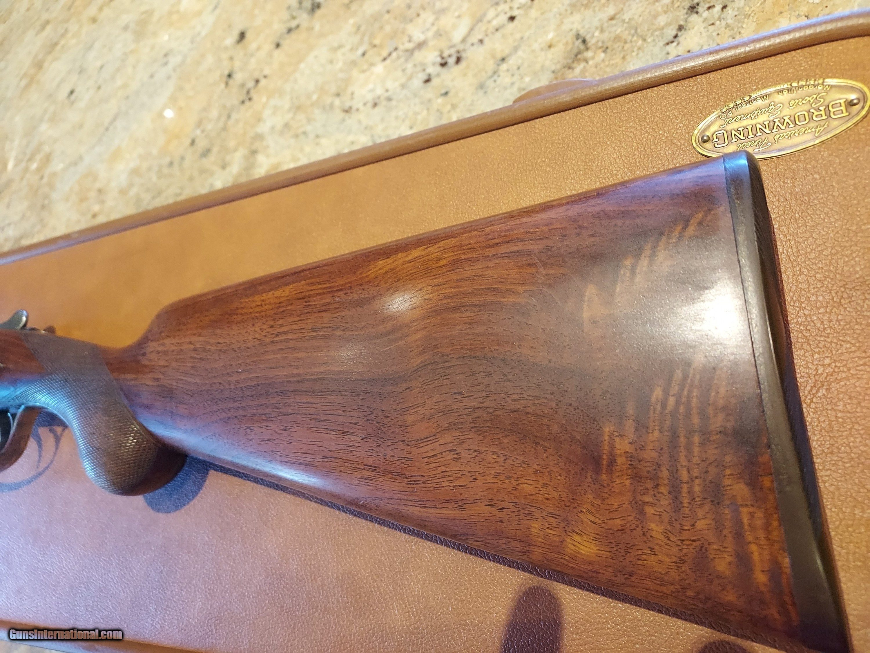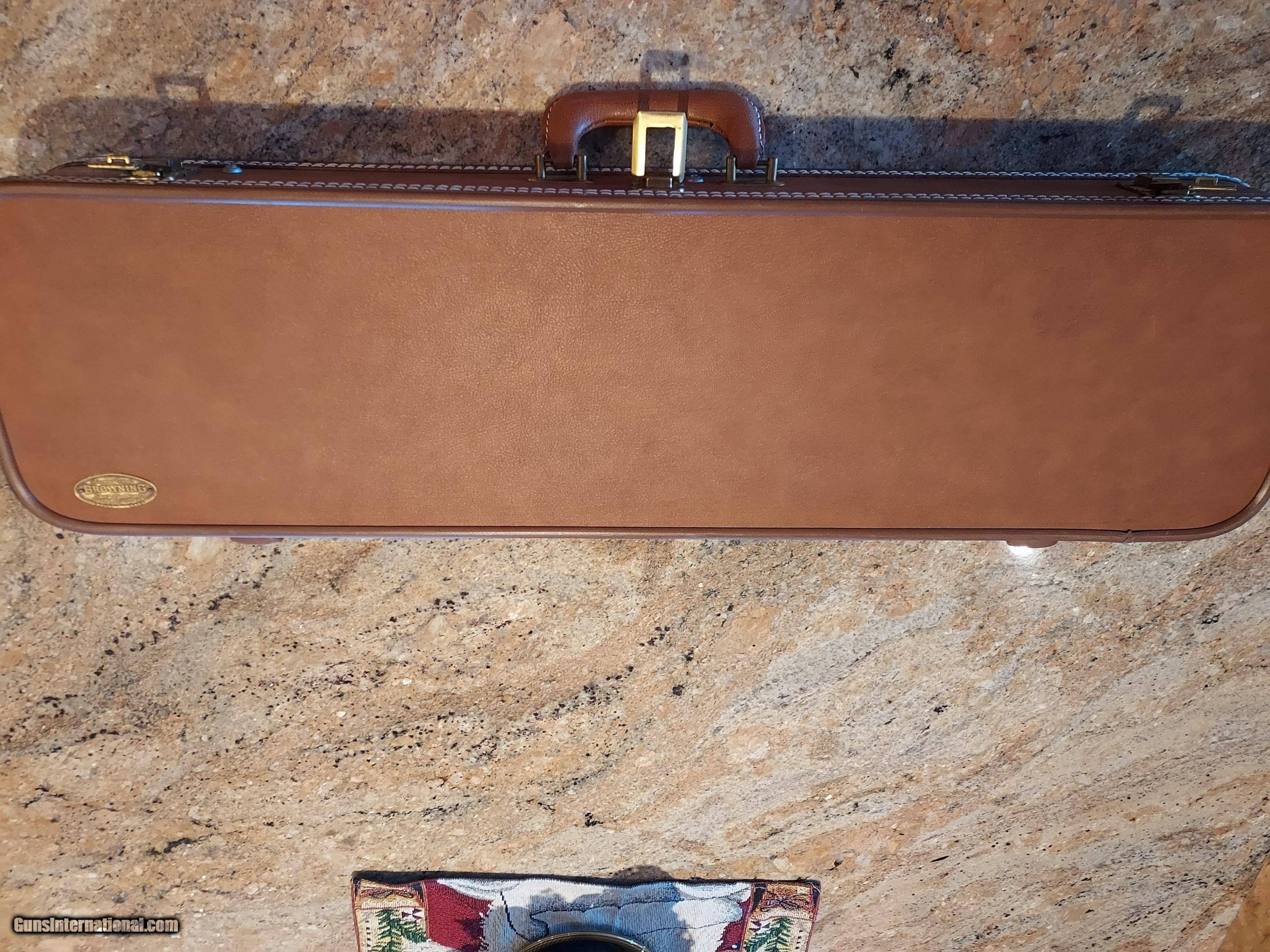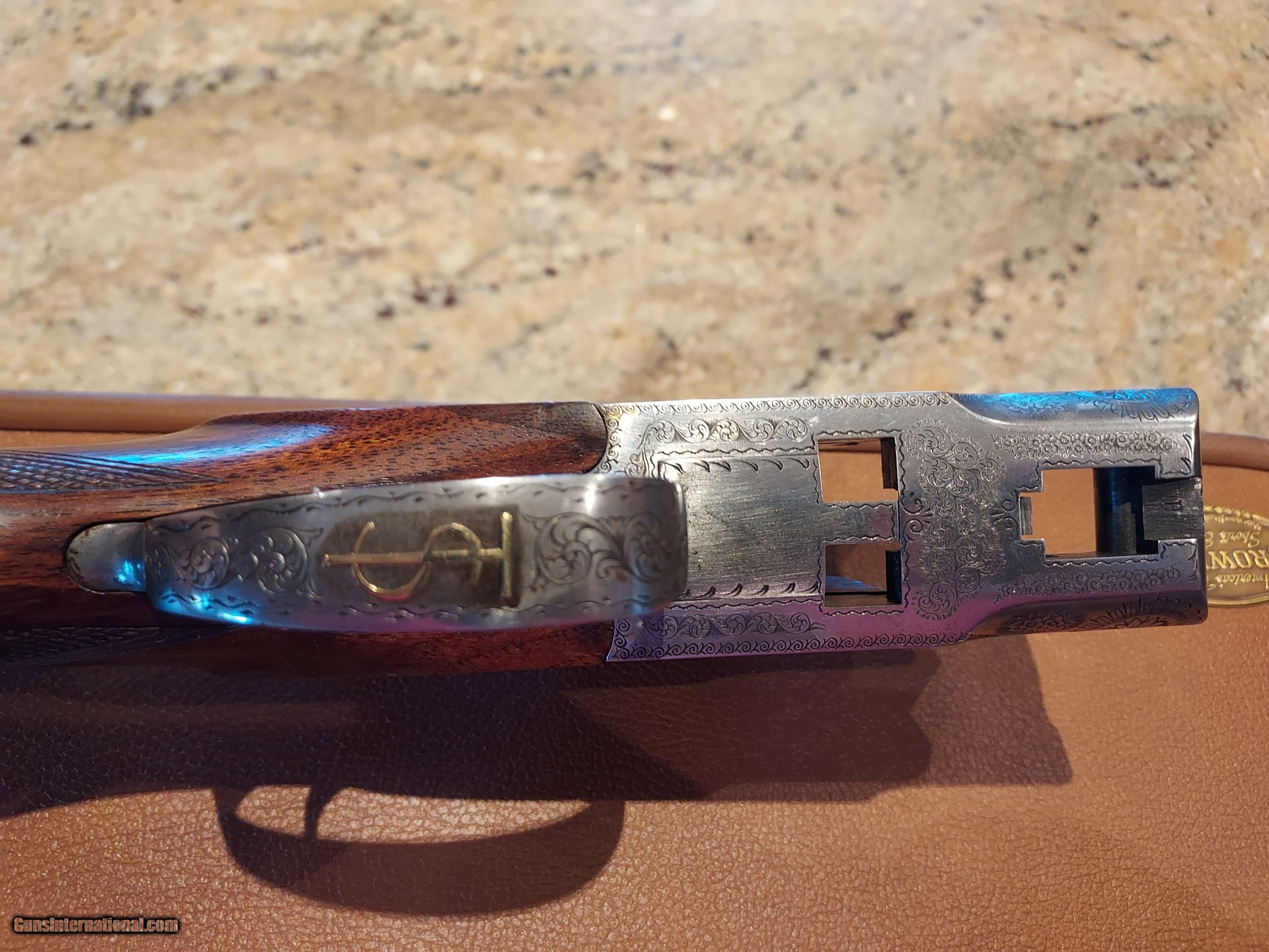 Description: This superposed was upgraded by Philip Coggan, noted English engraver who also did work for Holland & Holland and other English gun makers. The birds and scrolling have been tastefully done. and the diamond cut rib and wooden butt plate add extra appeal. The barrels are 28" mod/full. The stock measures 14 1/8" and there are no marks on the oil finished stock or forearm. A beautifully upgraded 410 priced at a grade 1 level in an exceptionally clean Hartman case. SOLD |