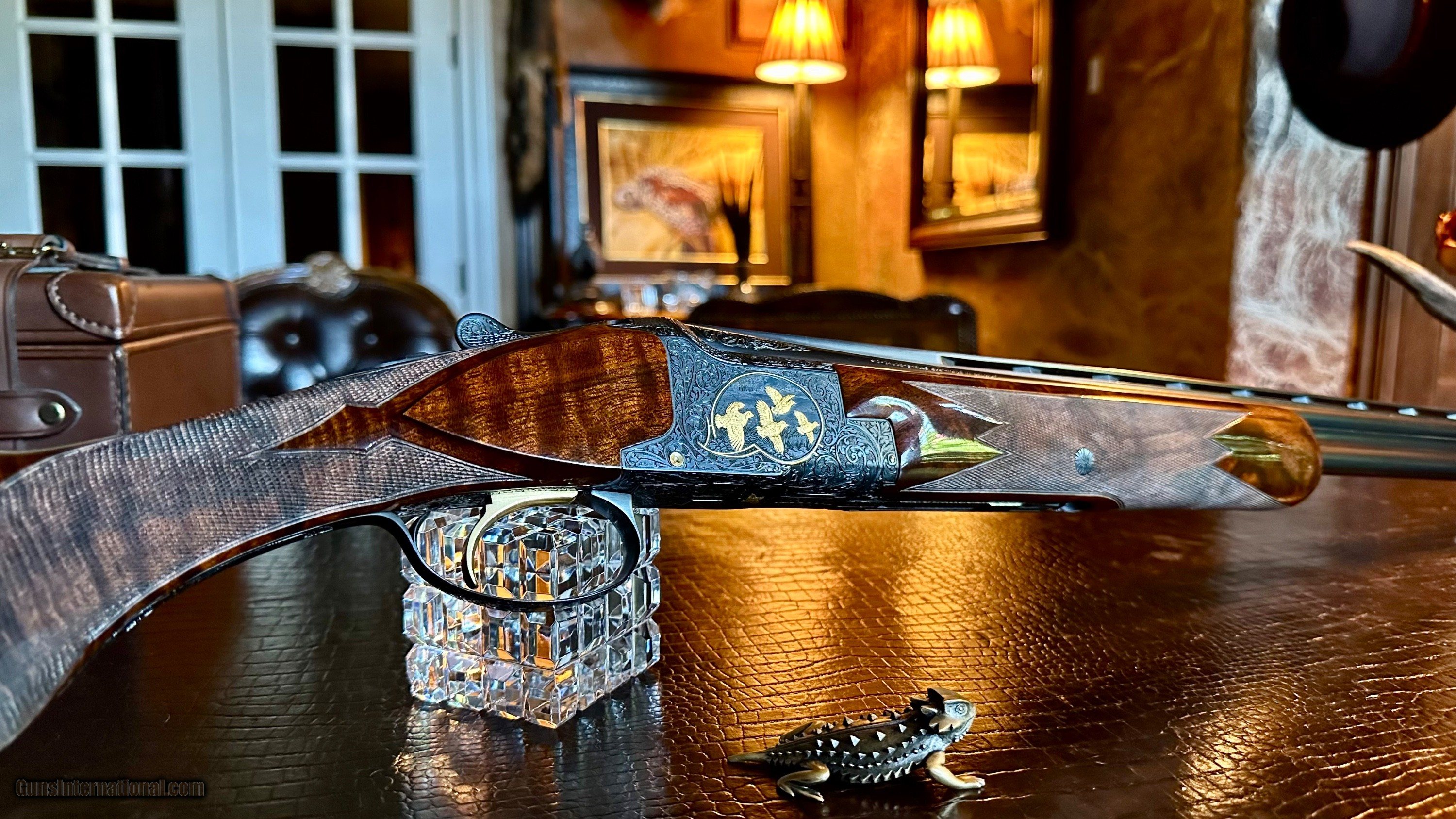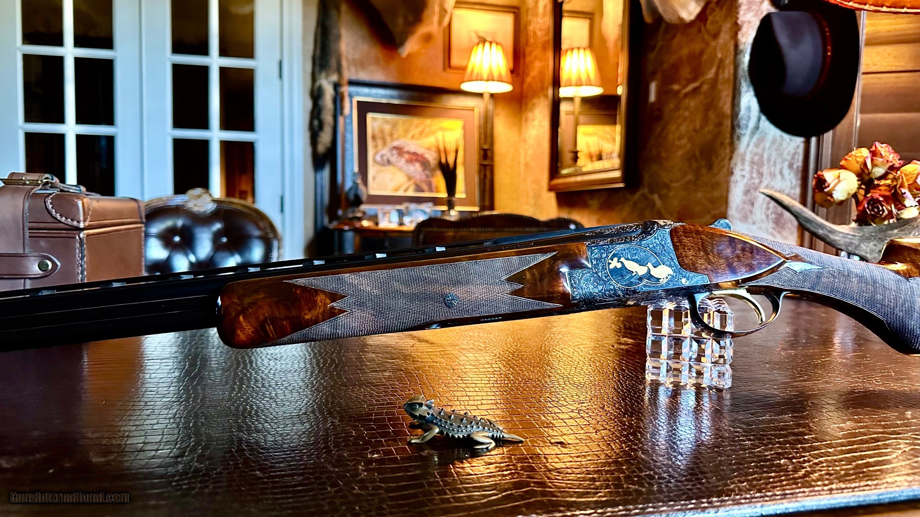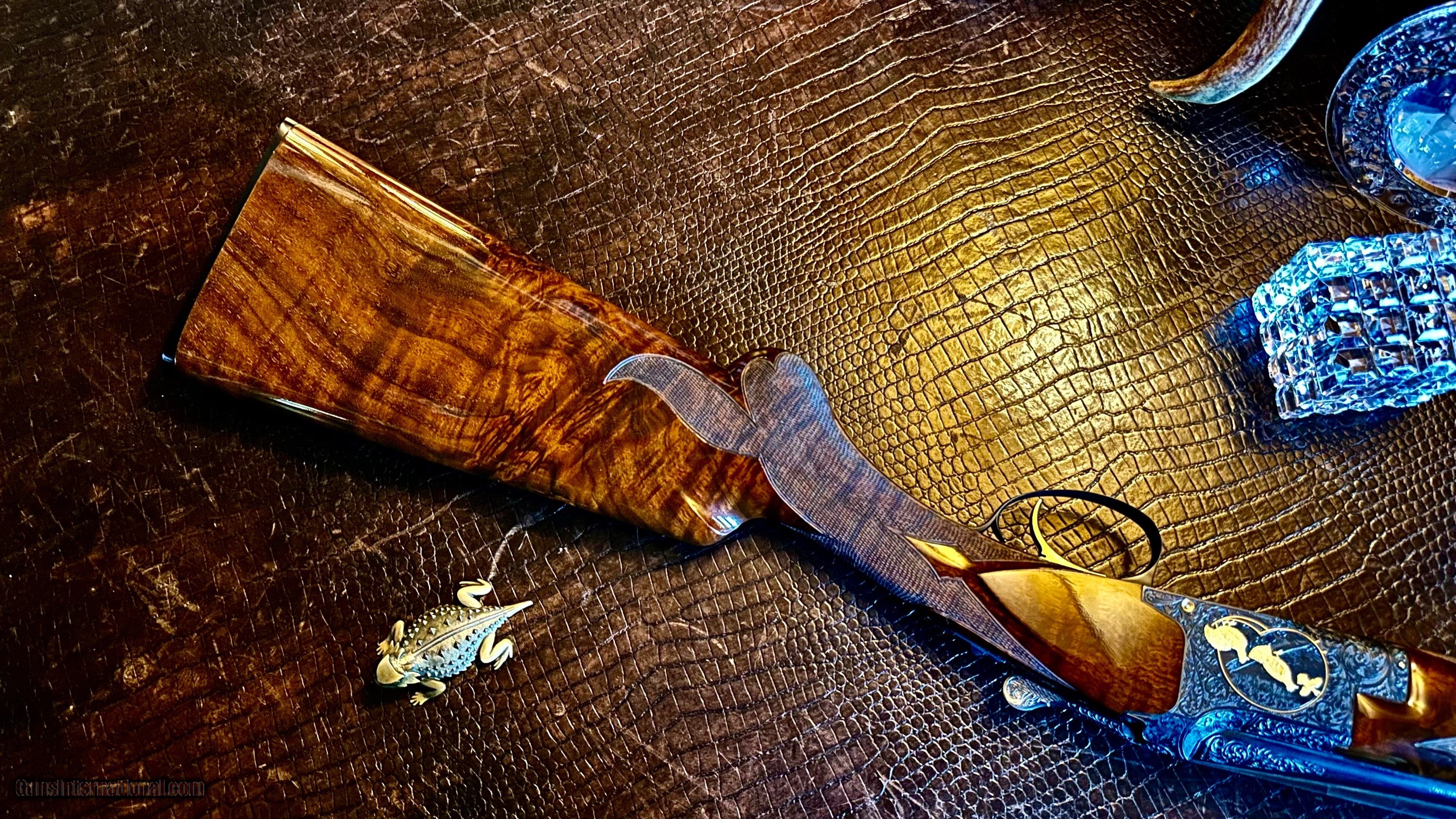 Browning Superposed 410ga Angelo Bee Custom Exhibition - 28” - IC/M - RKLT - 99% - Heavy Gold Inlays - Heavily Stippled Detailed Background