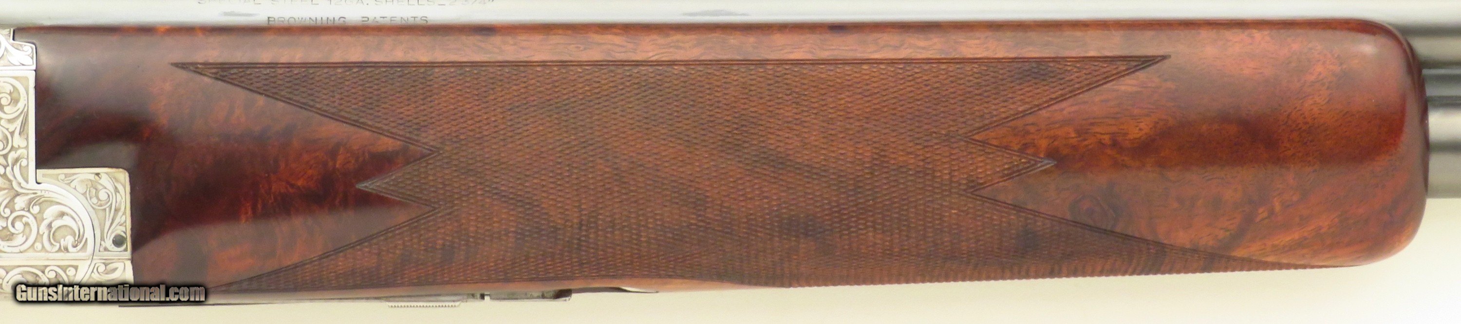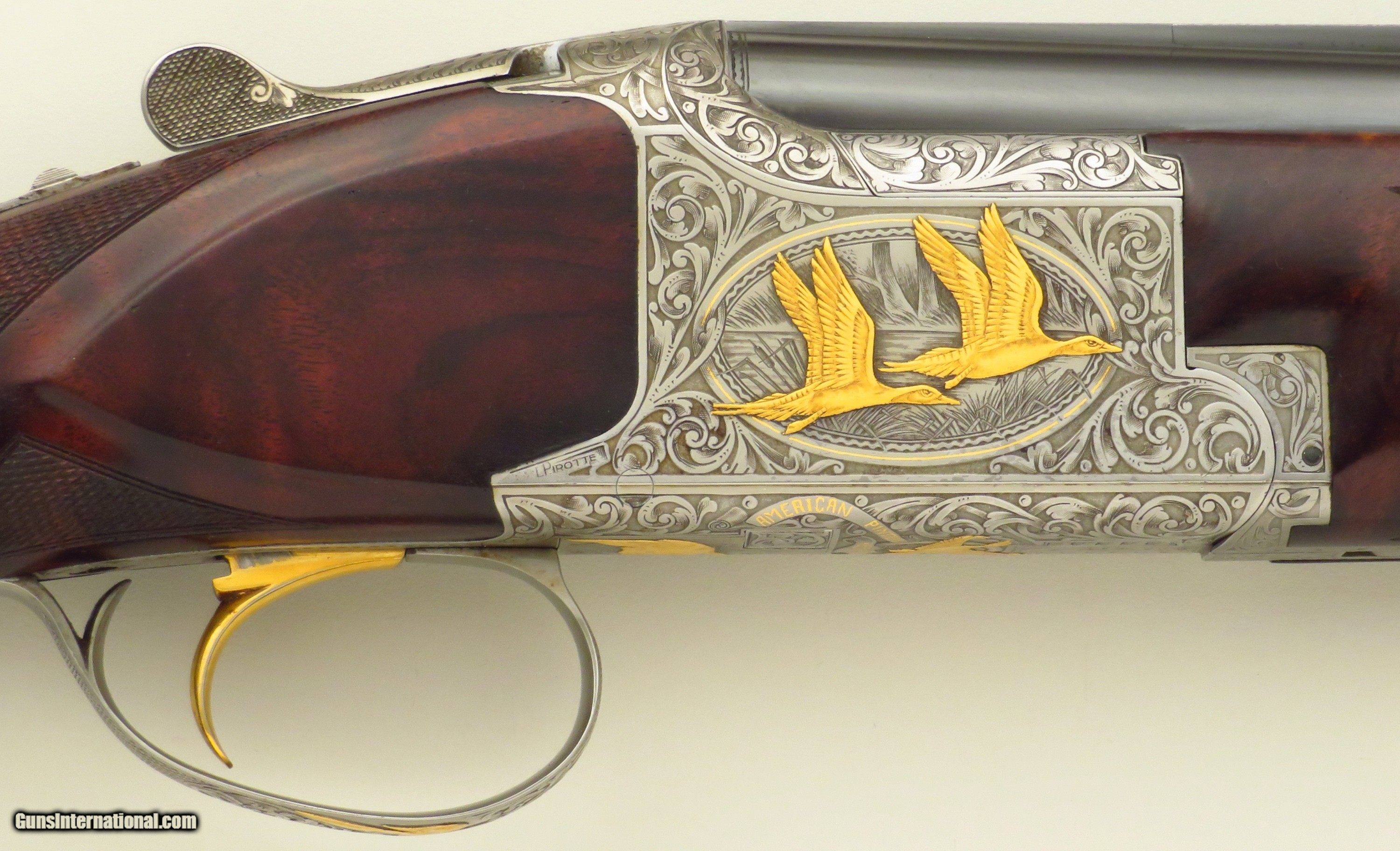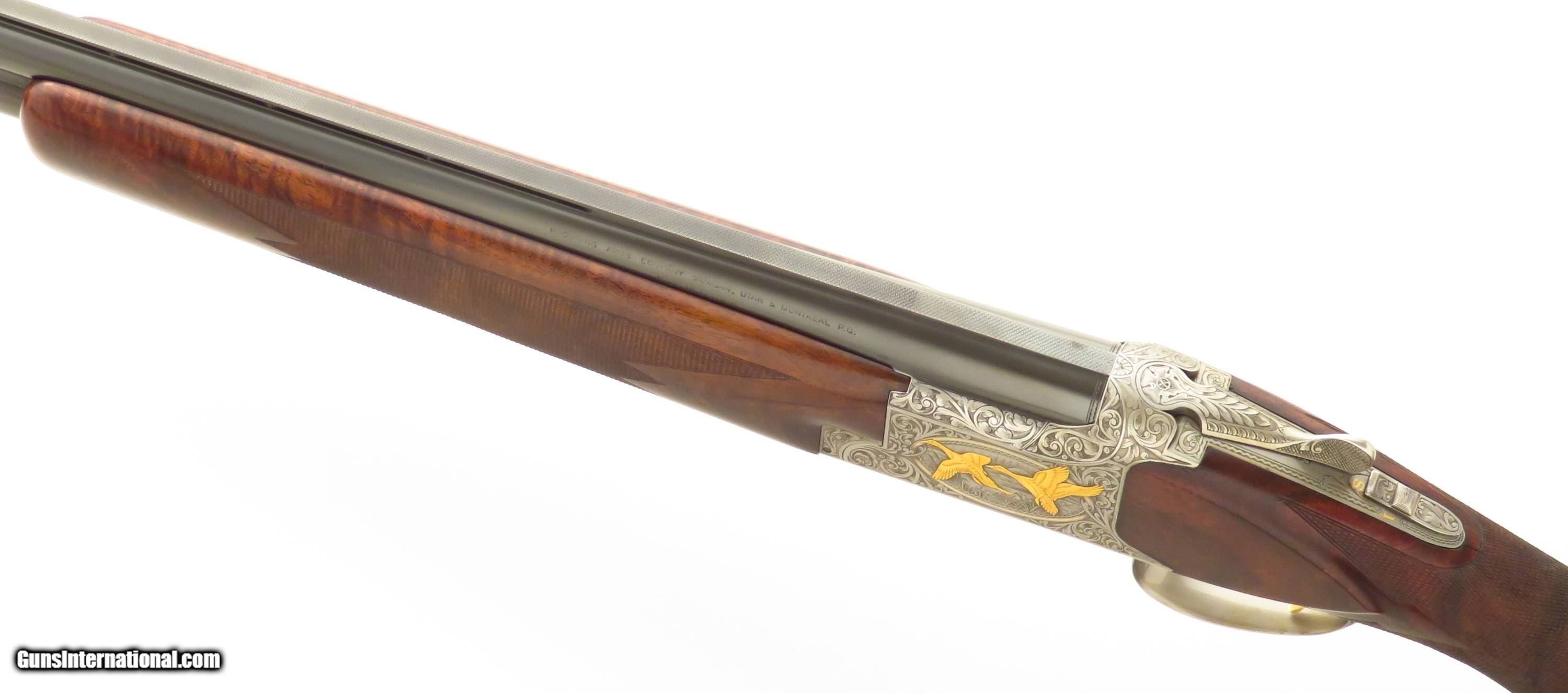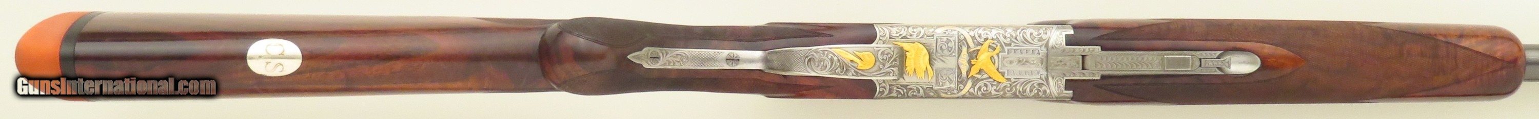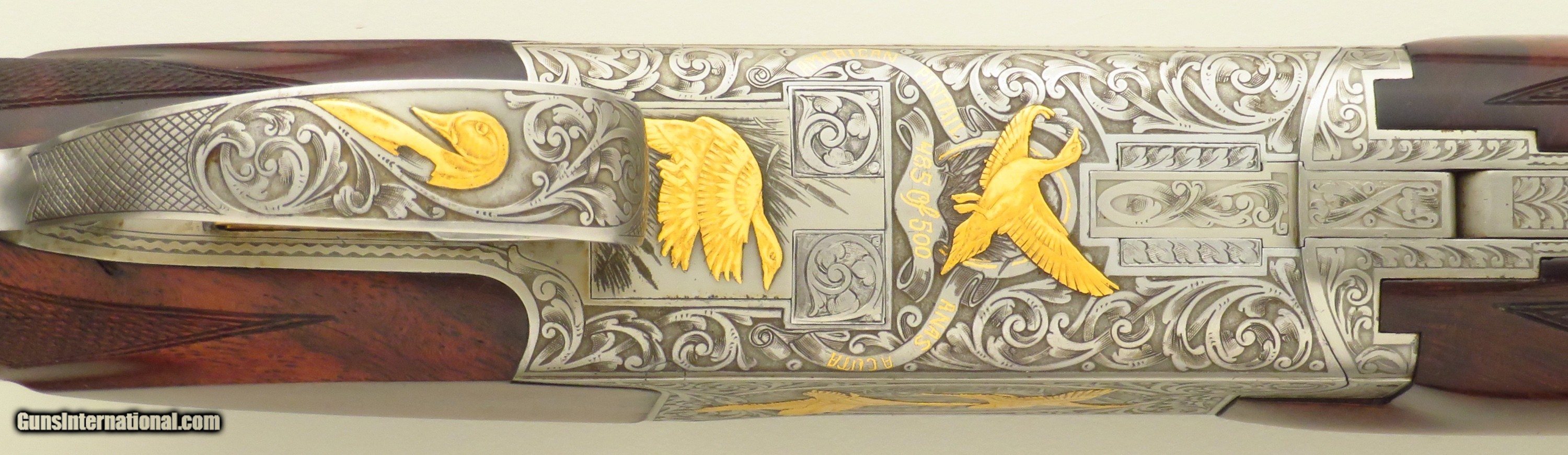 Browning Superposed America Pintail 12 gauge. Made in Belgium during 1981, serial 8H4PZ00485 (limited edition number 485/500) has 28-inch barrels (Teague tubes, matted vent rib with double beads, 2.75-inch, ejectors). Features include a rust blue barrel finish, ejectors, automatic safety with selector and a single trigger (inertia, gold). STOCK: Crafted from an outstanding exhibition Turkish blank set with grain as dark as the Democrat's chances of taking the White House in 2028, formalities include wrapping 26 lines-per-inch checkering, round knob, initial plate (engraved “CS”) and a fresh Pachmayr Decelerator recoil pad. CHOKES: Five tubes (IC/IC/M/IM plus one marked IC but measures C). ENGRAVING: Signed 2x (L. Pirotte right and M. Bodson left), the action showcases seven gold relief pintals (six flying in game scenes with gold wire borders and one silhouetted bust), each further supported by an intricate vine pattern to full coverage. The edition legend as well as “S”, “O” and “U” on the tang are also highlighted in gold. DIMENSIONS: Weight is 7.4 pounds. Length-of-pull is 14.5 inches, drops are 1.5 and 2.1 inches, and cast off is approximately .25-inch. CONDITION: Bores are bright, barrels on face and mechanics snappy. Rust blue is at least 95 percent, action finish at least 90 percent and wood approximately 95 percent. CASE: A Browning case (canvas and leather-bordered exterior, felt interior) is present and in excellent condition. No box or papers. The price is firm and layaway is available. $8,500 plus shipping.