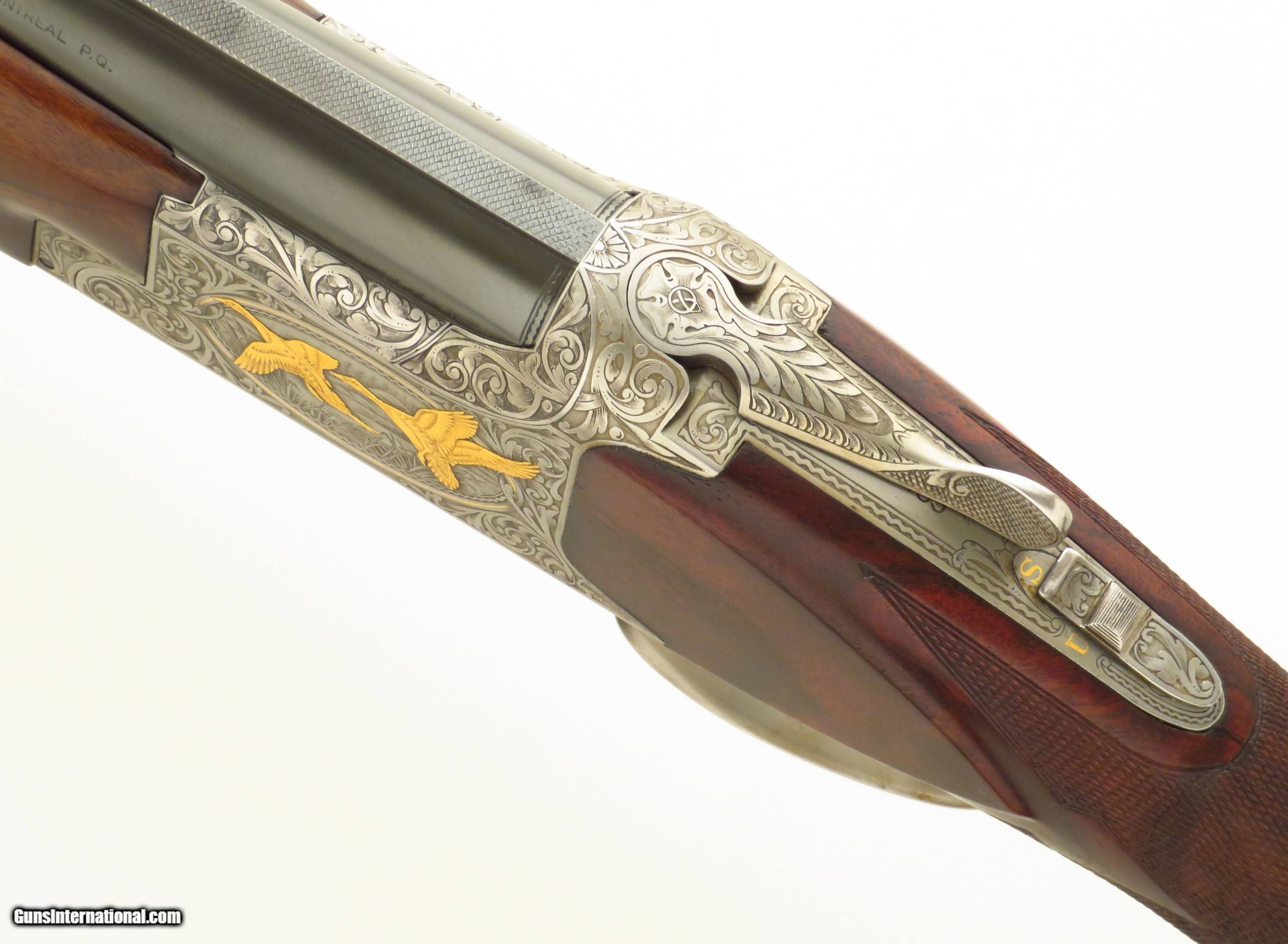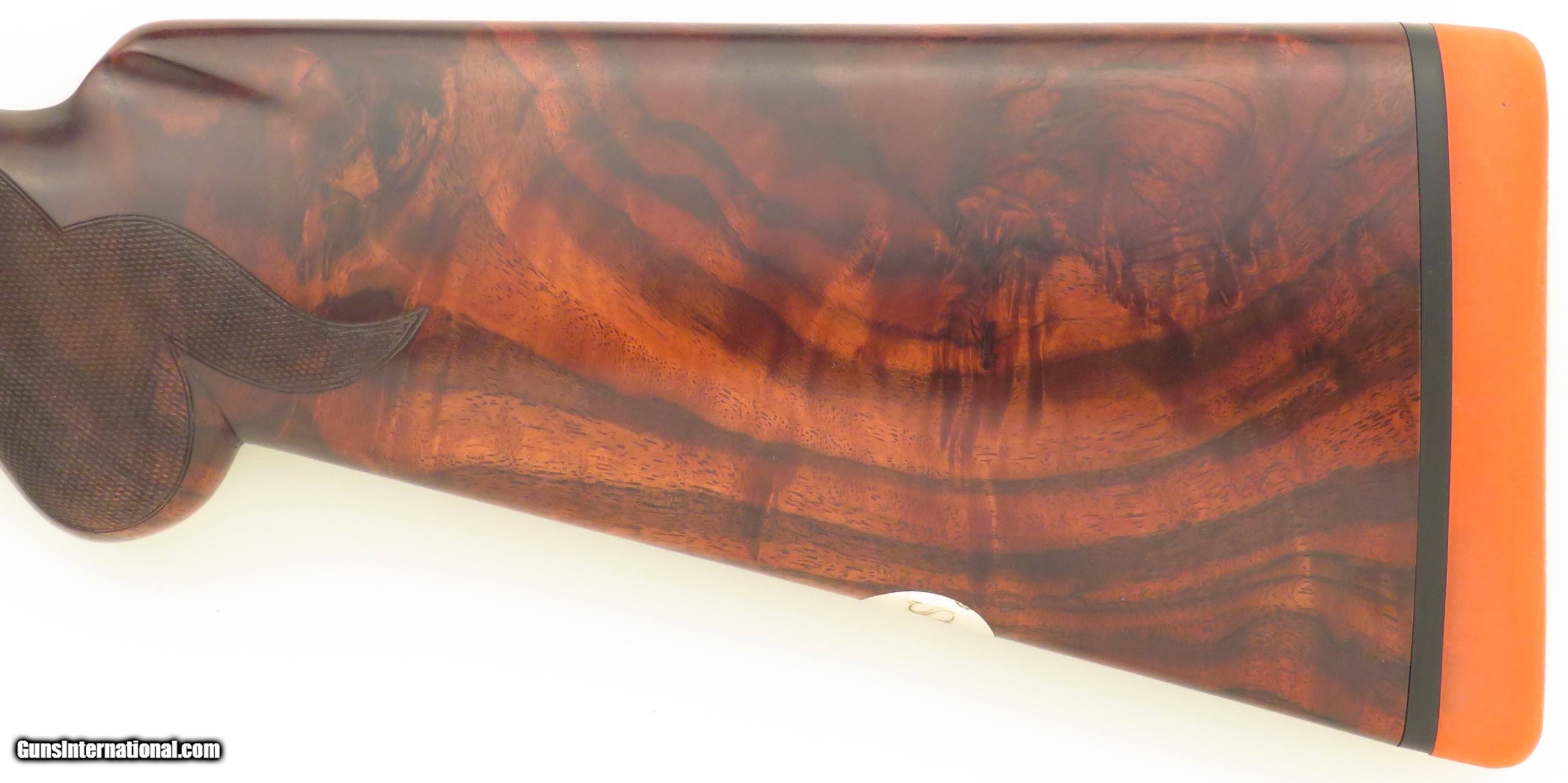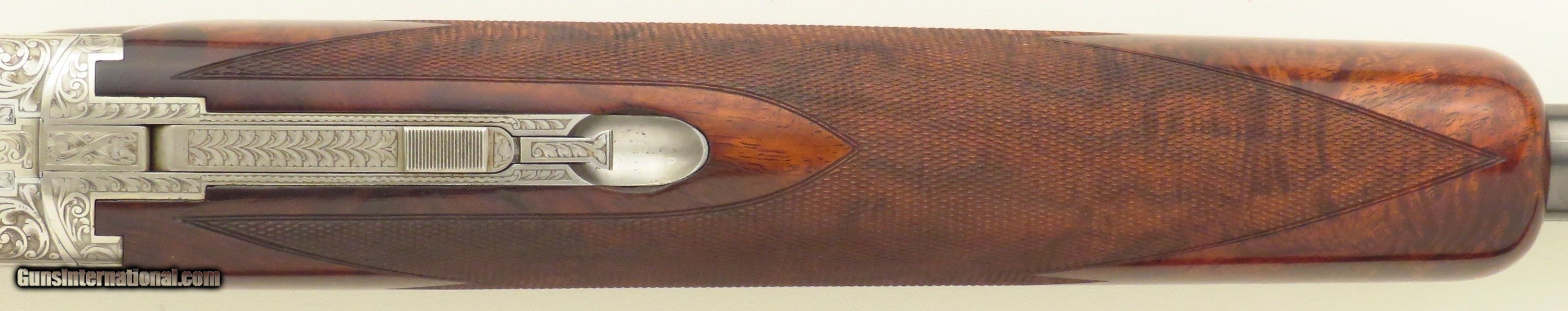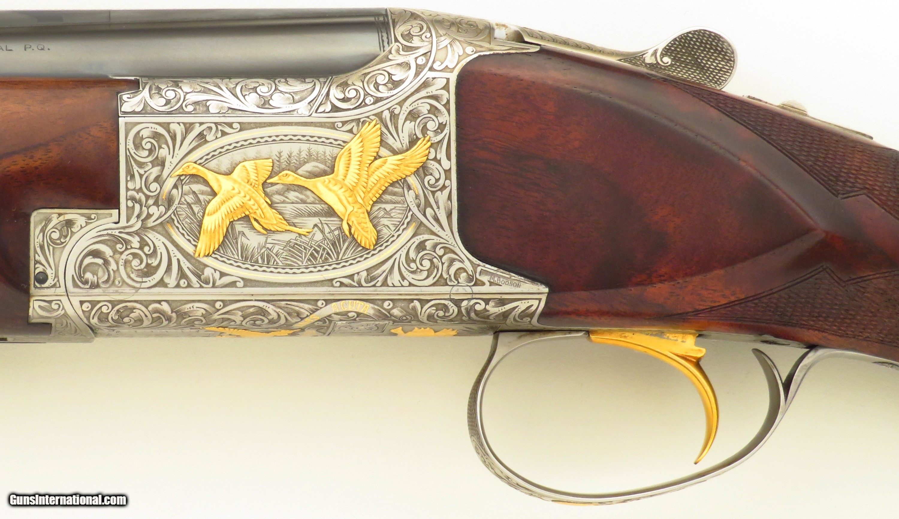Browning Superposed America Pintail 12 gauge. Made in Belgium during 1981, serial 8H4PZ00485 (limited edition number 485/500) has 28-inch barrels (Teague tubes, matted vent rib with double beads, 2.75-inch, ejectors). Features include a rust blue barrel finish, ejectors, automatic safety with selector and a single trigger (inertia, gold). STOCK: Crafted from an outstanding exhibition Turkish blank set with grain as dark as the Democrat's chances of taking the White House in 2028, formalities include wrapping 26 lines-per-inch checkering, round knob, initial plate (engraved “CS”) and a fresh Pachmayr Decelerator recoil pad. CHOKES: Five tubes (IC/IC/M/IM plus one marked IC but measures C). ENGRAVING: Signed 2x (L. Pirotte right and M. Bodson left), the action showcases seven gold relief pintals (six flying in game scenes with gold wire borders and one silhouetted bust), each further supported by an intricate vine pattern to full coverage. The edition legend as well as “S”, “O” and “U” on the tang are also highlighted in gold. DIMENSIONS: Weight is 7.4 pounds. Length-of-pull is 14.5 inches, drops are 1.5 and 2.1 inches, and cast off is approximately .25-inch. CONDITION: Bores are bright, barrels on face and mechanics snappy. Rust blue is at least 95 percent, action finish at least 90 percent and wood approximately 95 percent. CASE: A Browning case (canvas and leather-bordered exterior, felt interior) is present and in excellent condition. No box or papers. The price is firm and layaway is available. $8,500 plus shipping.