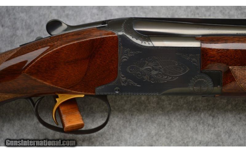 Description: Excellent condition overall with original box. Features the wide Broadway Rib on 30 inch barrels. Full Tang Flat Knob version. SOLD Manufacturer: Circa: 1973 Caliber Info: 12 Gauge Chambers: 2 3/4 Metal Condition: Excellent Wood Condition: Excellent Bore Condition: Excellent Barrels: 30" Blued Steel with Broadway Ventilated Rib Triggers: Single Selective Trigger with Ejectors Stock: Checkered Flat Knob Pistol Grip Walnut Butt Stock Stock Dimensions: LOP: 14 3/8 Fore End: Wide Semi-Beavertail Target Fore Arm Butt Pad: Browning Recoil Pad Weight: 7 lbs. 10 ozs. Sights: Bradley Style Front Sight with a Mid-Bead Chokes: Fixed: Full & Modified Item Location: Hamburg, PA |
