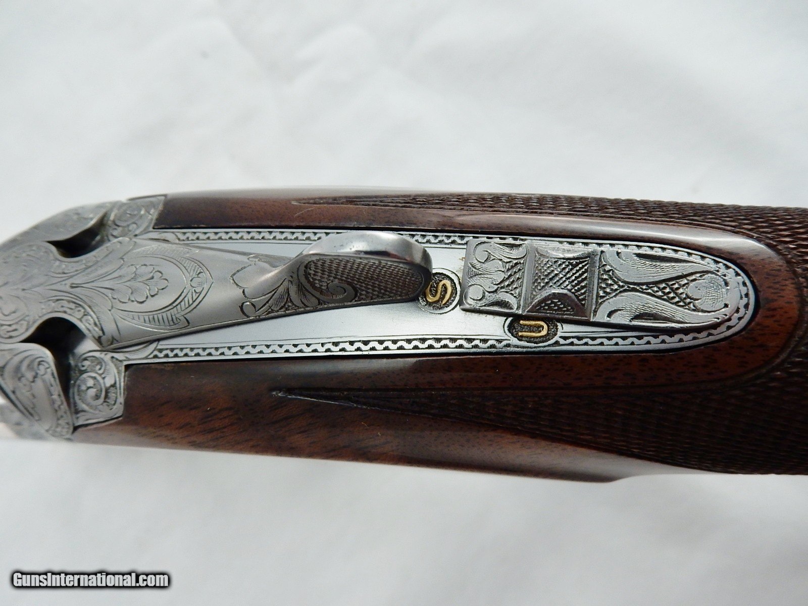 Description: This is a Browning superposed 12 gauge with 28 inch full and full choke barrels. This is a C exhibition Heidelberg D4G grade. Options are checkered butt, checkered trigger, carved fences, Schnabel forearm and hand filed rib. This gun is 99% in the case. Engraved by Jules Lewanczyk and Jean Marie Debrus. Serial # is C-208. DAC 1 1/2 DAH 2 3/8 LOP 14 1/4 Wt. 7lb 1oz. Buyer pays 100.00 shipping. Thank you. 51-2-2 SOLD |