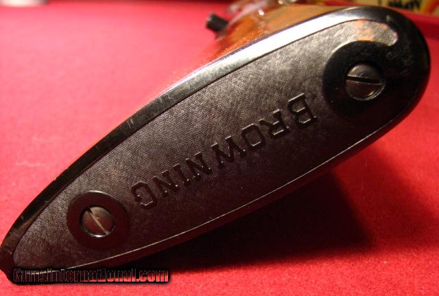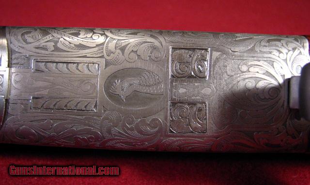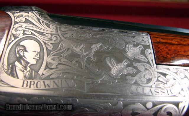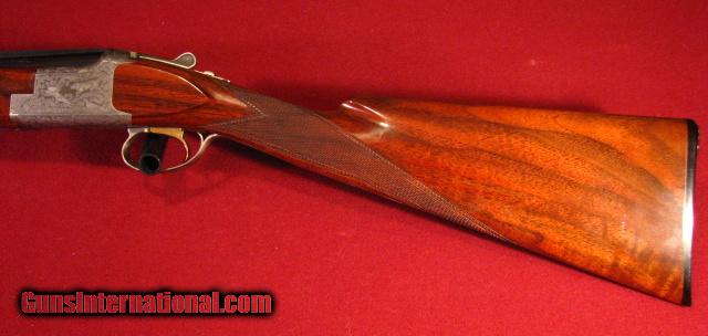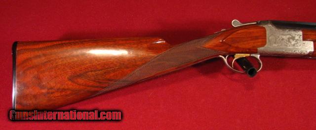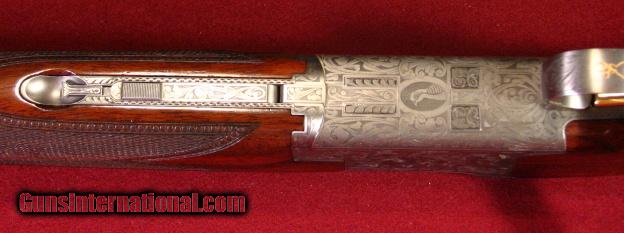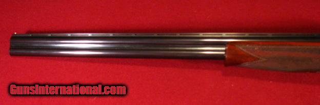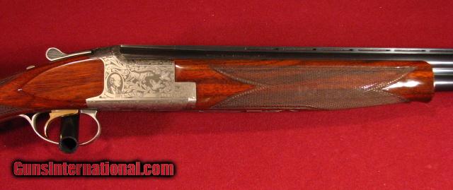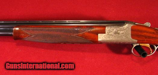 Description: Browning Superposed Classic 20 gauge with 26" IC/M ejector vent rib barrels with silver front bead. Chambered 2 3/4". Bores are excellent as new measuring .618 top and bottom. Choked .014 on top and .007 on the bottom. French gray reciever with full coverage bank note scroll and game scene engraving. Gold plated single selective trigger. Straight grip stock with nice color and contrast. Game forend with schnable tip. 14 1/4" LOP to Browning logo hard buttplate. Neutral cast. DAH-1 1/2" DAC-2 14" 5lb 14oz This gun shows as new with a few very slight safe dings in the buttstock. It may be unfired. No box or papers. Engraved as "One of Five Thousand" but less than 2500 produced. Manufactured in 1986 only. SOLD |