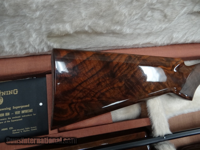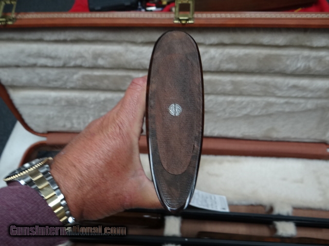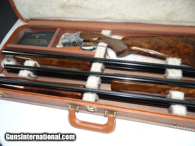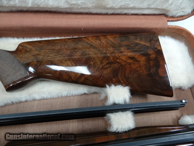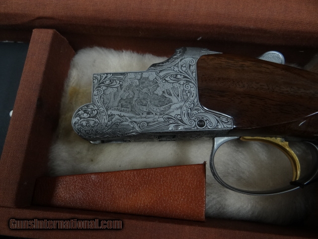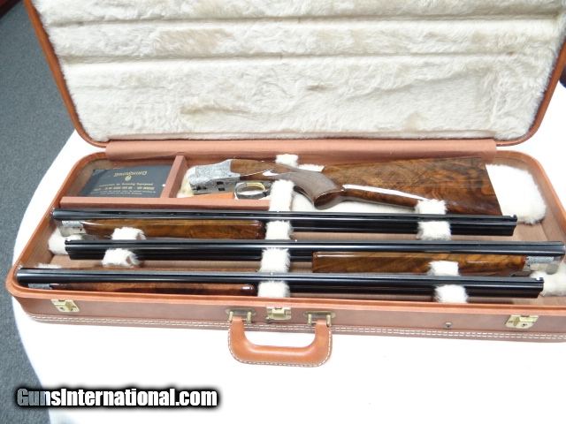 Description: Browning Superposed Diana Grade 3 gauge set 20-28 and 410 all are 28" vent rib choked sk-sk Beautiful marbled walnut pistol grip stock with a factory checkered butt, a very rare and seldom seen option. matching forends on each barrel. Outstanding deep cut Diana engraving on a grey finish. All is cased in factory 3 barrel case with some original paperwork. Gun rates 98-99% overall showing very little sign of use. SOLD |
