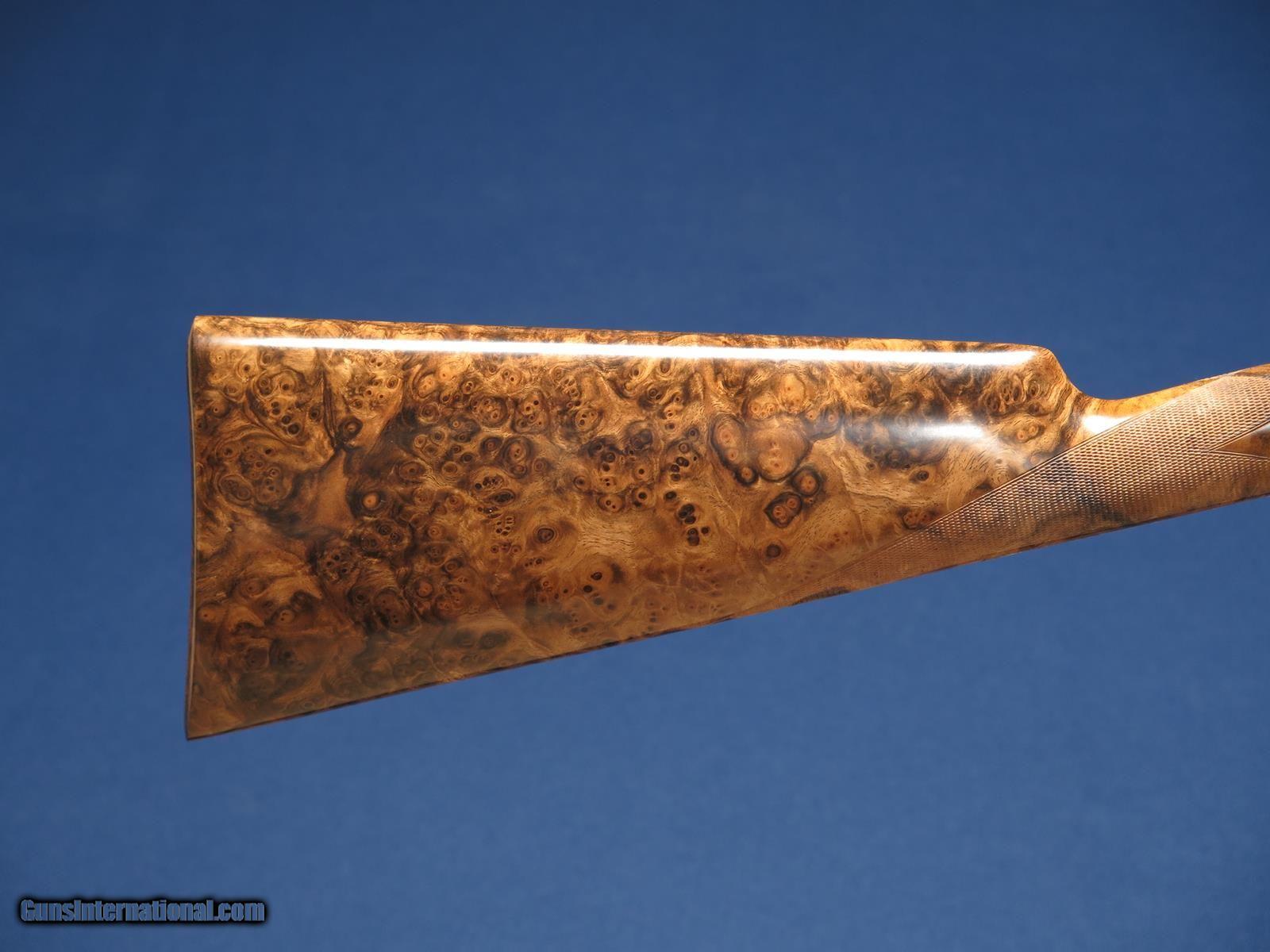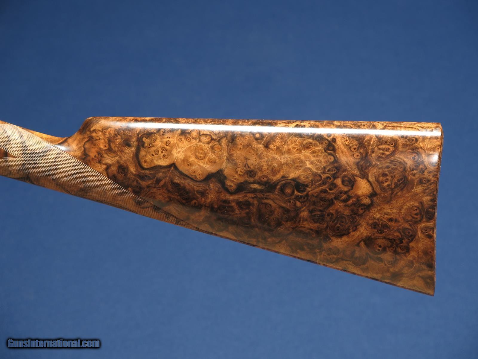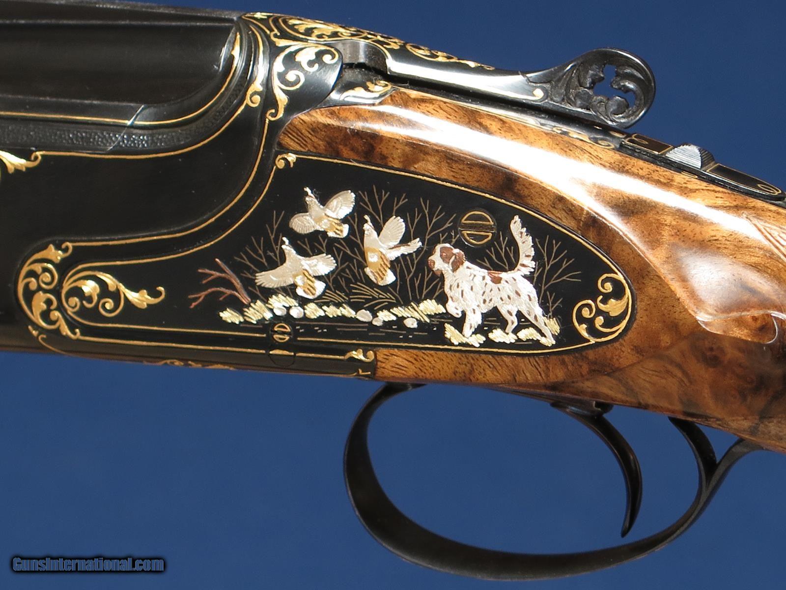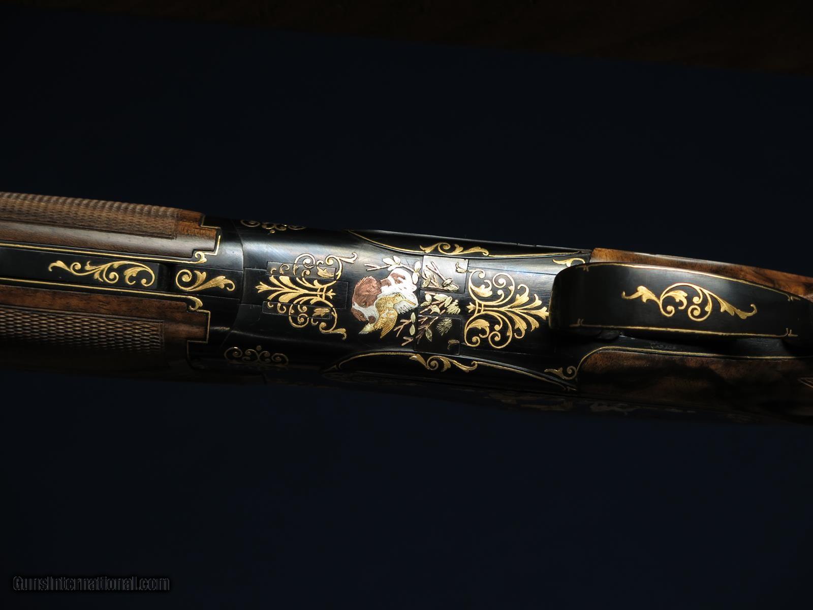 Description: Browning Superposed Custom Exhibition 28ga. 26.5 inch mod & mod. Sideplate with 3 piece forearm. Engraved by Capece from Belgium. 3 tone gold Pheasants and Quail with dogs. Beautiful grain in wood. Straight grip. 14 3/4 LOP butt plate. 98-99%. In luggage case. SOLD |
