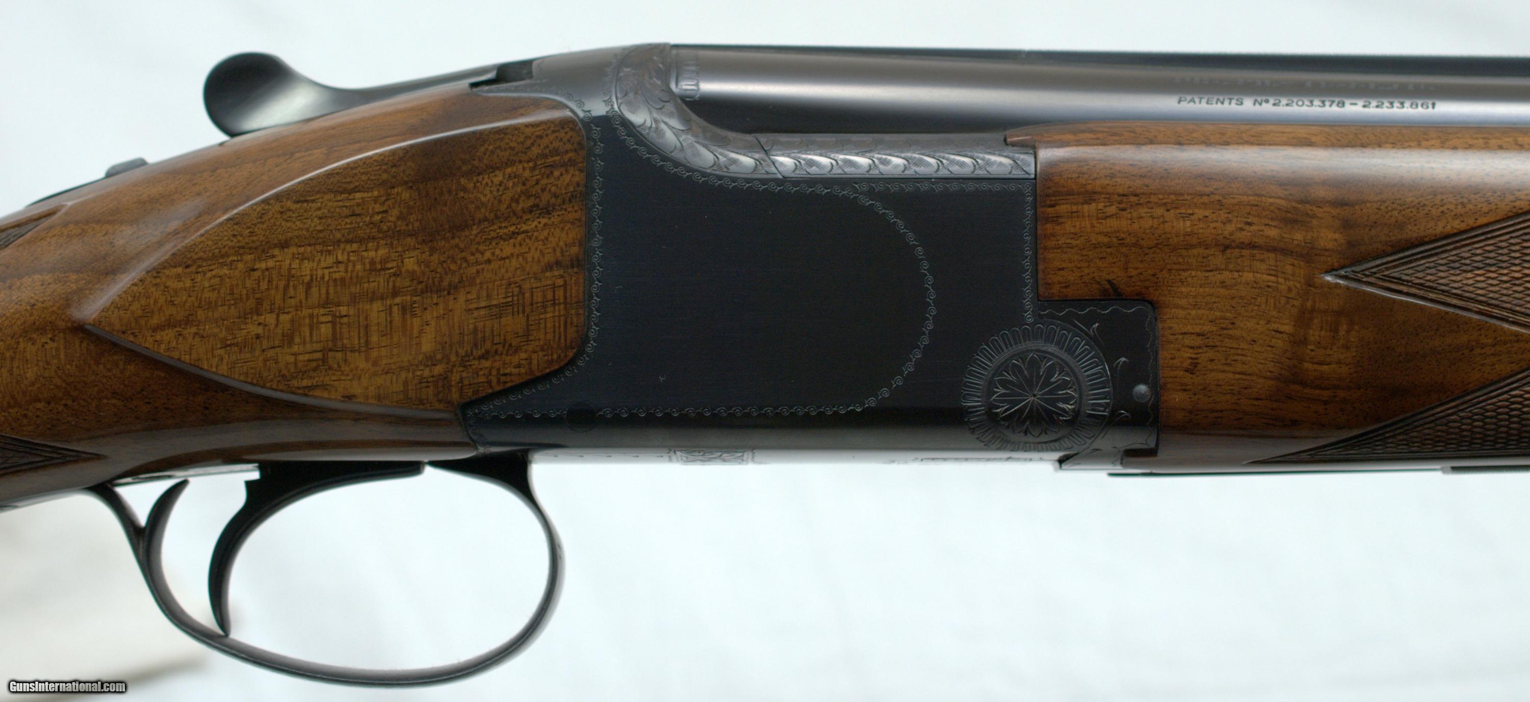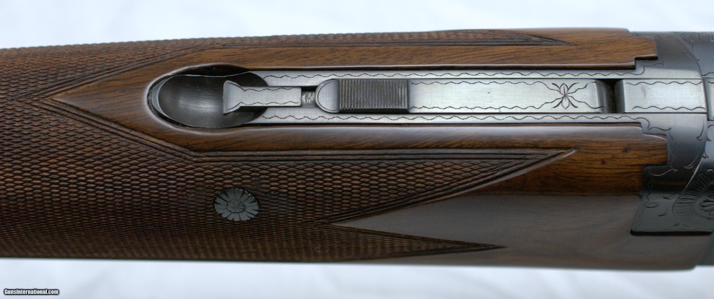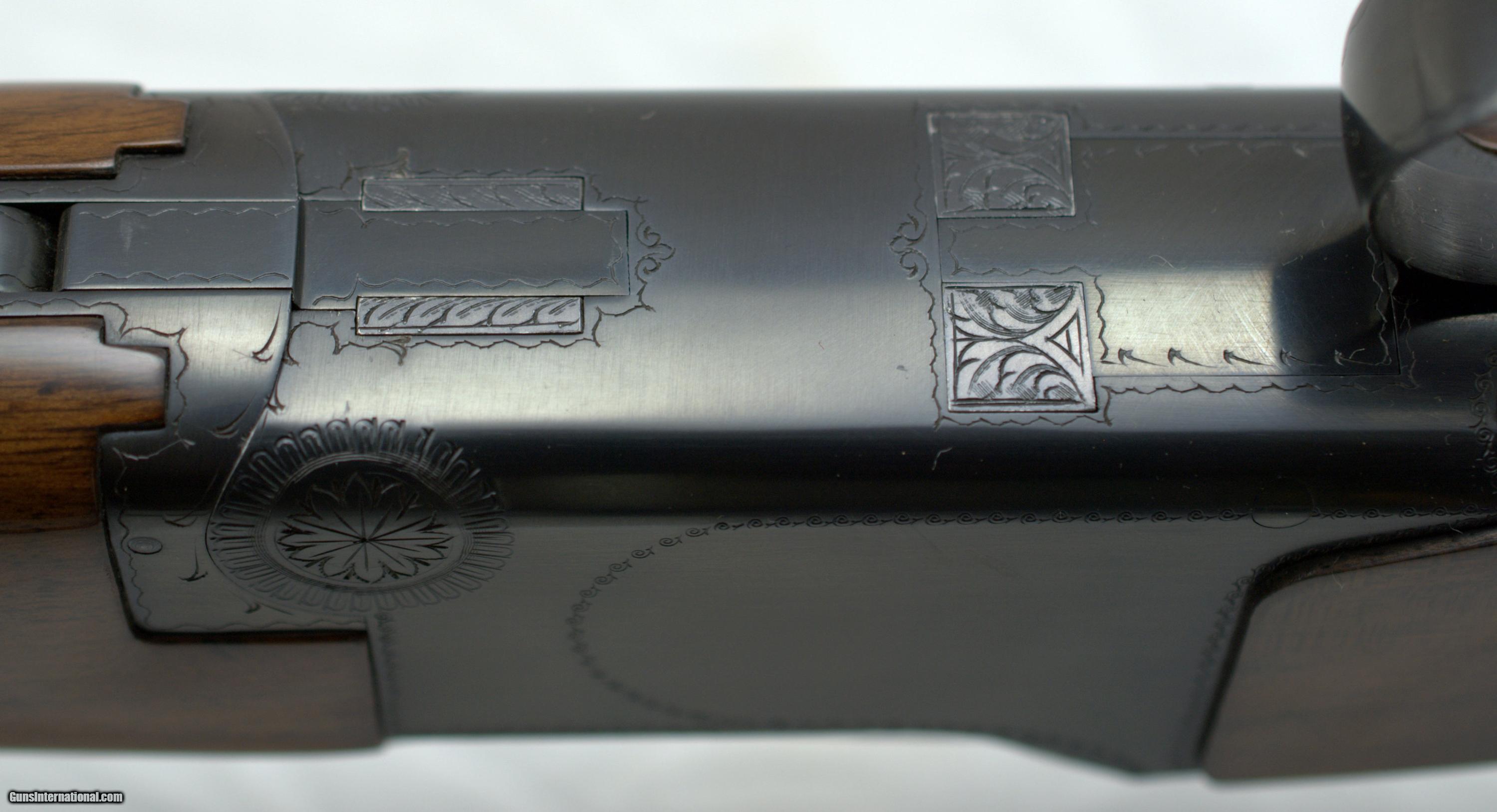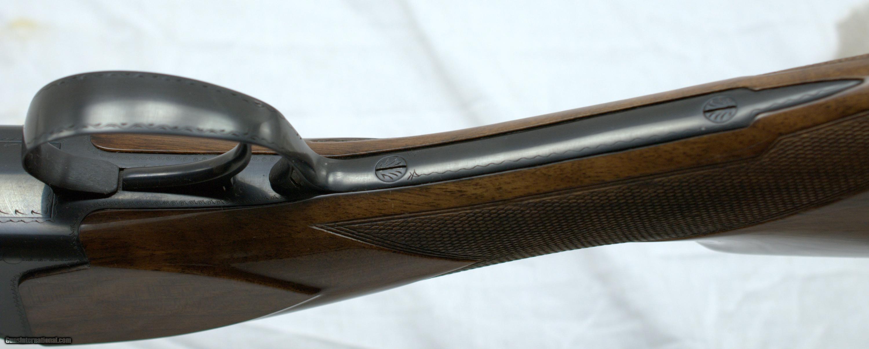 Description: BROWNING SUPERLITE GRADE I 12 GA 26-3/8″ Barrels ... 2-3/4″ chambers ... Choked: IMP CYL/MOD ... WEIGHT: 6 lbs. 11 oz. ... LOP 14 1/4" ... DAH 2 1/4" ... DAC 1 1/2" ... Single selective trigger ... automatic ejectors ... non-automatic safety ... Ventilated rib ... Steel front bead CONDITION: Extremely fine nearly new Full length matted rib with steel front bead. Receiver lightly border engraved with floral pattern near breech with some light losses on top tang near safety. Mechanics are excellent, brilliant shiny bore. Straight grip stock checkered in two point pattern with 14-1/4″ LOP over Browning hard plastic buttplate. Browning round nosed forend checkered in four point pattern, retains most of orig finish to wood and metal with a couple of light handling marks. Call with questions and see our other listings for ... "Only the best!" SOLD |
