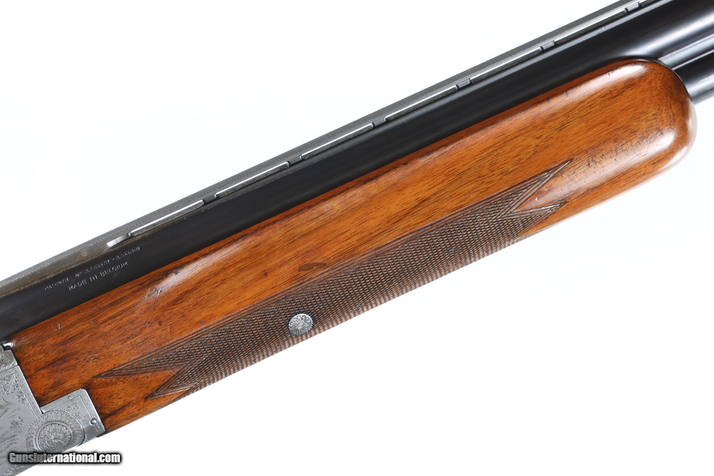 Description: Metal surfaces rate very good plus, handling marks and abrasions to wood. Mfd in Belgium 1957. Both sides of the receiver sighed "FFUNKEN". Standard grade III engraving. 2 3/4" chambers, modified/full chokes, and 14 3/8" LOP. Drop 1-½":1-7/8" 8lb 3oz This Browning Superposed Grade III O/U 12-gauge Shotgun epitomizes the attention to detail and overall brilliance of Browning’s shotgun designs. The legendary Superposed is an ongoing favorite among bird hunters, competitive target shooters, and collectors alike. Manufactured in Belgium, this Grade III is composed of a reddish-brown rubber recoil pad, a smooth walnut stock with checkering at the fore and rear grips, engraved silver medallions on each sign of the forend, a checkered and scrolled top lever, right side plate engraved with a scene depicting a gathering of grounded pheasants with the left side showing a pair of birds in flight, and on the bottom between the trigger guard and forend is a bird dog transporting a downed pheasant in his mouth. This delicately crafted double-gun is highlighted by illustrious scrollwork located throughout both side plates, the bottom of the trigger guard, upper and lower tang, and the forend release latch. • Free Shipping, No Credit Card Fees. • Lay-a-way available for this firearm. • 1/3 Down, a 1/3 in 30 Days 1/3 in 60 Days. SOLD Curio/Relic: Yes Manufacturer: Browning Model: Superposed Serial Number: 58139 Barrel Length: 30 |