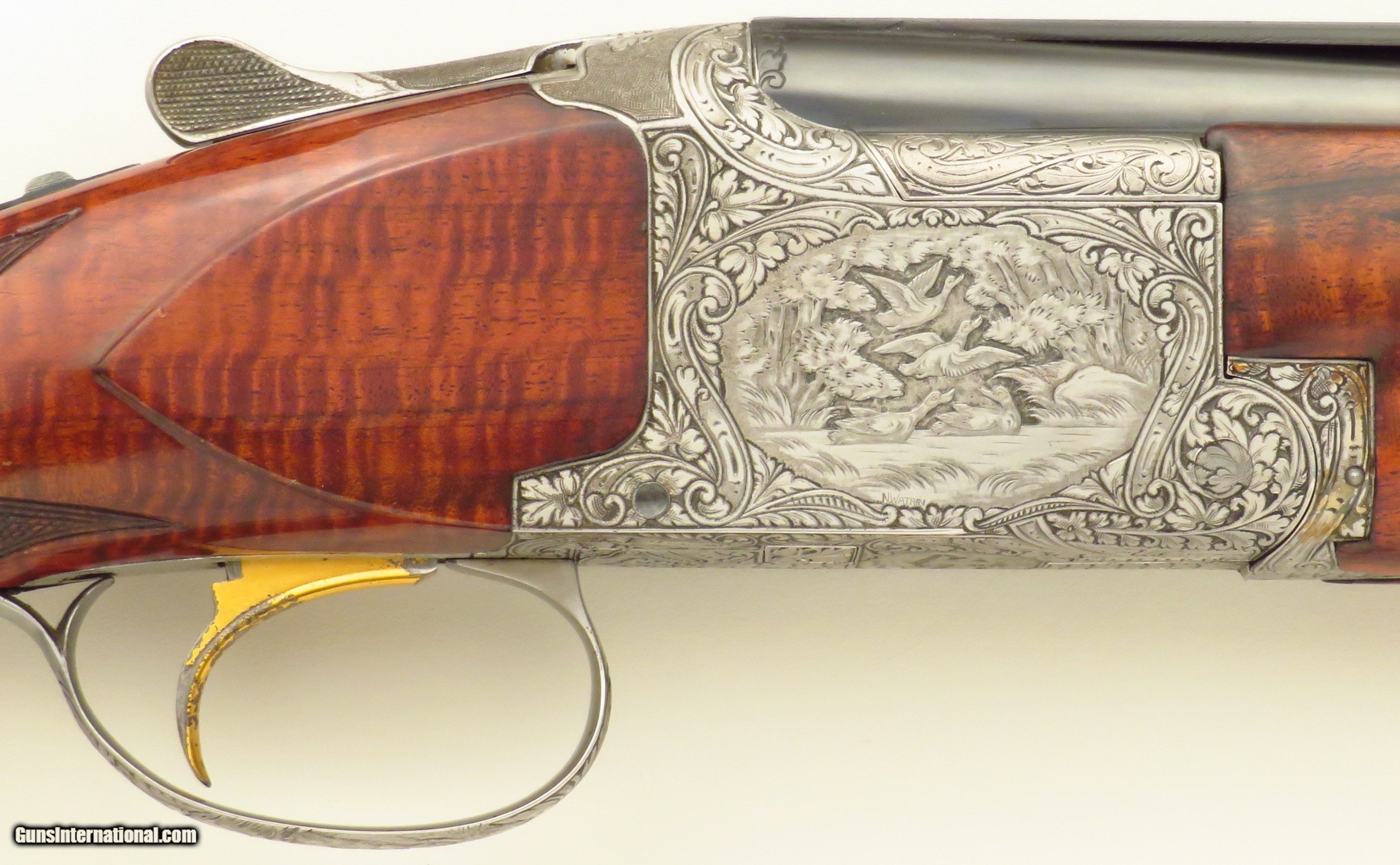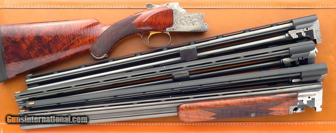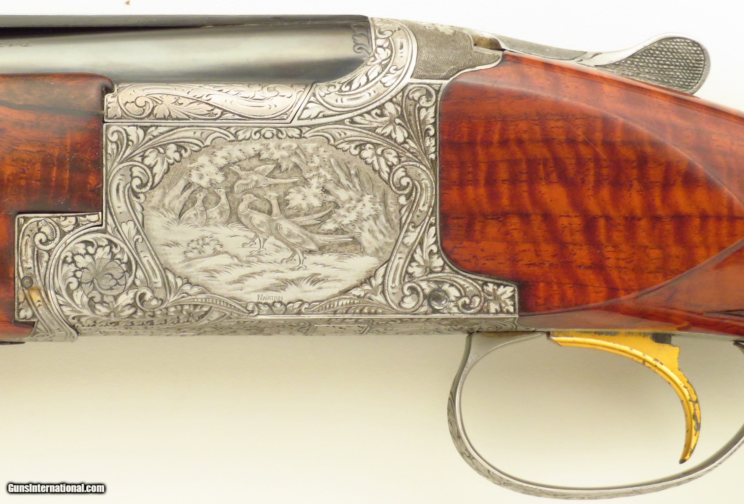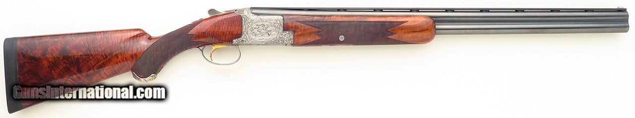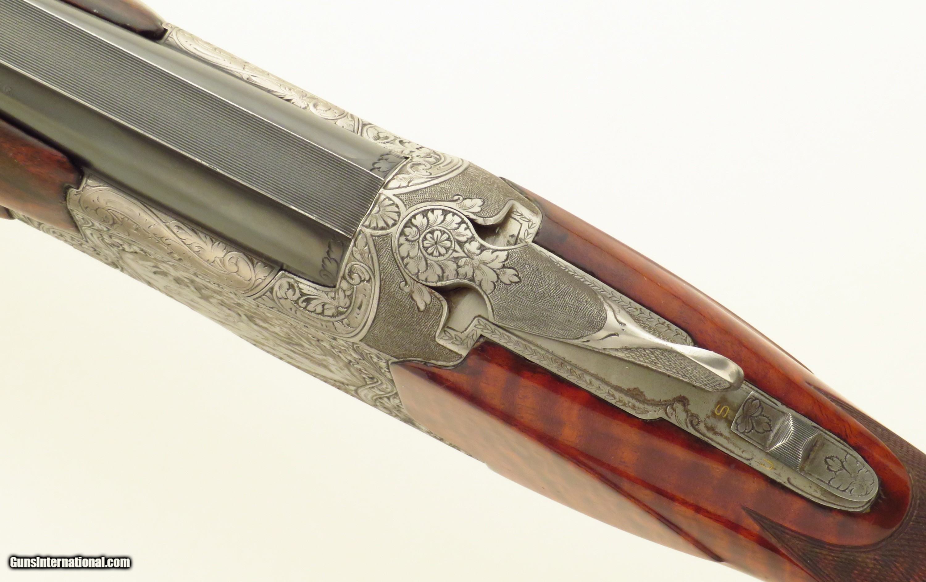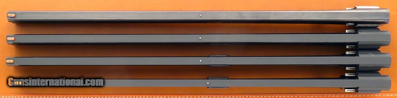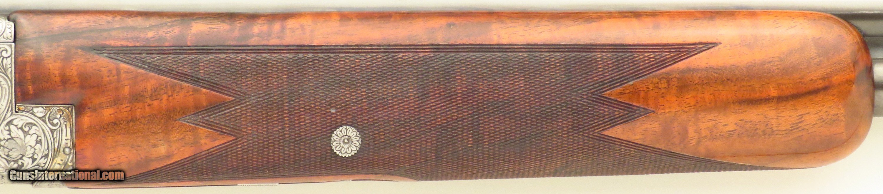 Description: Browning Superposed Grade V four-barrel skeet set 12/20/28/.410. Made in 1959, serial 75355 (matching including all barrel sets) has 26.5-inch barrels (.410 barrels are 26.0 inches) with fixed SK/SK chokes. Each set is topped by a Simmons vent rib (.500-inch wide, serrated, red front bead, white middle bead) and each has ejectors. Chamber lengths are 12/20/28 at 2.75-inches with .410 being 2.5-inches. Features include a mechanical safety/selector, mechanical trigger and a common forend. DIMENSIONS: Weight (with 12 gauge barrels) is 7.8 pounds. Length-of-pull is 13.6 inches over the pad. Drops are 1.5 and 2.1 inches, and cast off is approximately .30-inch. ENGRAVING: Signed by Watrin 2x, full coverage includes four game scenes supported by leafy vine with coverage extending over the latch, lever, guard and tangs. CONDITION: All bores are bright and all sets on face. The opening lever rests just right of center with the 12 gauge barrels attached and far right with the others. Ejection is proper across all sets. Forend fit is tight. Blue over the barrel sets is approximately 95 percent. Receiver finish is also approximately 95 percent with all engraving tack sharp. As refinished, the forend has stabalized cracks on either side at the upper rear corners and some minor impressions. Overall condition is approximately 85 percent. As refinished and possibly restocked, the butt shows at approximately 95 percent. A grip shield has been added. INCLUSIONS: An unbranded four-barrel locking takedown case in excellent condition is present. The price is firm and layaway is available. $6,500 plus shipping. SOLD Shotgun Gauge: 28 Gauge |