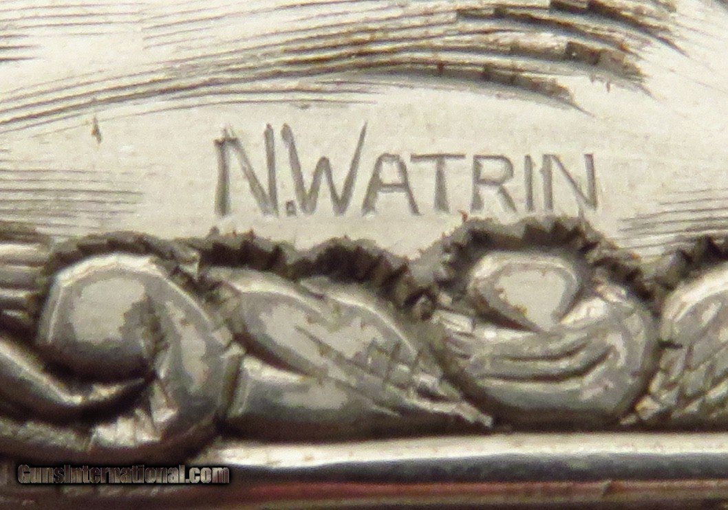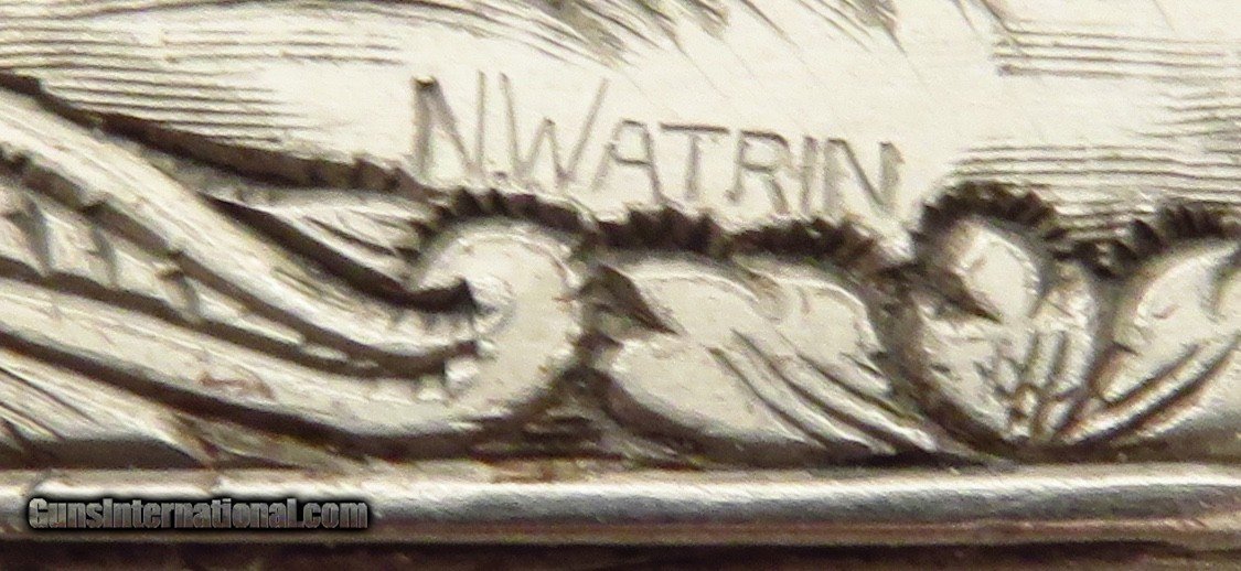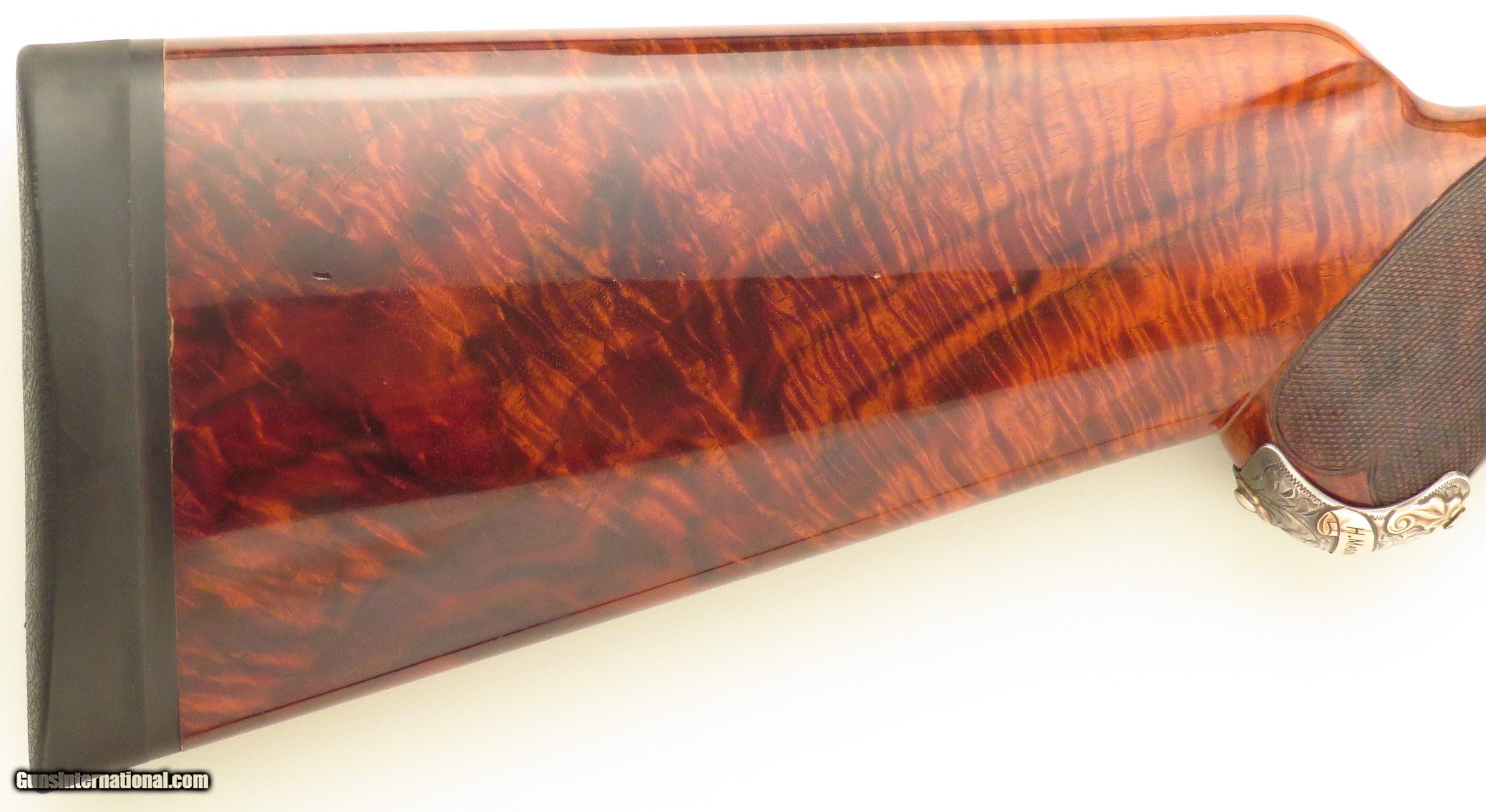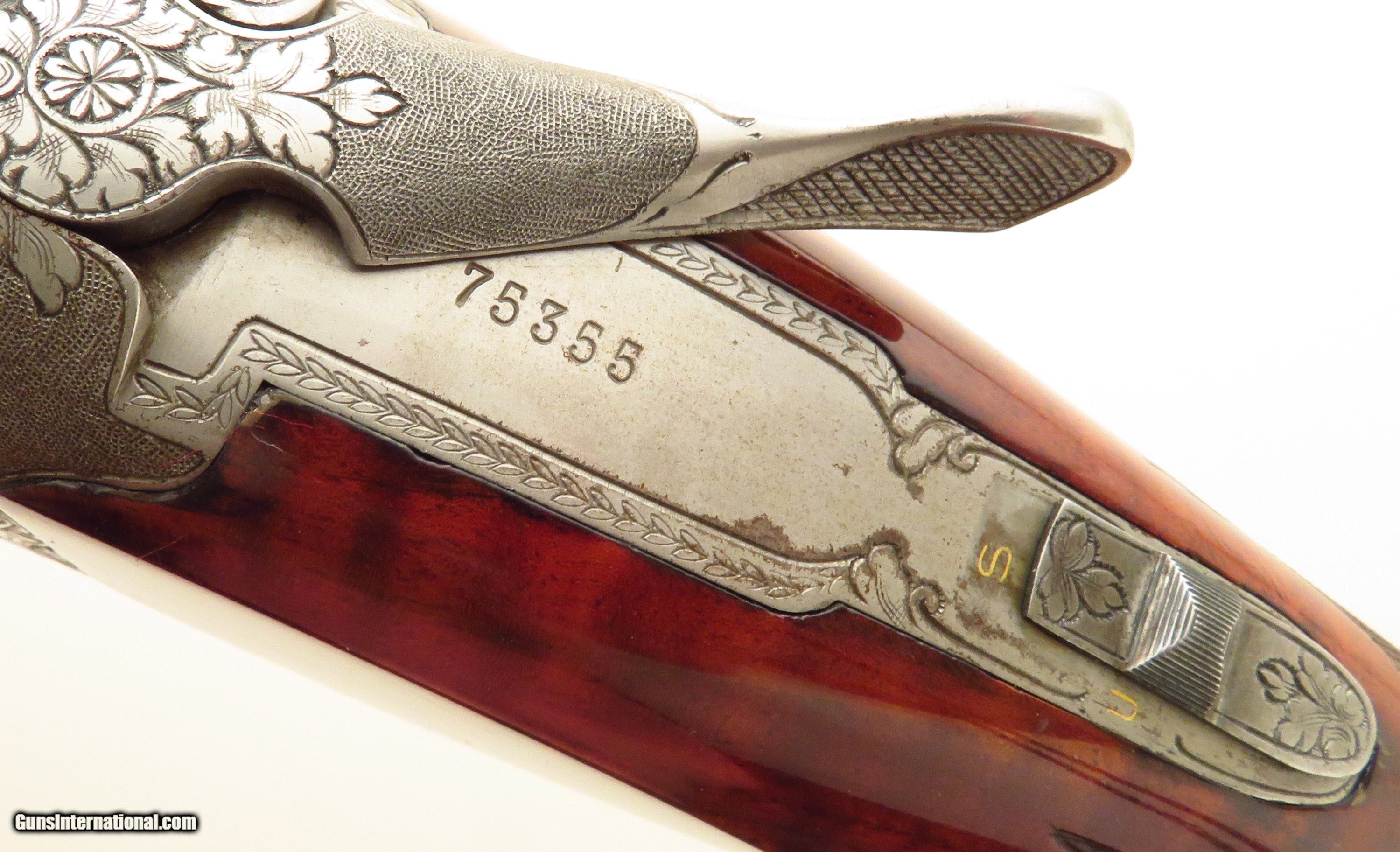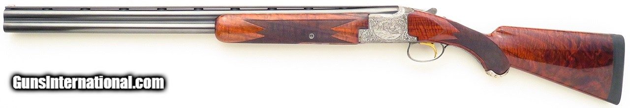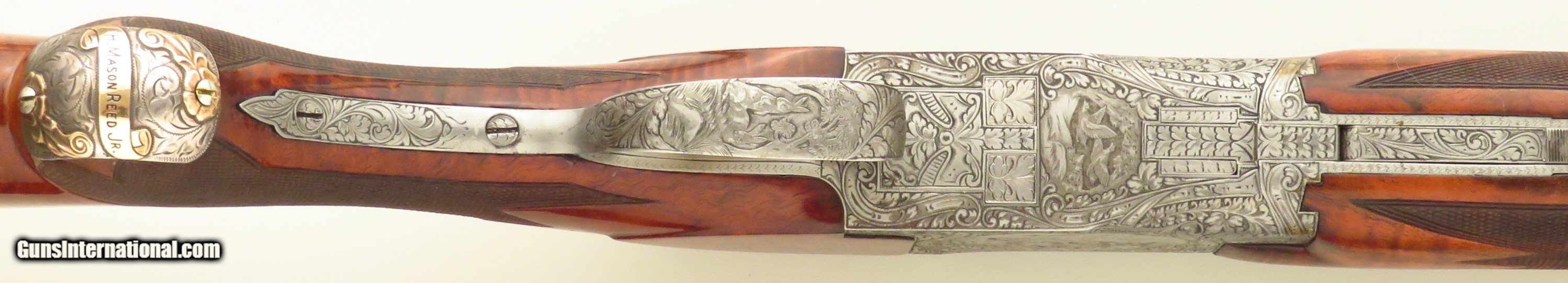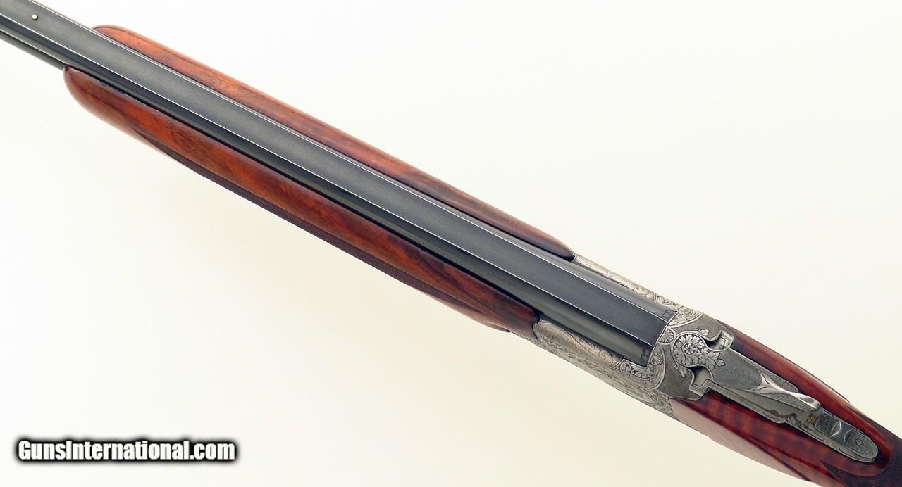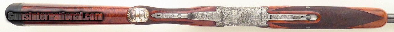 Description: Browning Superposed Grade V four-barrel skeet set 12/20/28/.410. Made in 1959, serial 75355 (matching including all barrel sets) has 26.5-inch barrels (.410 barrels are 26.0 inches) with fixed SK/SK chokes. Each set is topped by a Simmons vent rib (.500-inch wide, serrated, red front bead, white middle bead) and each has ejectors. Chamber lengths are 12/20/28 at 2.75-inches with .410 being 2.5-inches. Features include a mechanical safety/selector, mechanical trigger and a common forend. DIMENSIONS: Weight (with 12 gauge barrels) is 7.8 pounds. Length-of-pull is 13.6 inches over the pad. Drops are 1.5 and 2.1 inches, and cast off is approximately .30-inch. ENGRAVING: Signed by Watrin 2x, full coverage includes four game scenes supported by leafy vine with coverage extending over the latch, lever, guard and tangs. CONDITION: All bores are bright and all sets on face. The opening lever rests just right of center with the 12 gauge barrels attached and far right with the others. Ejection is proper across all sets. Forend fit is tight. Blue over the barrel sets is approximately 95 percent. Receiver finish is also approximately 95 percent with all engraving tack sharp. As refinished, the forend has stabalized cracks on either side at the upper rear corners and some minor impressions. Overall condition is approximately 85 percent. As refinished and possibly restocked, the butt shows at approximately 95 percent. A grip shield has been added. INCLUSIONS: An unbranded four-barrel locking takedown case in excellent condition is present. The price is firm and layaway is available. $6,500 plus shipping. SOLD Shotgun Gauge: 28 Gauge |
