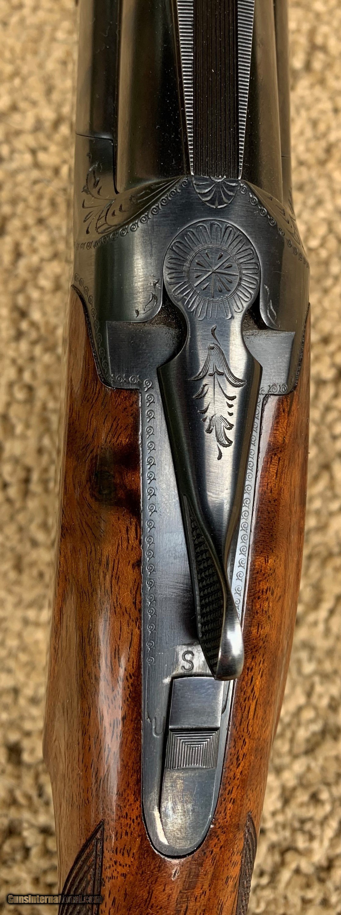 Description: Browning Superposed Lightning Broadway O/U 12 Gauge Short Tang, Square Knob. 30" Barrels, Choked Full / Mod ( * **) Broadway Rib Condition: Excellent: A very pretty gun with fancy wood showing very little use. 1967 Mfg. NO SALT!! See pictures Original Finish on both Wood & Metal One very tiny mark on wood behind trigger guard. Very light wear showing to gold plating on right side of trigger. See Pics. More pictures available upon request. Includes a Browning Factory Luggage Type Case also in excellent condition. Buyer pays actual shipping charge. Postal money order or cashiers check Please.. Buyer pays actual shippimg cost. SOLD Curio/Relic: Yes Shotgun Gauge: 12 Gauge Manufacturer: Browning Model: Superposed Lightningg Serial Number: 77445 S7 Barrel Length: 30 Ejectors: yes Condition: Excellent Metal Condition: Excellent Wood Condition: Excellent Bore Condition: Mint Triggers: Single Selective Stock: Walnut Fancy Stock Comb: 1 3/8 Stock Heel: 1 3/4 Stock Cast: Slight Right Butt Pad: KICK EZZ LOP: 14 Rib: Broadway Finish: Blue Sights: Ivory Fr & Center Manufacture Date: 1967 Chokes: Full / Mod Case: Browning Case Item Location: Colorado |