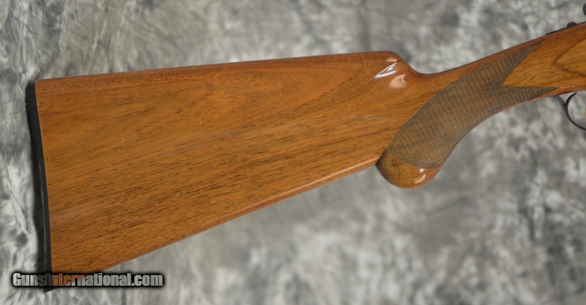 Description: Browning Superposed Lightning Field 20GA with 28" fixed choke (IC/M) barrels, 3" chamber. Factory blued receiver with roll engraving, minor bluing wear on scallops of receiver and top-lever, short tang. Factory round knob Prince of Wales pistol grip to factory butt plate, minor handling marks in stock but original finish remains in excellent condition; fully checkered game forearm. Includes case (not factory original). In excellent mechanical condition. SOLD |