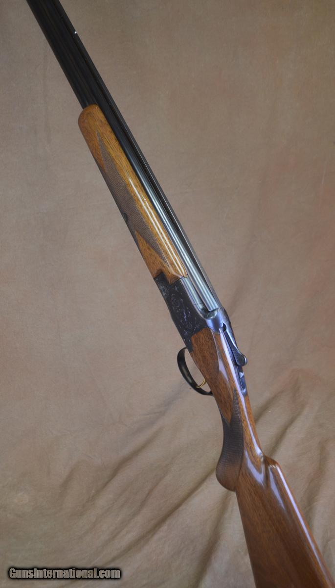 Description: Browning Superposed 28GA Lightning with 28" fixed choke (M/F) barrels. Blued "Lightning" engraved action. Factory round-knob, long tang. Action shows minor bluing wear around tang, sides and bottom of action. Handling marks in stock, some minor peeling of finish. Shortened to 13 7/8". Does not include case. SOLD |